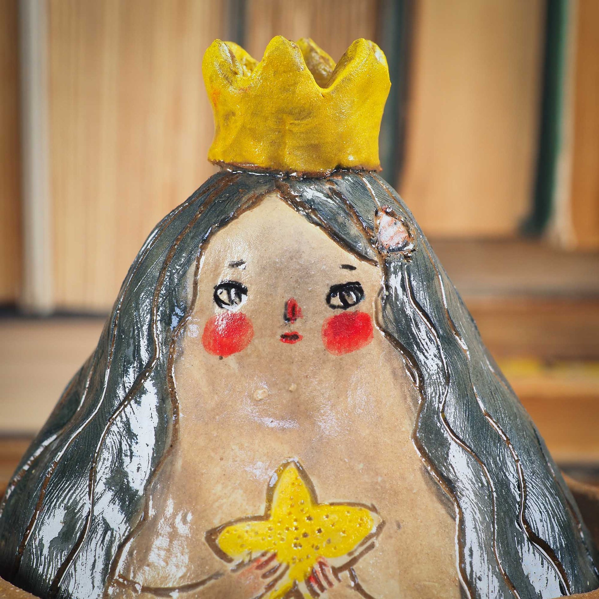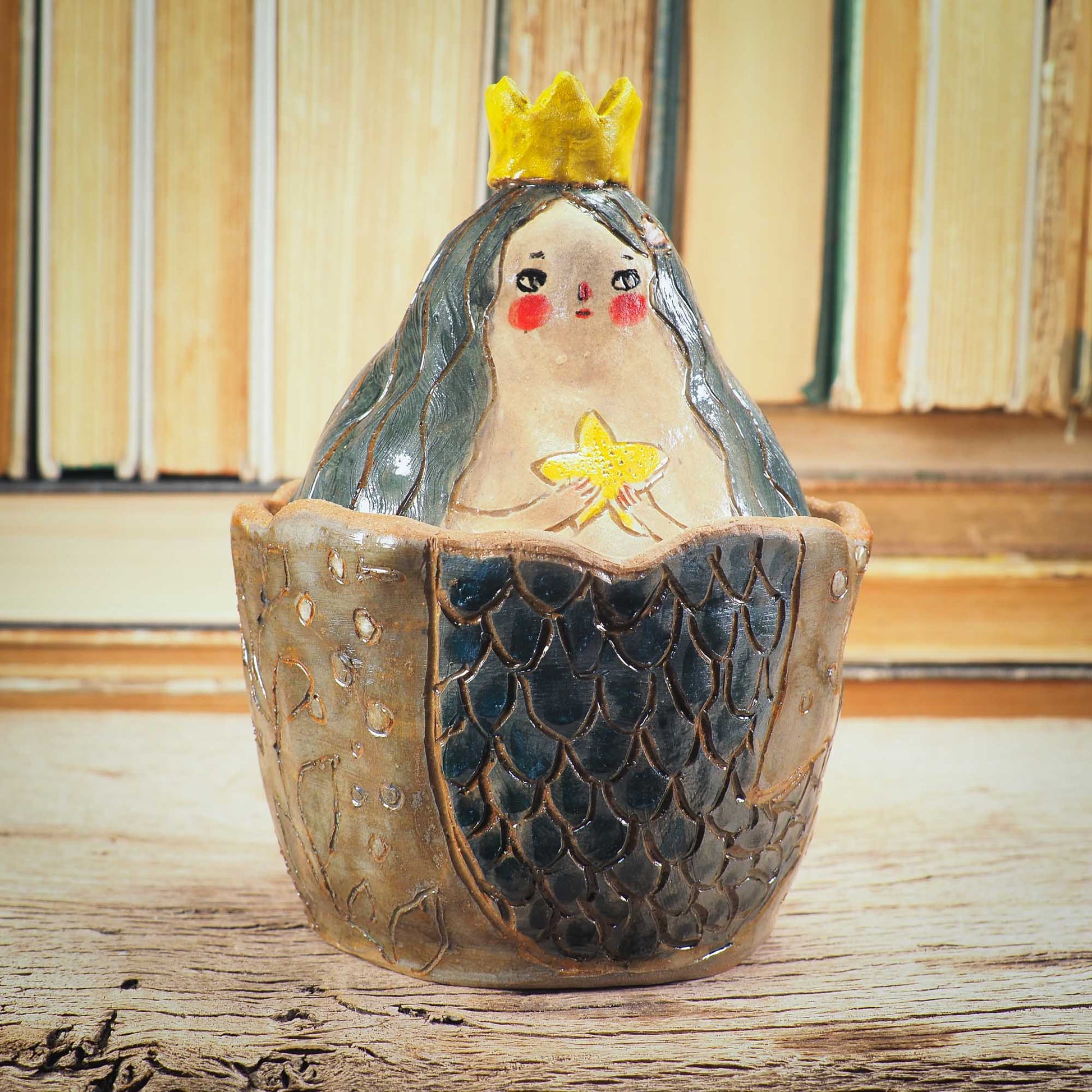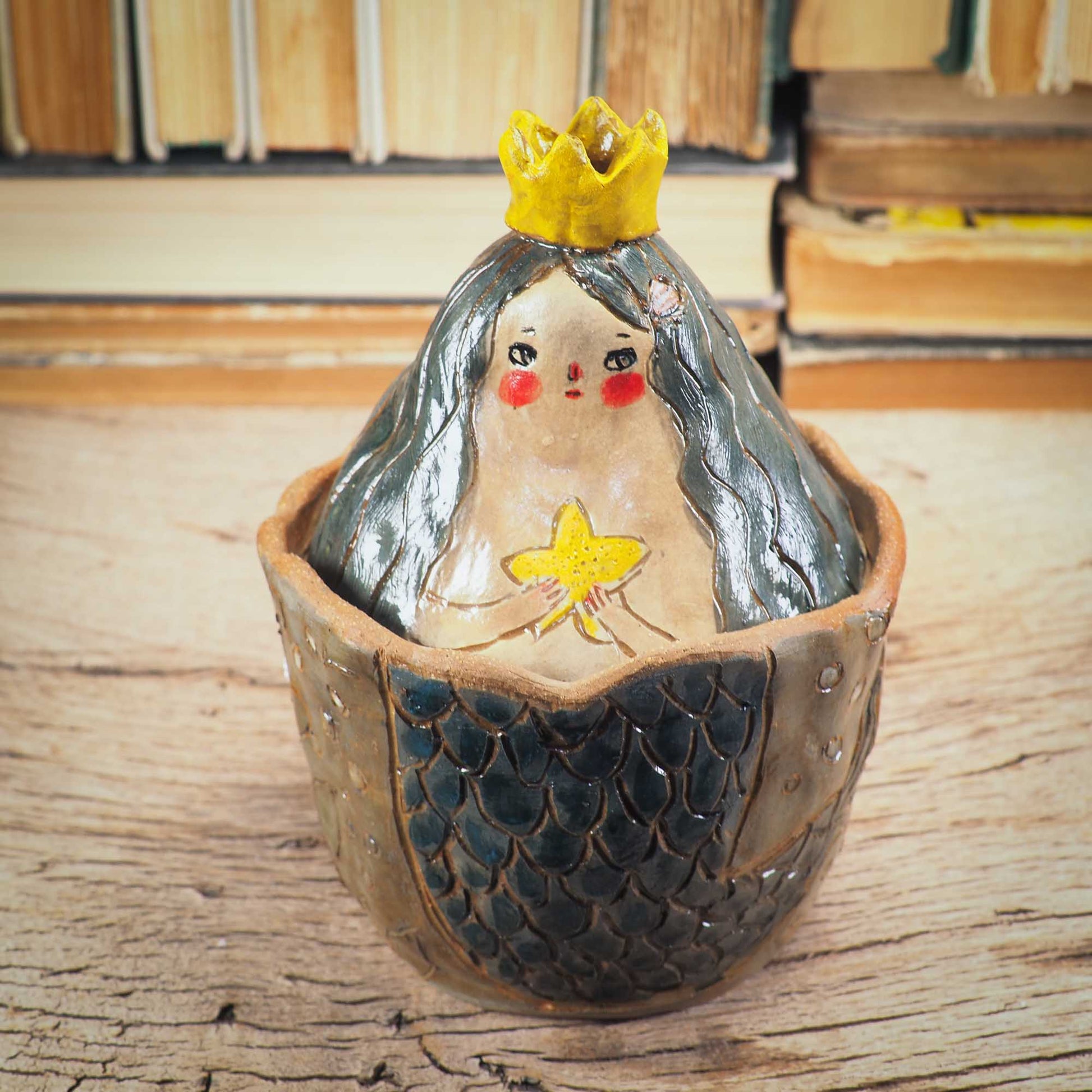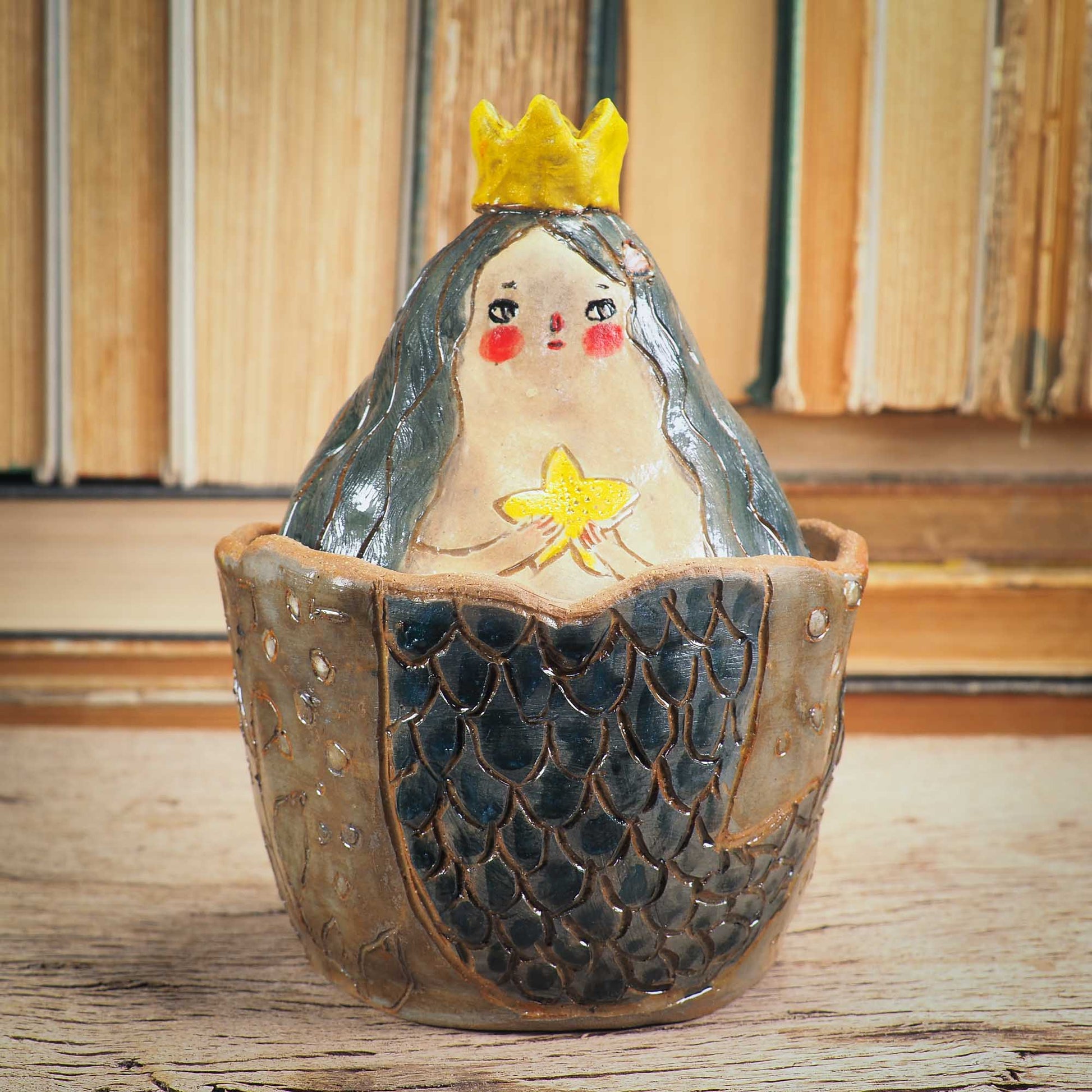 Broomfoam is a curvy mermaid holding a yellow starfish in her hands. She knows that her song will charm you, and you will keep your treasures inside her. She is a beautiful ceramic container, perfect for your most valuable trinkets and treasures. She will not tell anyone what she keeps for you.
