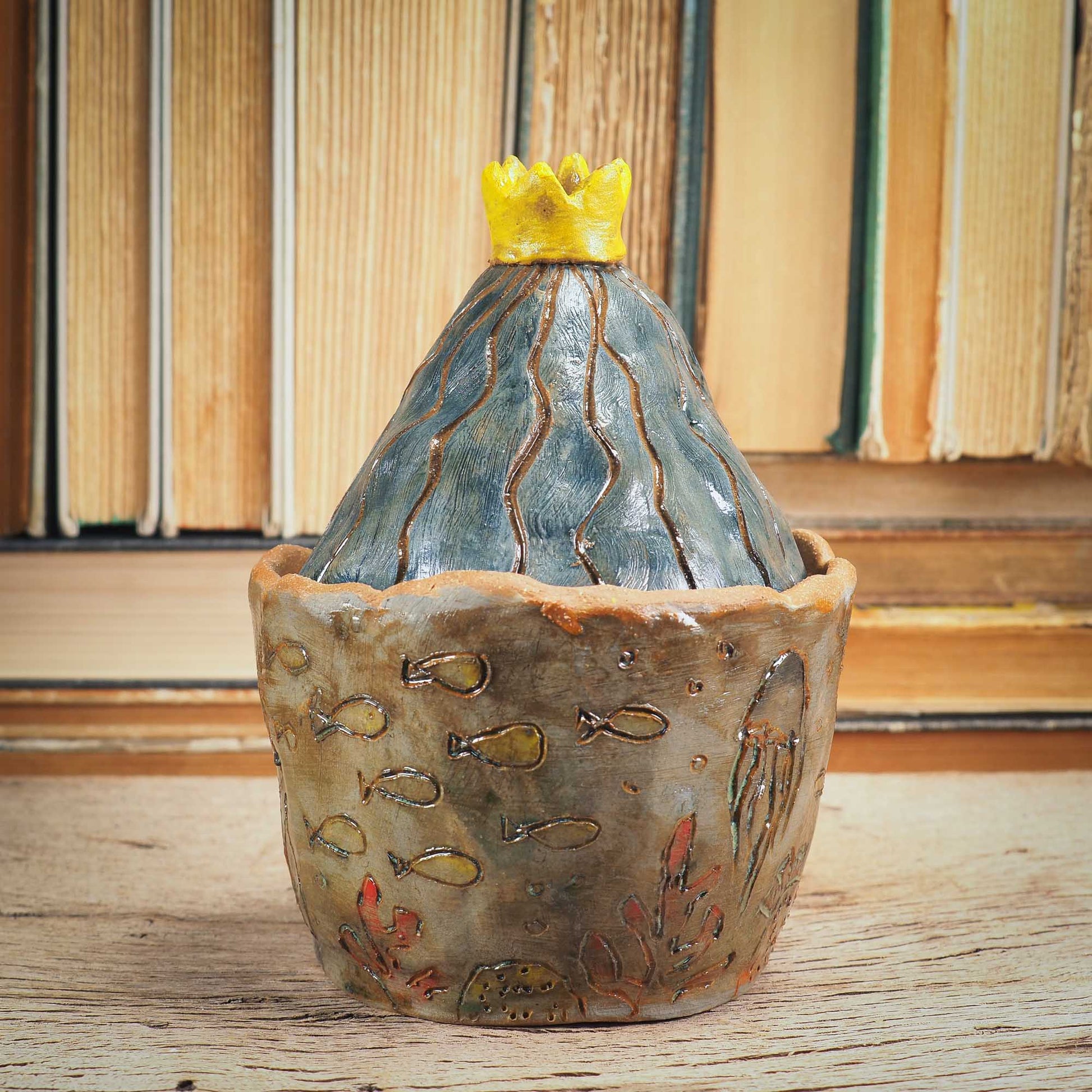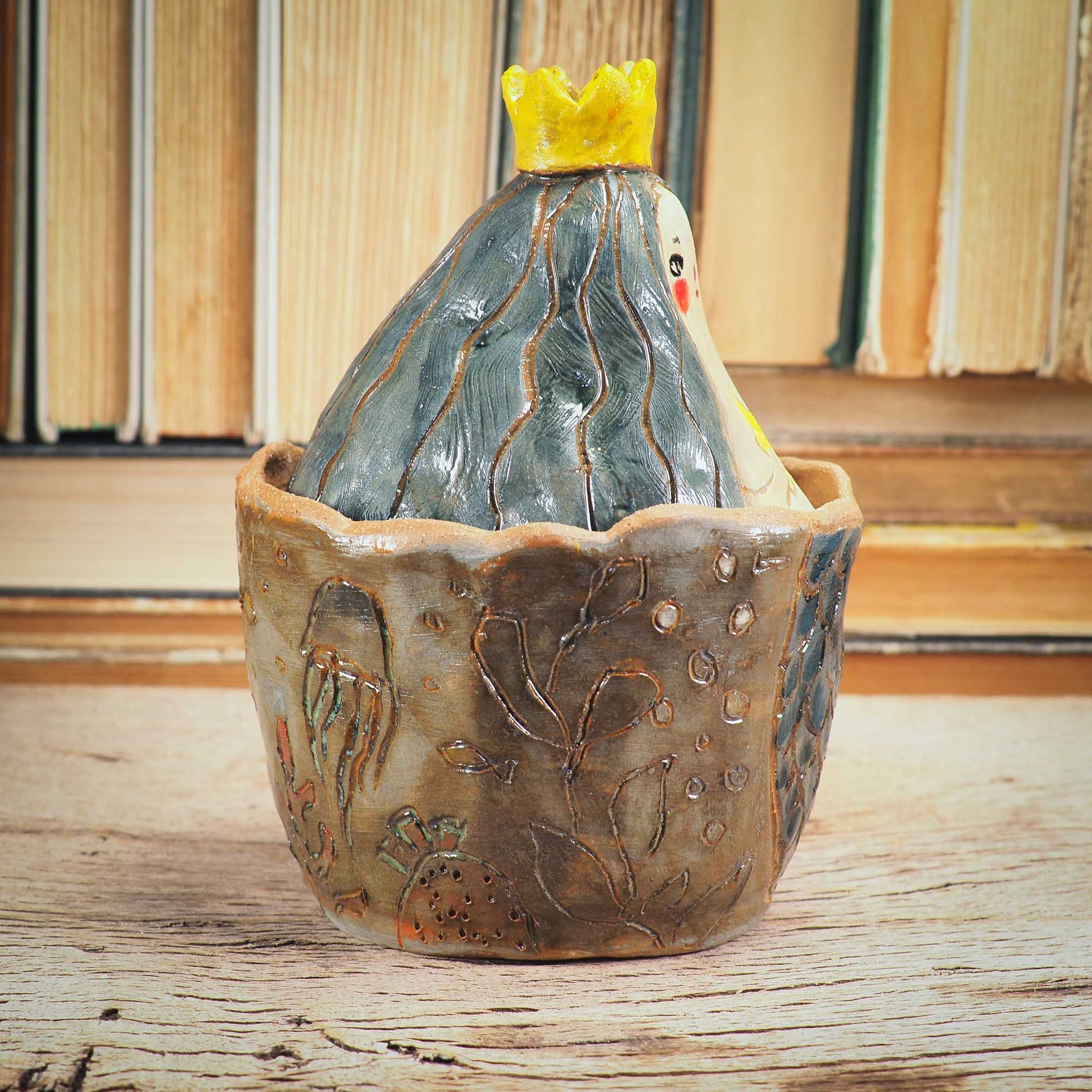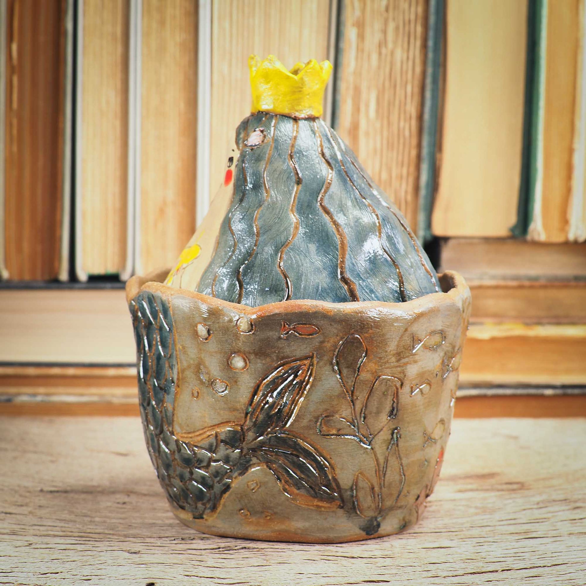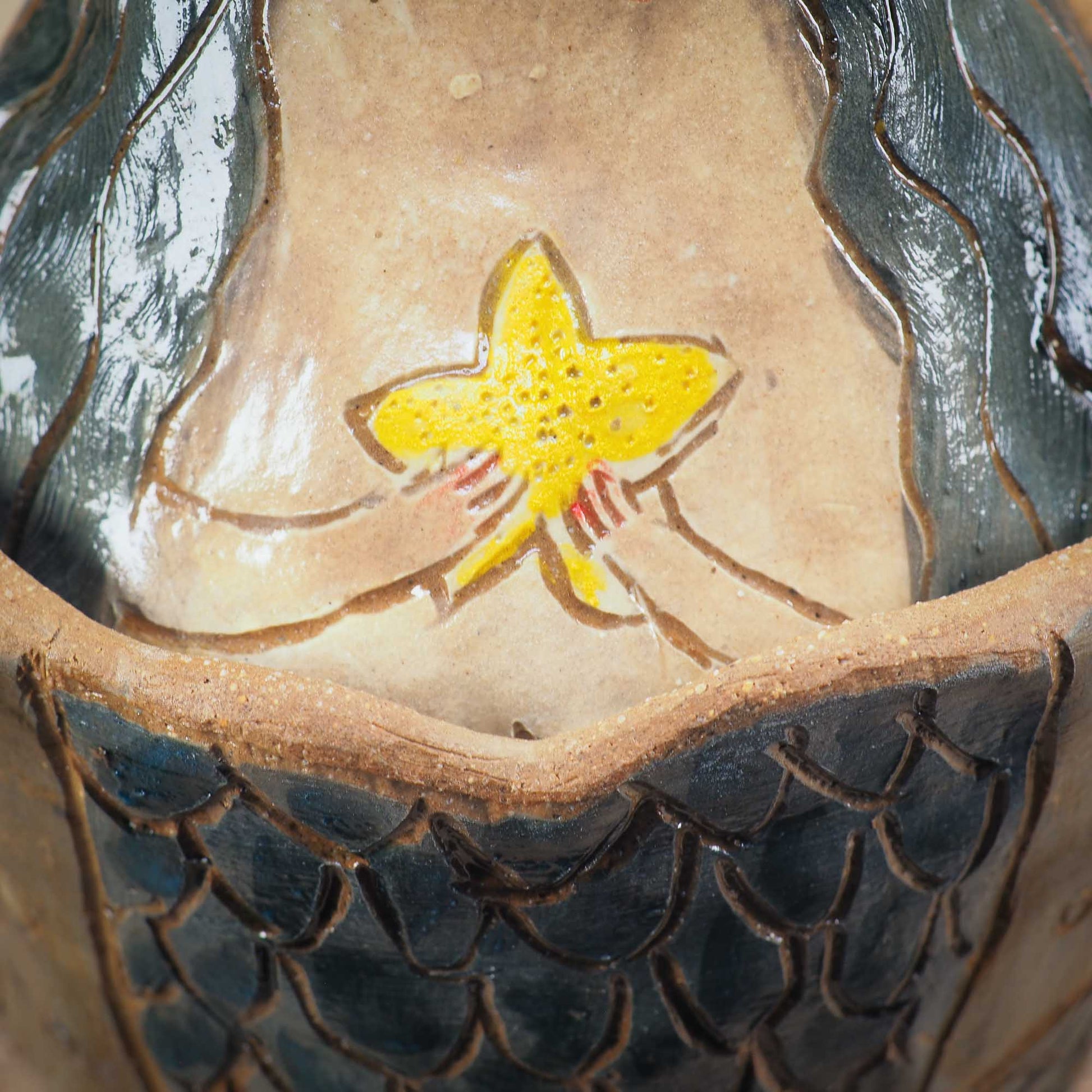 Broomfoam is a curvy mermaid holding a yellow starfish in her hands. She knows that her song will charm you, and you will keep your treasures inside her. She is a beautiful ceramic container, perfect for your most valuable trinkets and treasures. She will not tell anyone what she keeps for you.