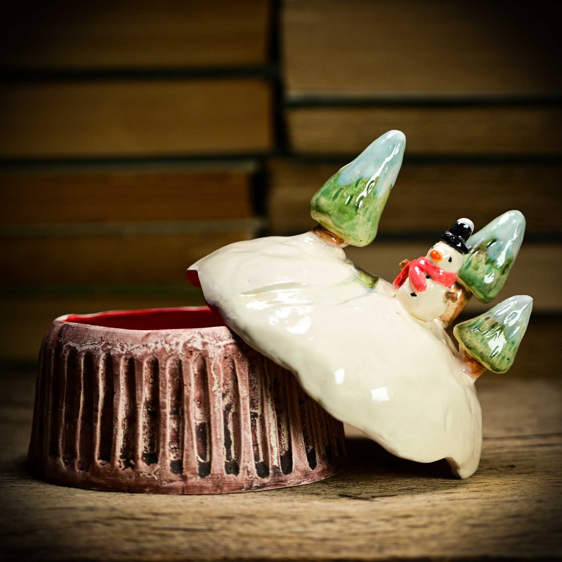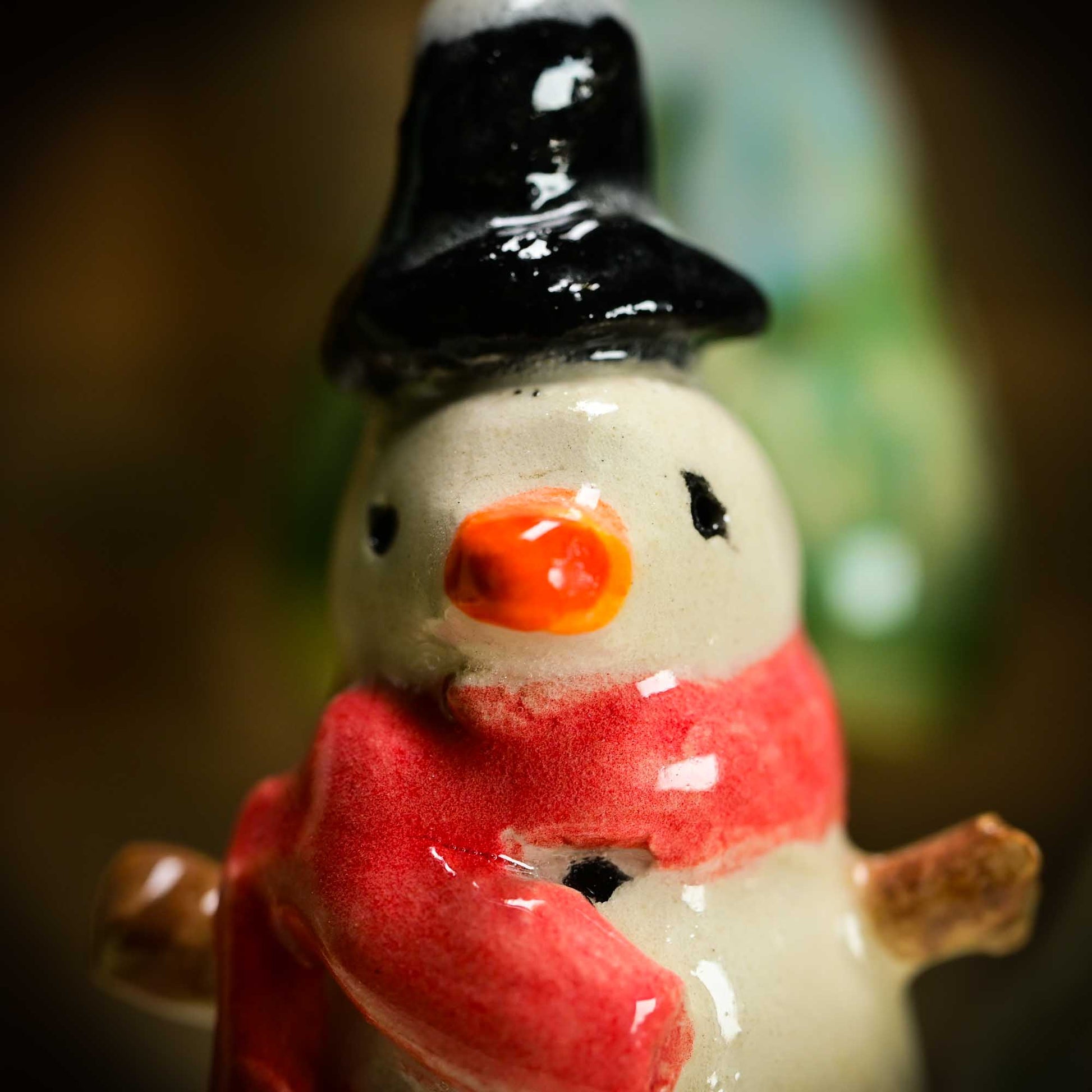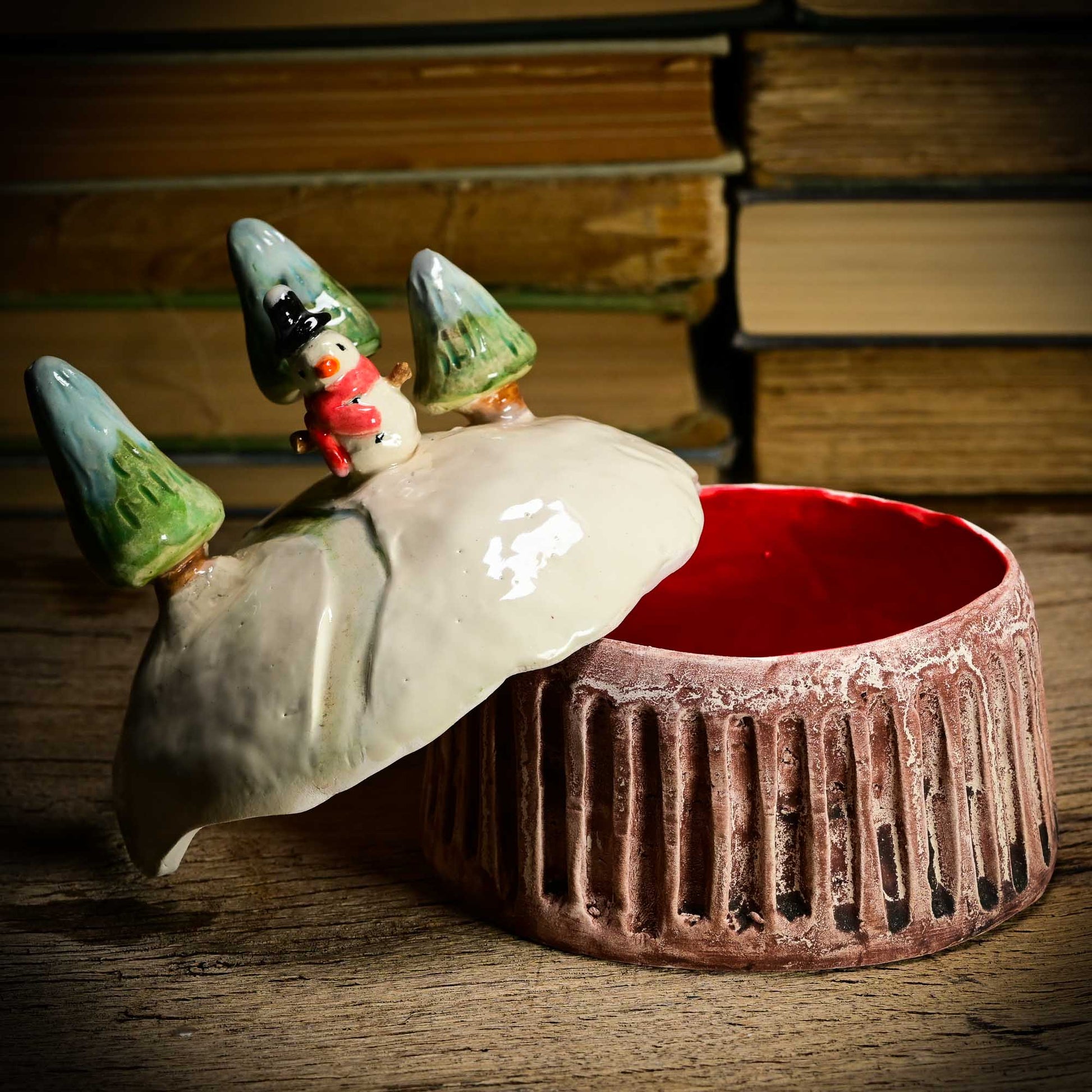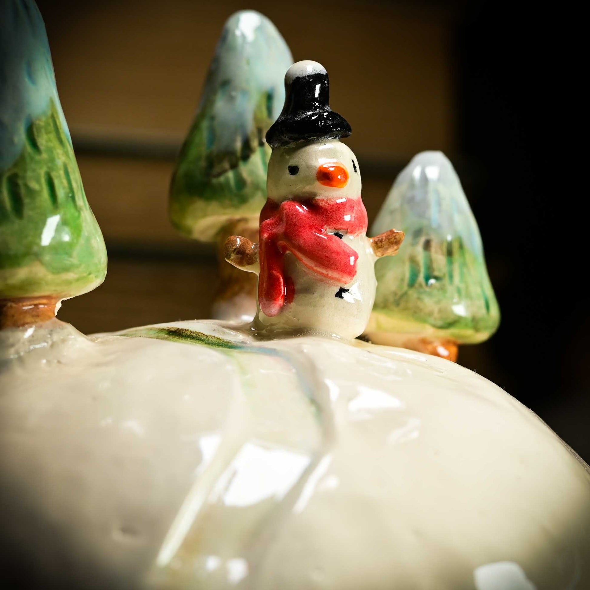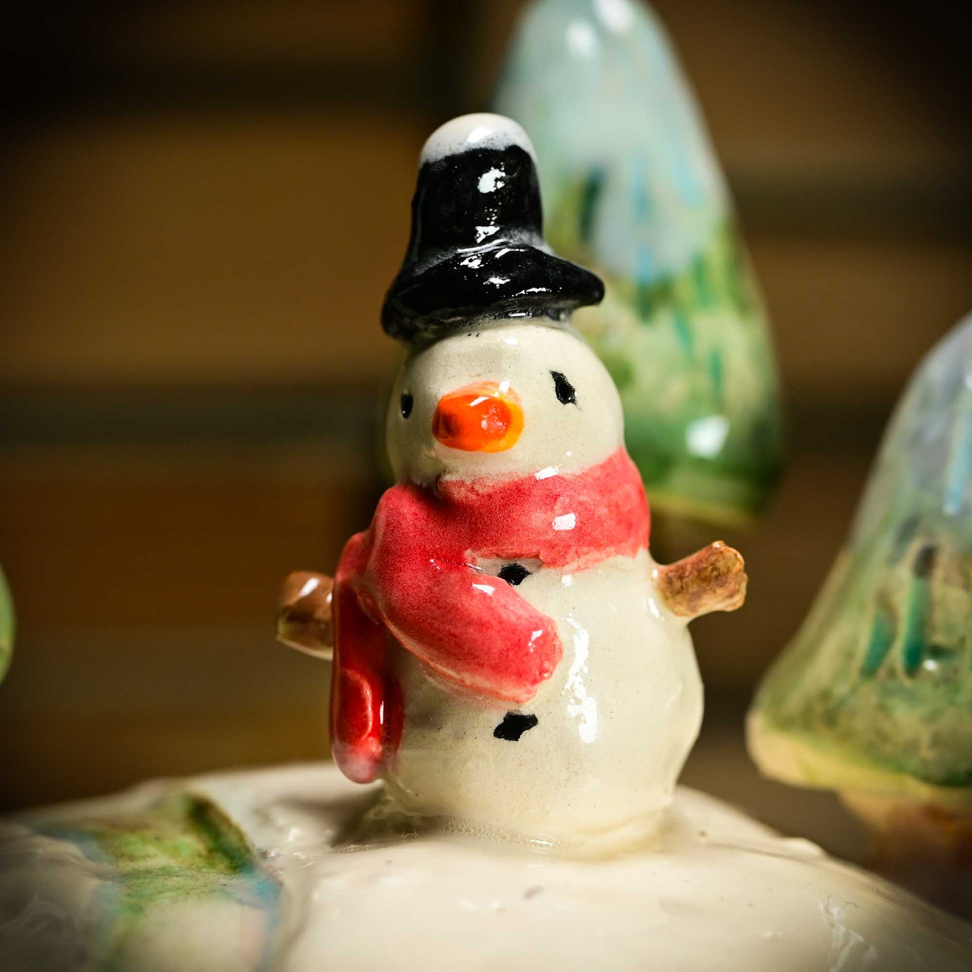I love looking and making tiny things, and these uber cute ceramic containers were perfect to create tiny winter holiday scenes. I gave them snowmen, pine trees, tiny houses and small forest critters that build fires and roam in the ceramic snow of their tiny world.