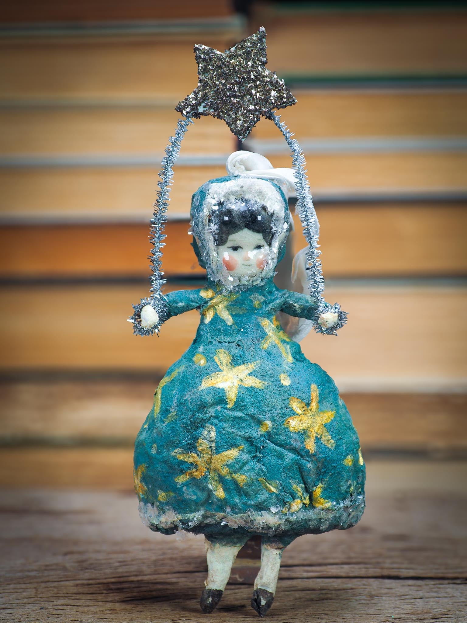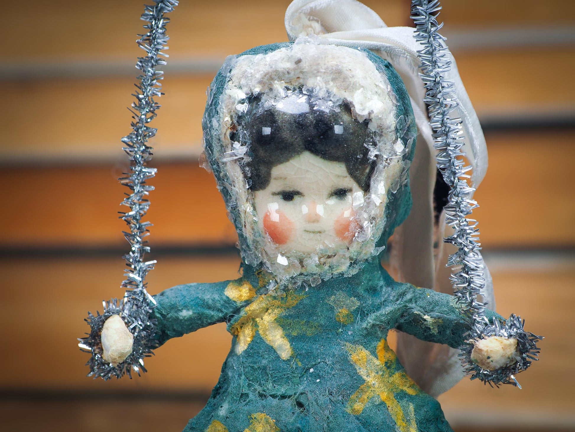 This art doll was made slowly, by hand, using traditional materials and a lot of intention. The body is shaped from spun cotton, light and soft, just like the antique holiday figures that inspired it. Glass glitter and real mica flakes were added by hand, catching the light in a gentle, imperfect way. Nothing here is meant to sparkle loudly. Instead, it glows quietly, like frost in early morning light.