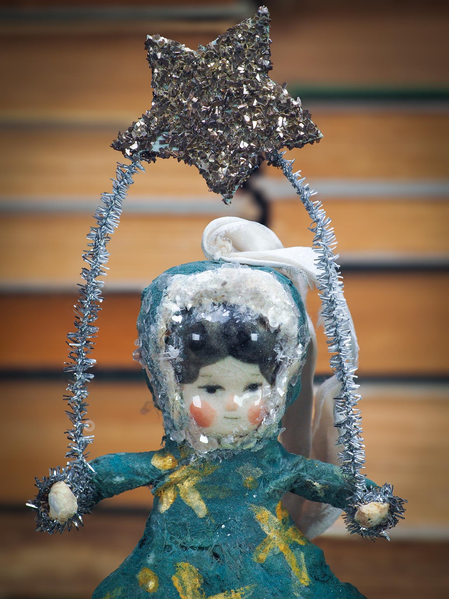The figure feels part angel, part guardian. The small face is calm and watchful, framed by a hooded silhouette, while the wings shimmer softly with layers of glass glitter and mica. The gold accents and star above its head give it a ceremonial presence, almost as if it were carrying a wish, a prayer, or a promise into the coming year.