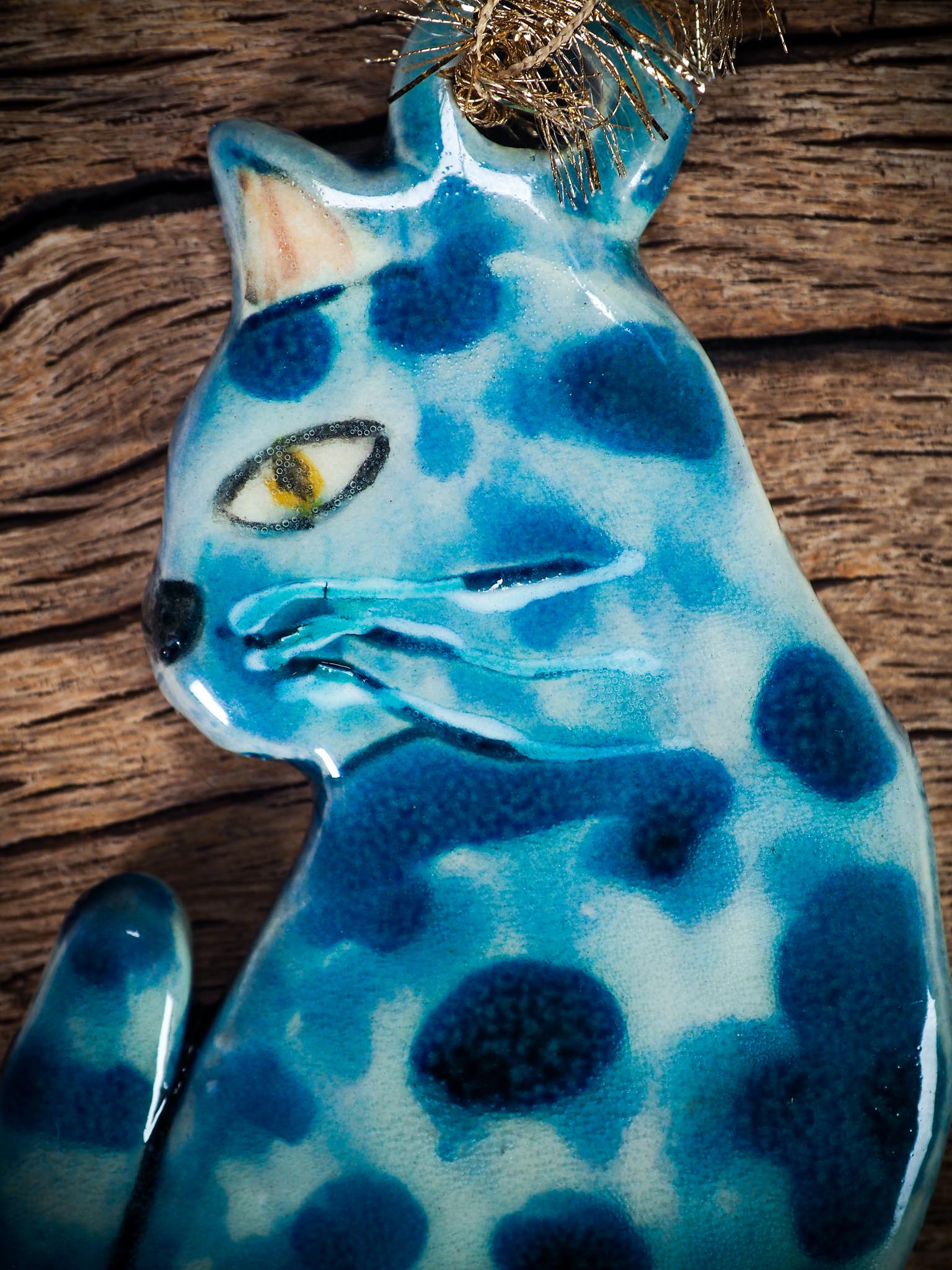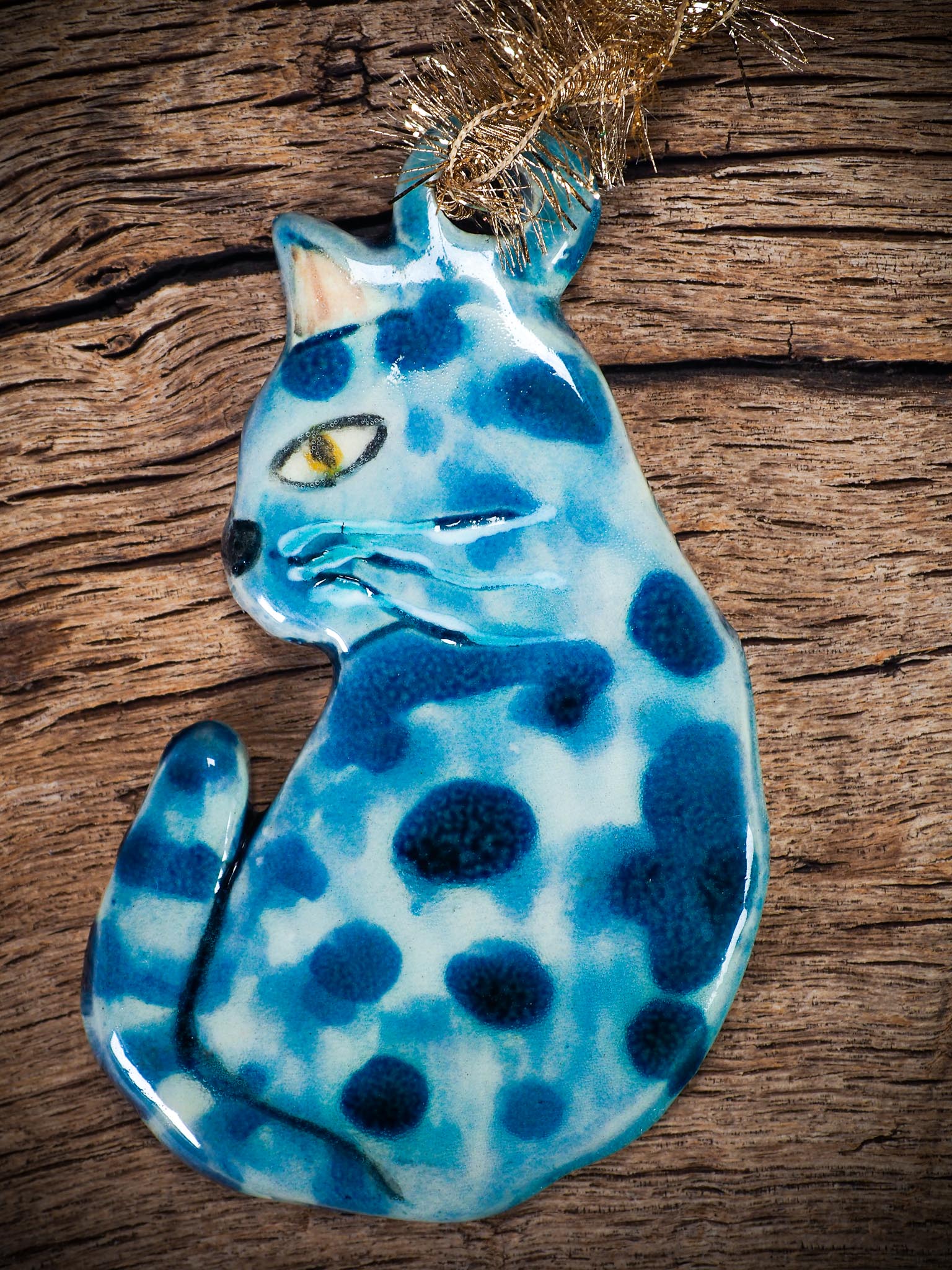This ceramic blue cat ornament has a graceful, quiet charm that makes it stand out immediately on a holiday tree. I shape each one by hand in my studio and glaze it with layered blues that create soft variations in color and texture. The pose, the tail curled gently at the side, and the painted whiskers give it a calm, watchful look that feels peaceful and elegant.