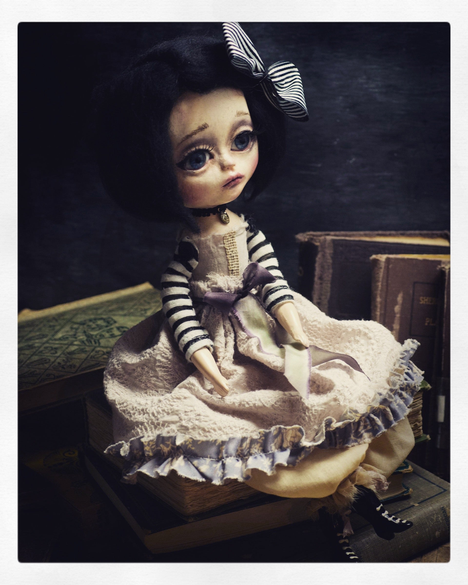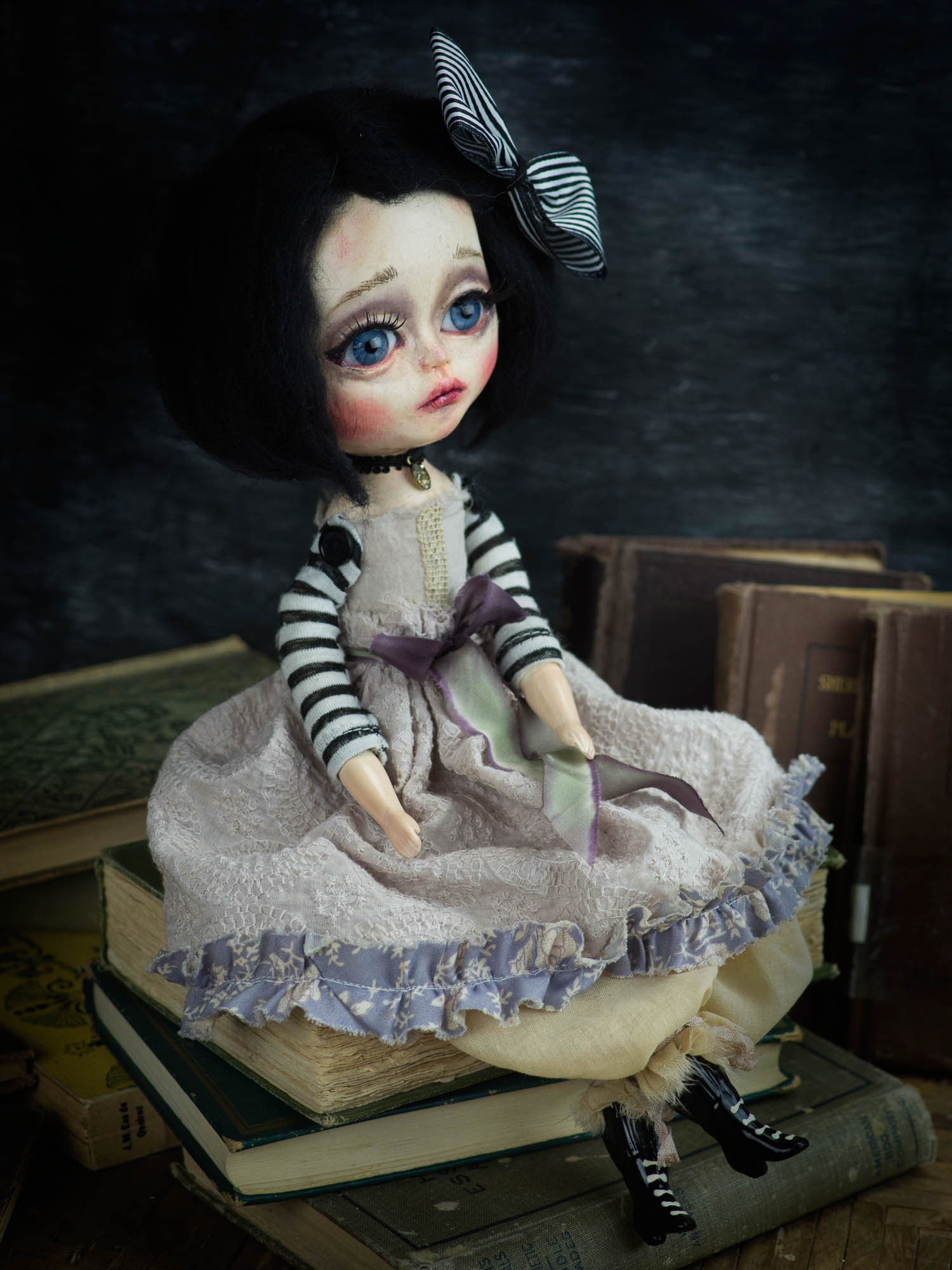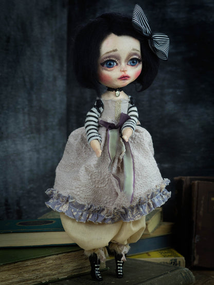 Danita creates beautiful handmade art dolls with her skilled hands, and this girl with bright, big blue eyes is no exception. Her melancholic look and the bohemian setting where she was born are a perfect combination.