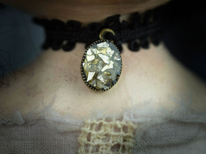 She is wearing a handmade dress with a beautiful knitted pattern in circles and flowers. In her neck she wears a choker with golden flakes, also handmade by Danita.