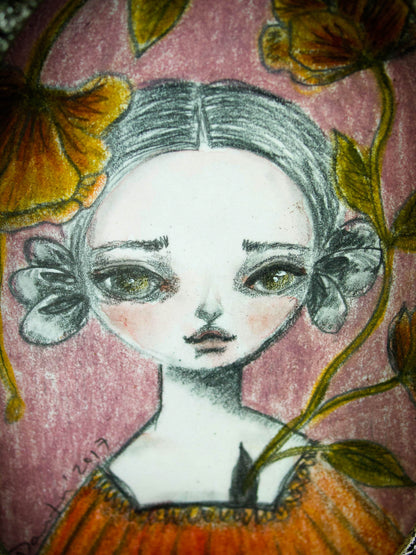 You are looking at a mixed media pencil drawing and watercolor painting by Danita Art. It's a beautiful mix of materials in a surreal image where vines grow from the heart of a beautiful green eyed girl.