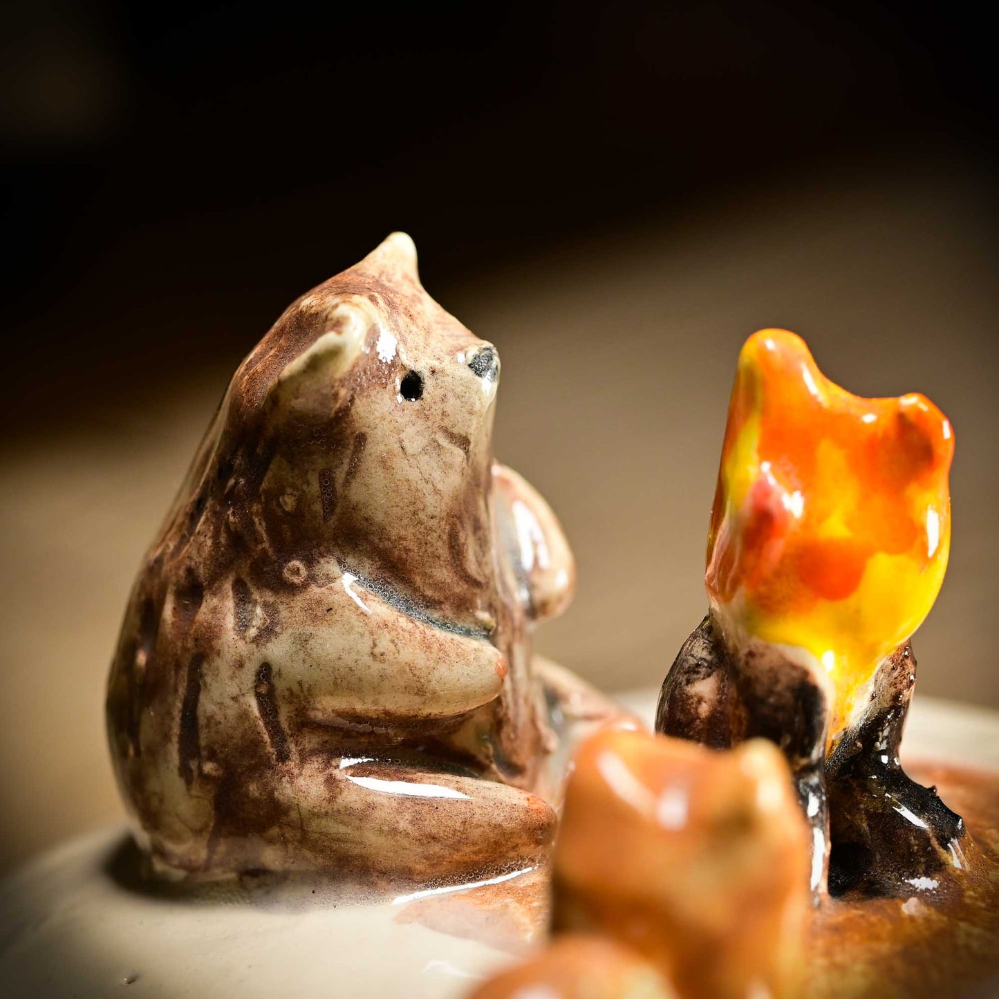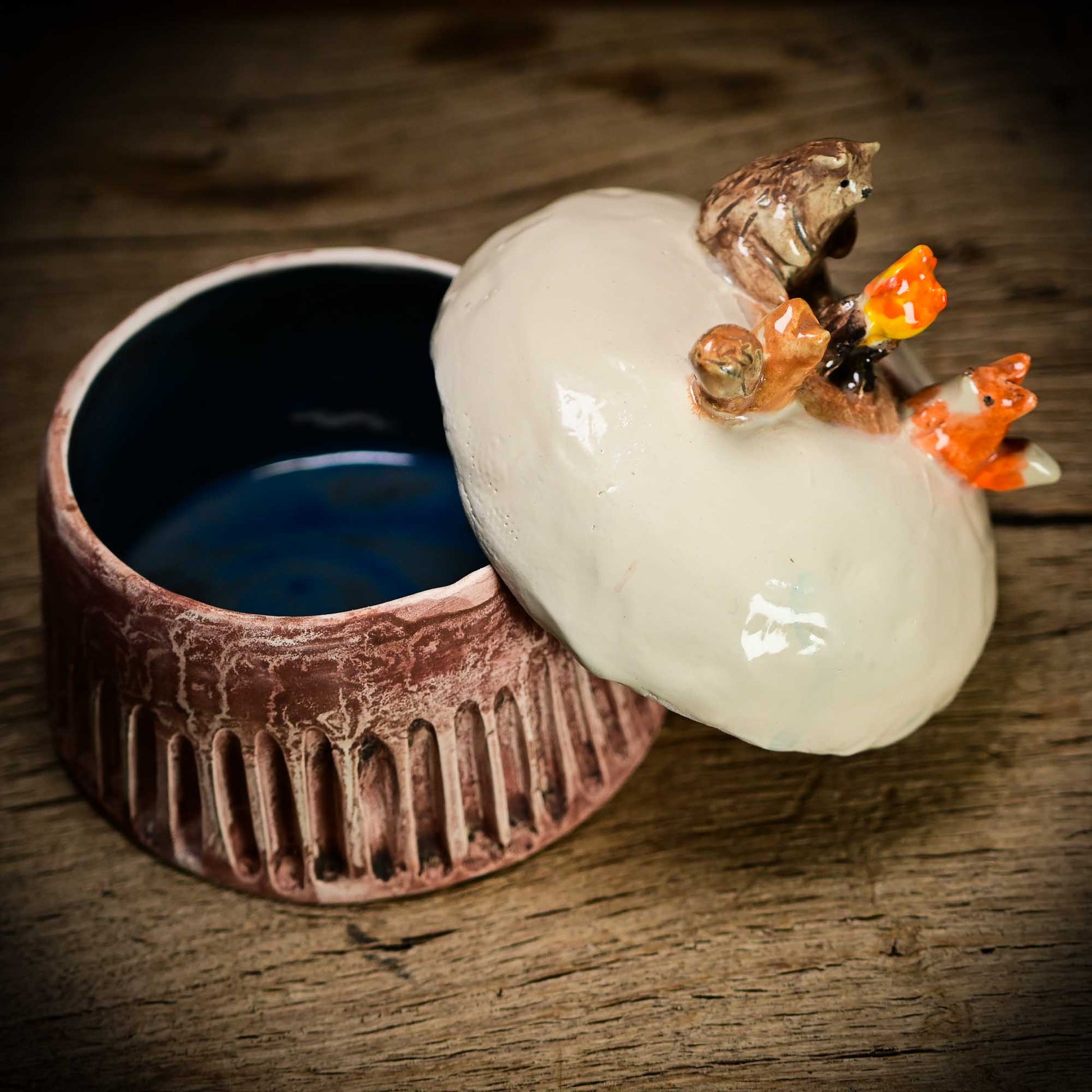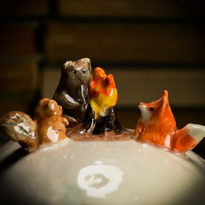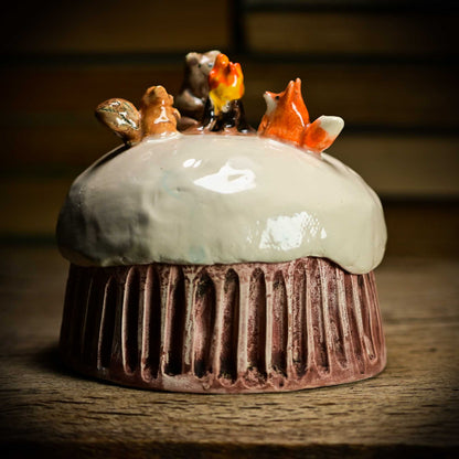 I love looking and making tiny things, and these uber cute ceramic containers were perfect to create tiny winter holiday scenes. I gave them snowmen, pine trees, tiny houses and small forest critters that build fires and roam in the ceramic snow of their tiny world.
