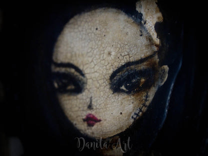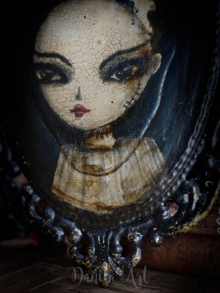this mixed media painting was made on a metallic setting, created with an alchemy of oils, acrylics, pastels, pencils, pigments and a finishing cracked patina that gives it a very shabby and old look to it.