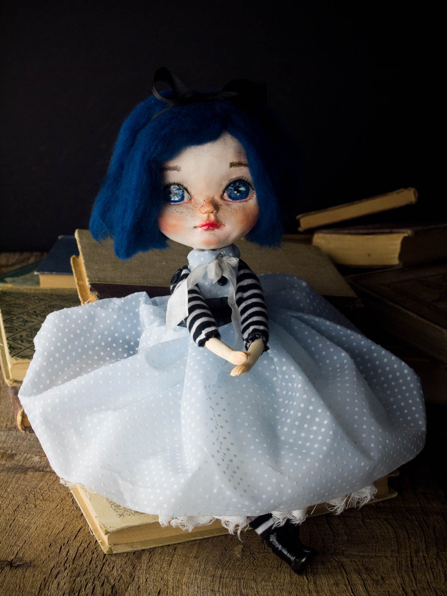 This time, Alice has blue hear and a beautiful polka dot handmade dress, with striped sleeves and matching socks.