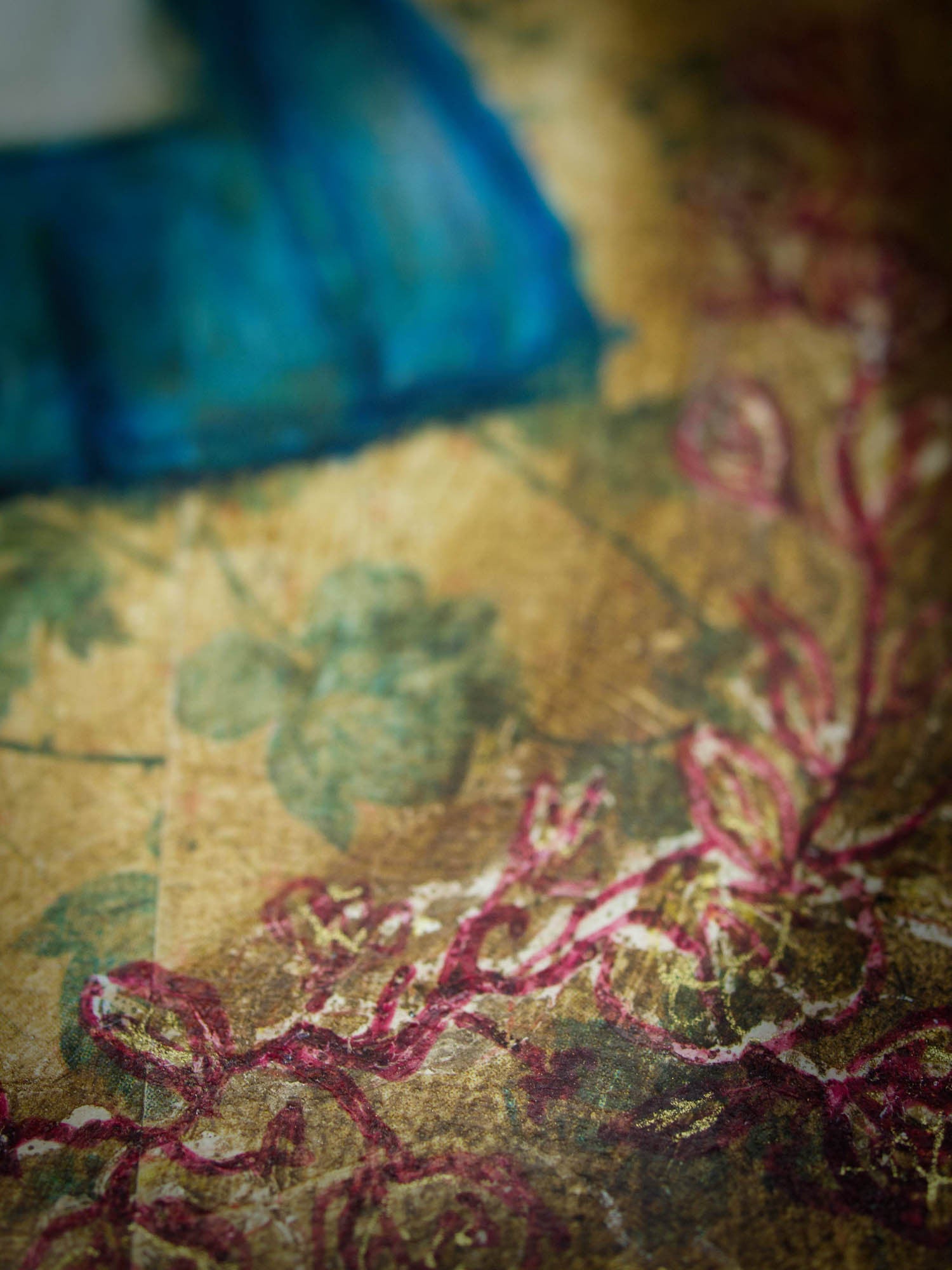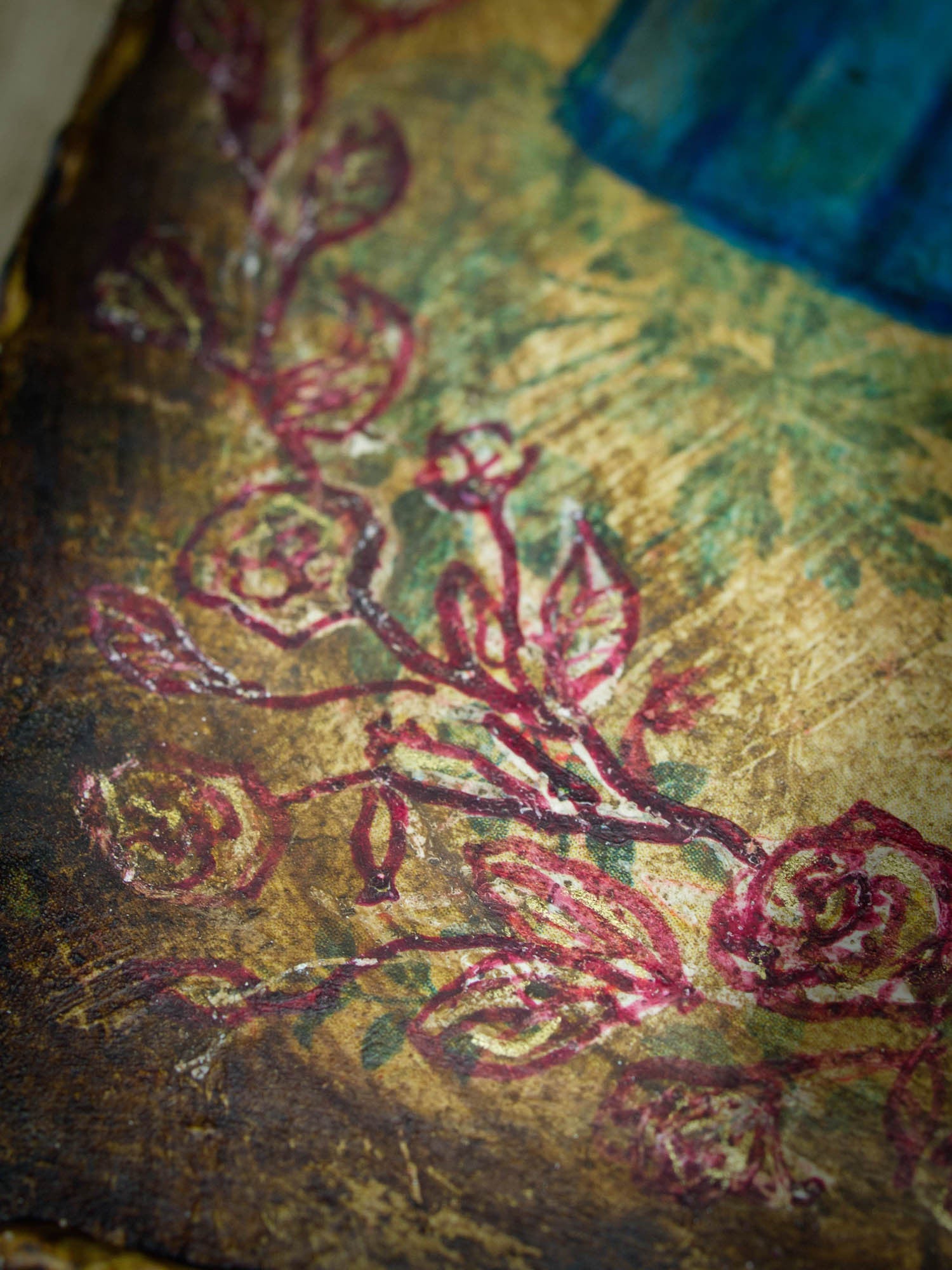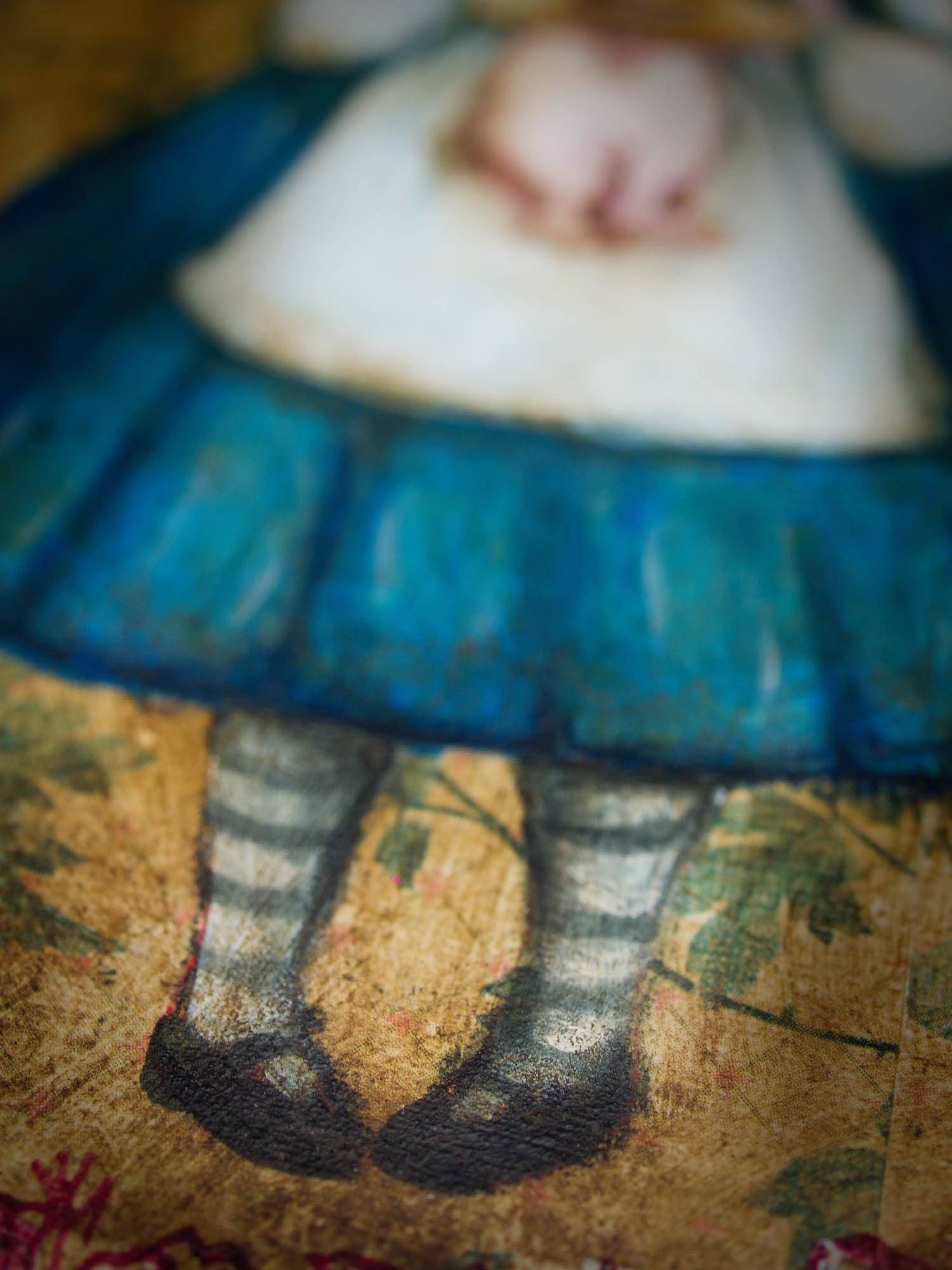 This original painting by Danita Art was created using beautiful mixed media techniques with paper collage, acrylic and oil paints, pastels, charcoals and colored pencils over a wooden panel to create a beautiful pop surreal artwork with everyone's favorite, Alice in wonderland.