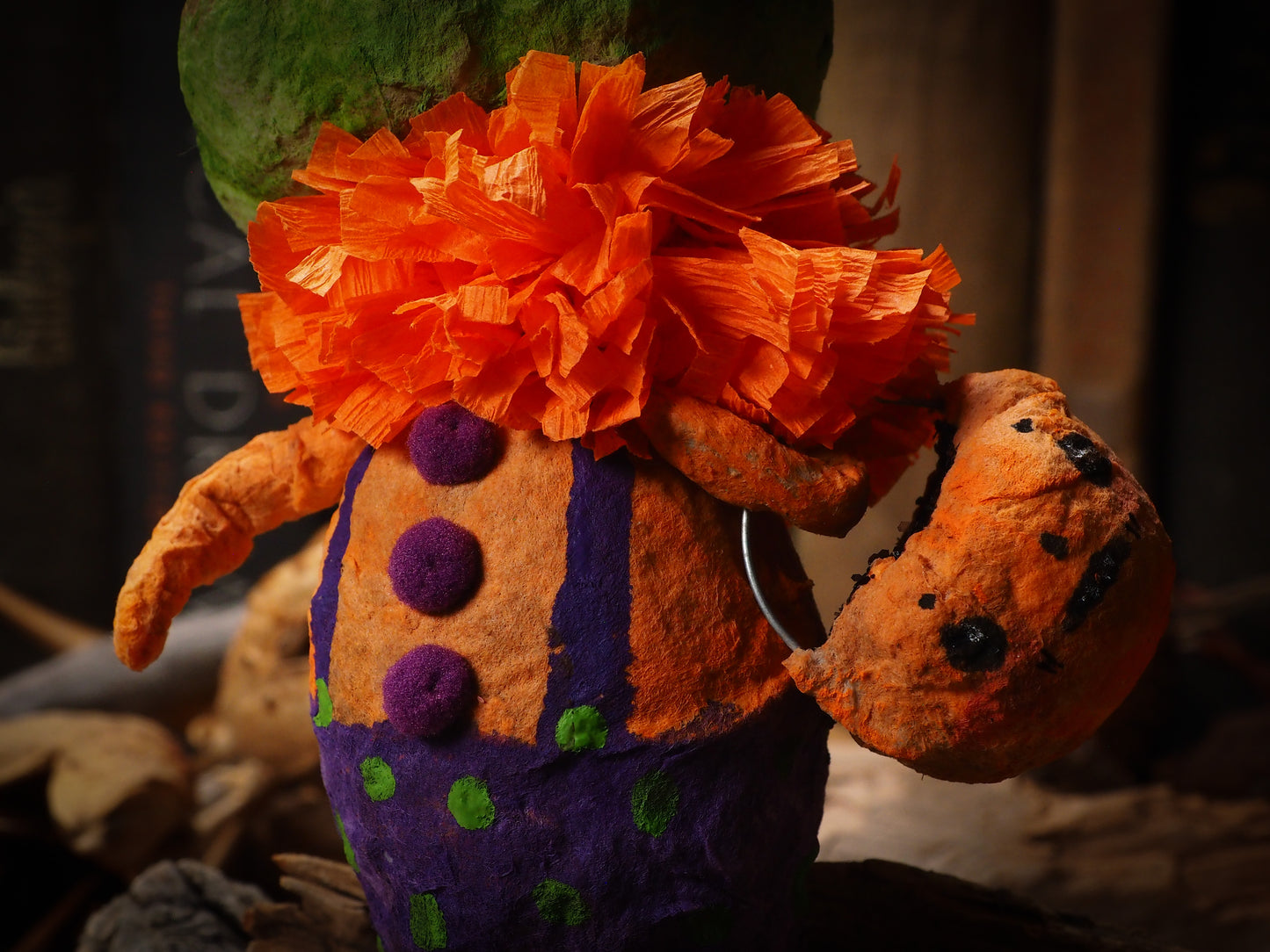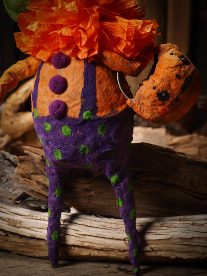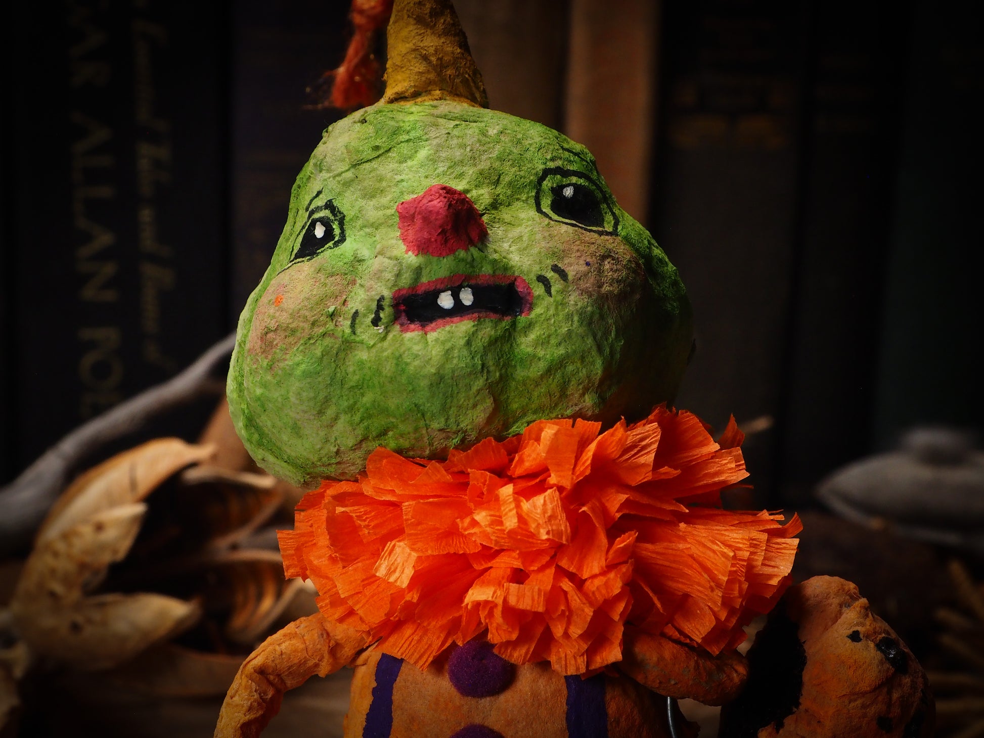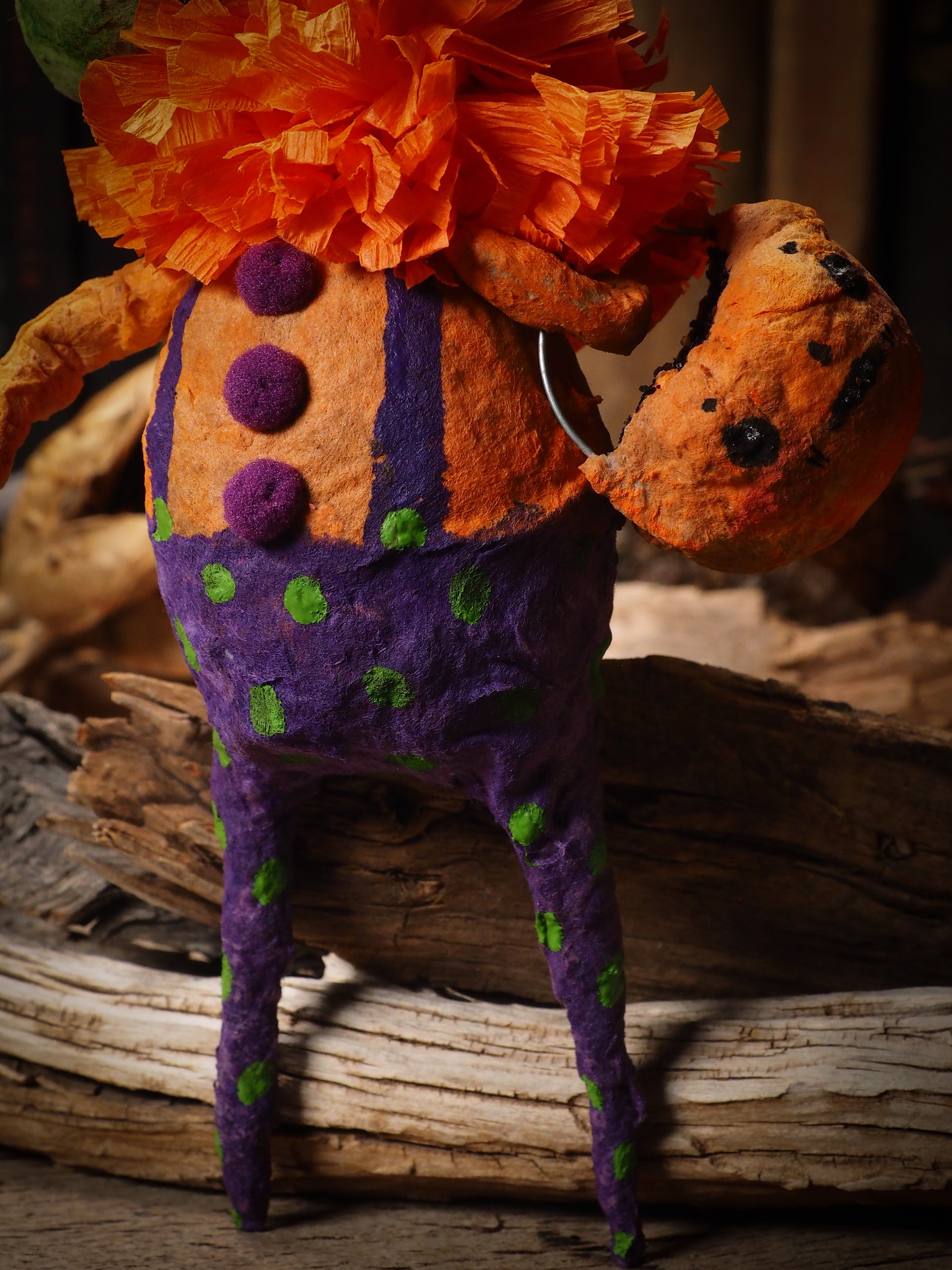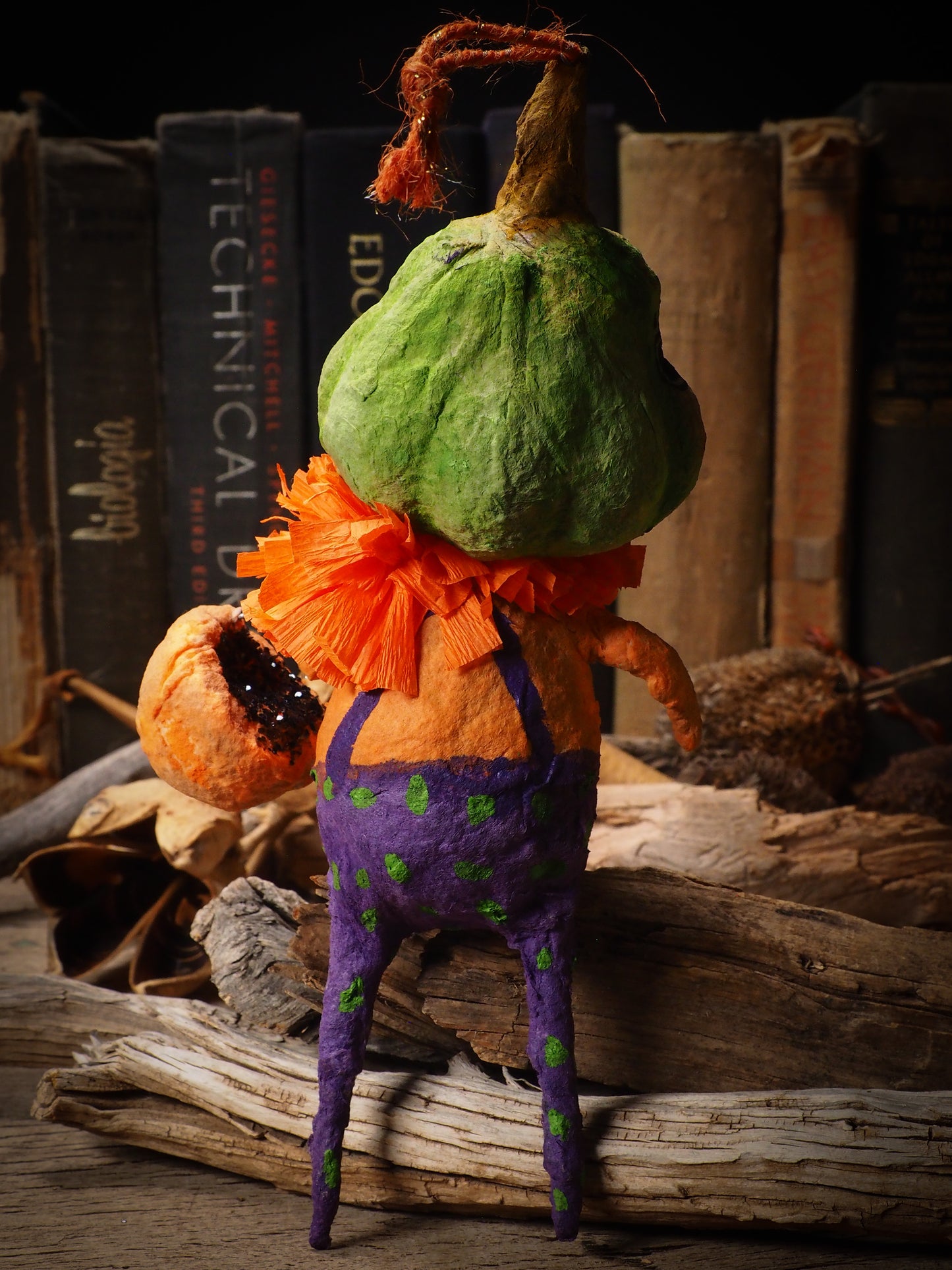 The Halloween art doll has a jack-o-lantern on it's hand and it can be displayed sitting on a shelf, or hanging as an ornament from your Halloween or Christmas tree.