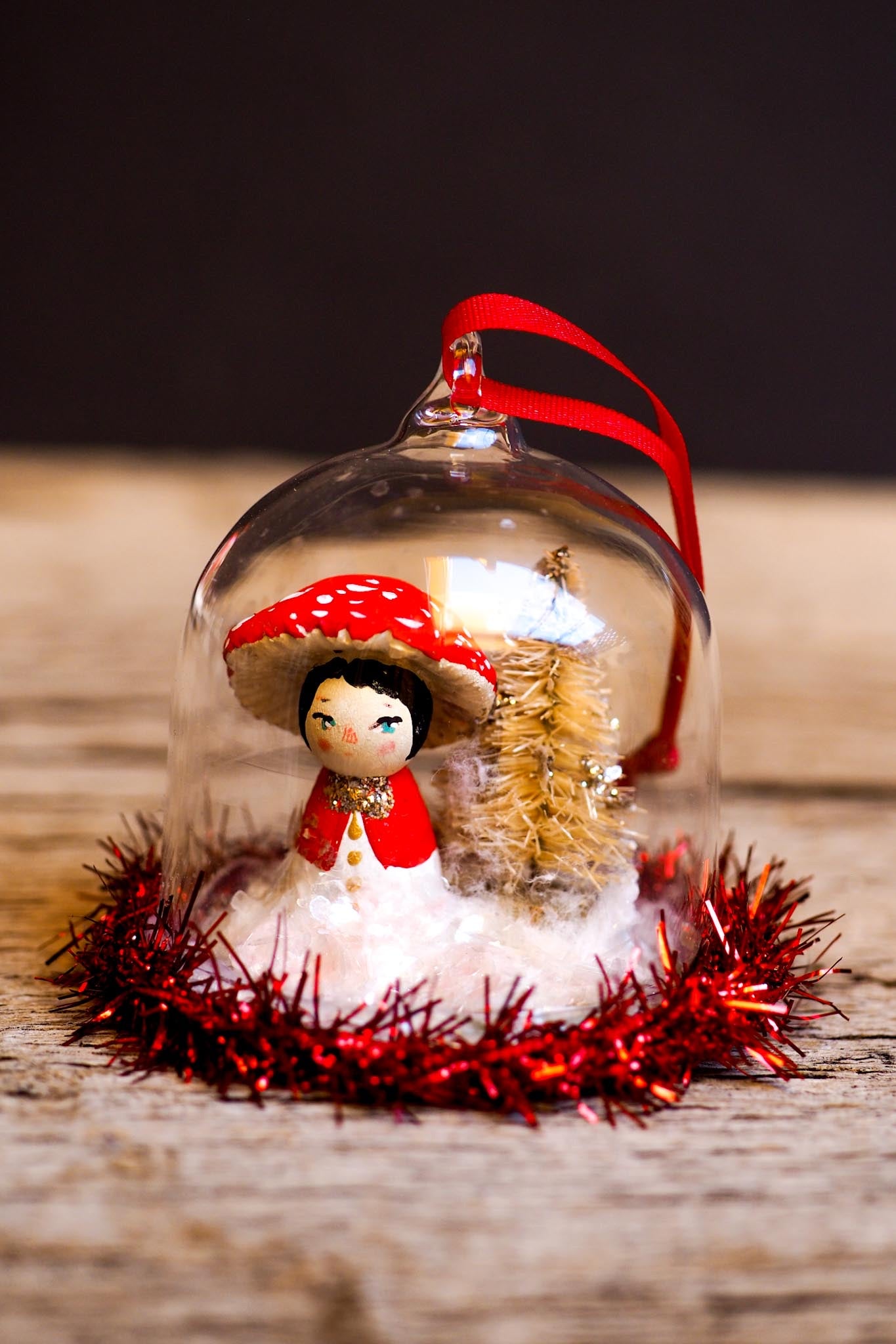 This little series of mini kokeshi dolls is extremely cute! Tiny tiny art dolls that live inside a clear dome that can be placed on your Christmas tree as ornaments or on your dinner table as accents, or maybe on your showcase where they will be displayed all year long!
