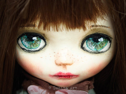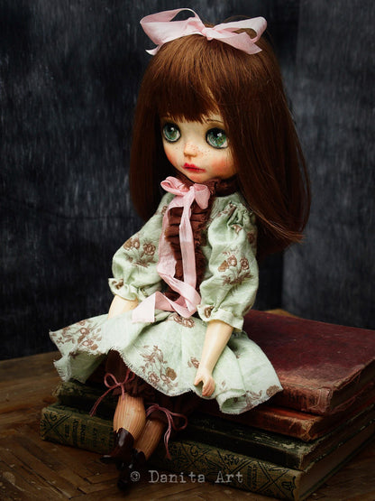 The clothes she is wearing are completely designed and sewn by me from original patters I design. I love the combination of green and brown and the texture of her dress. She is girly, but she is also ready for adventure at a moment's notice.