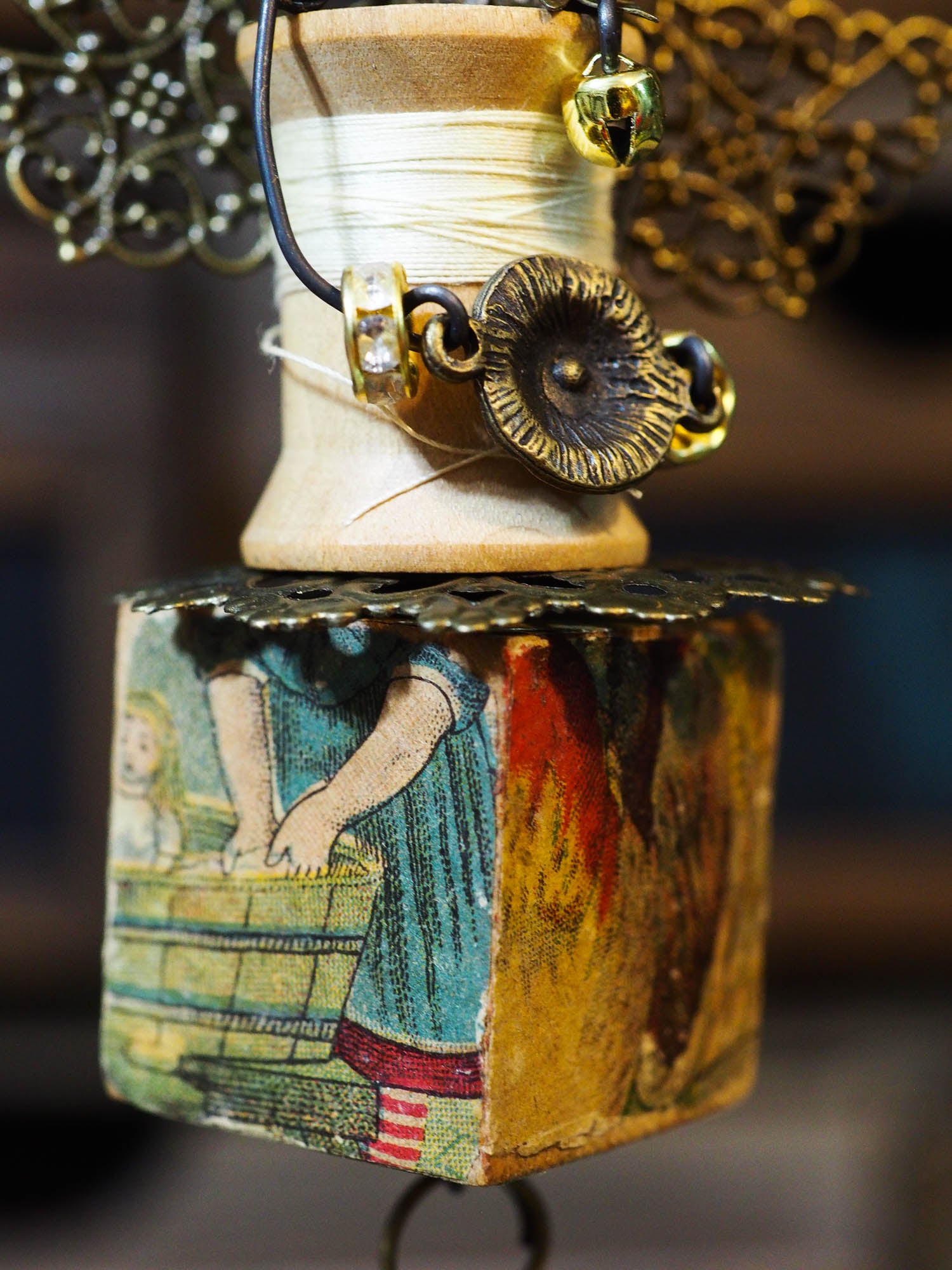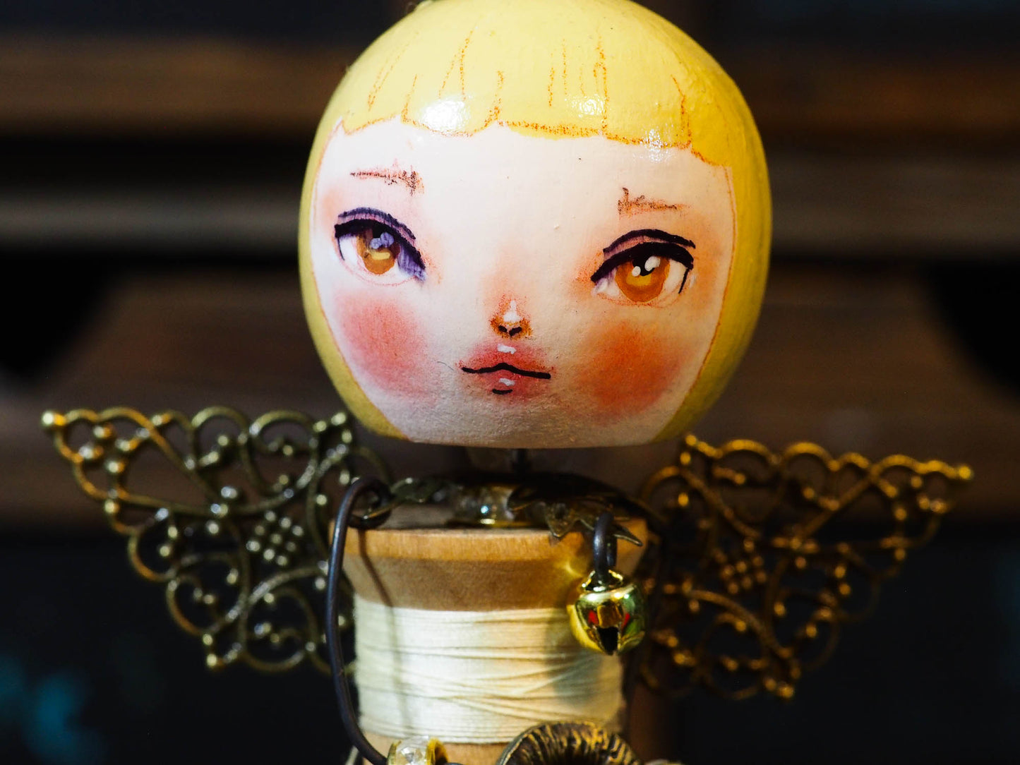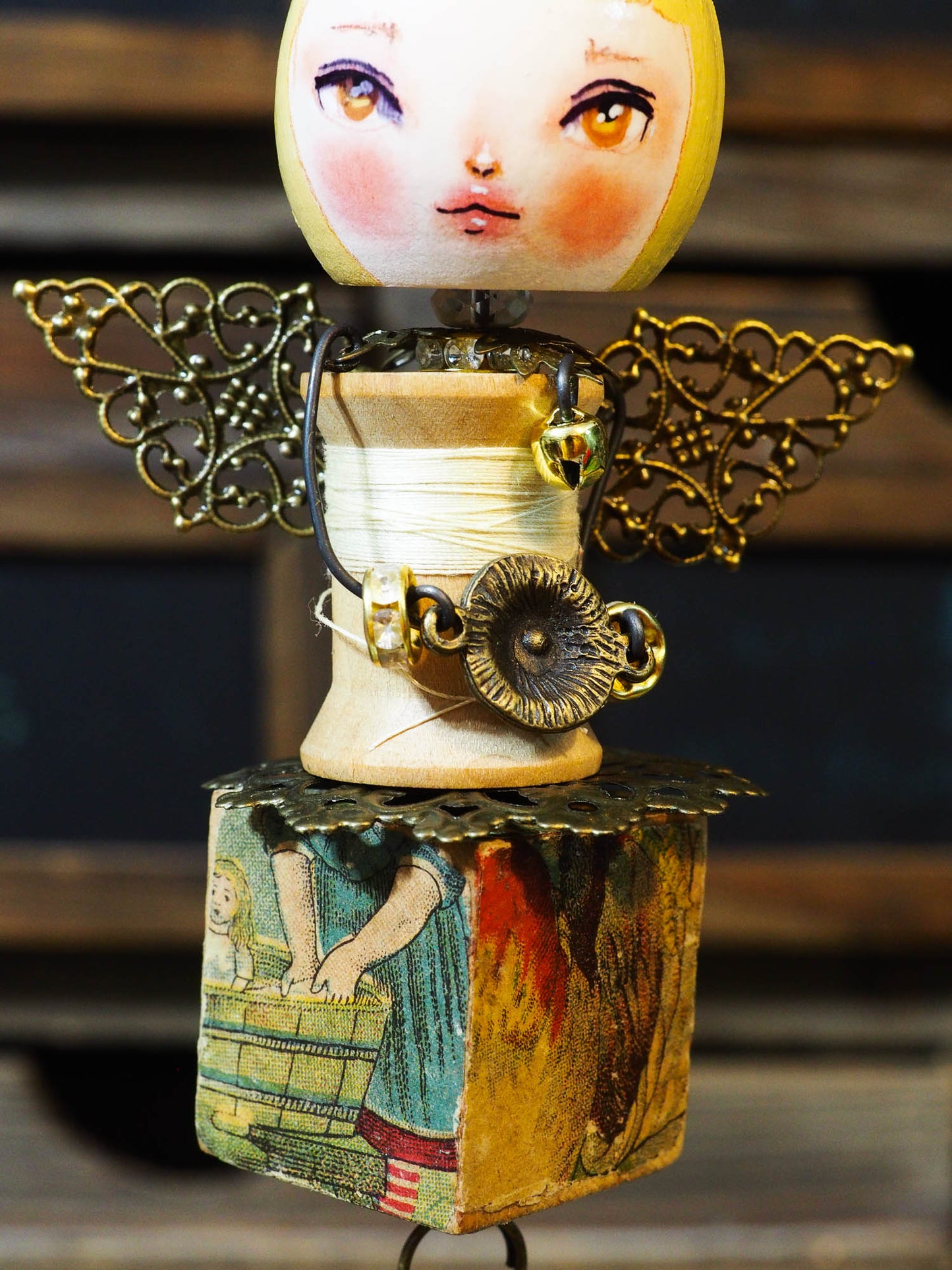 They are Danita originals, made with a lot of love, and random found vintage objects. Their heads are hand painted by me with my signature melancholic eyes that will charm you on first sight.