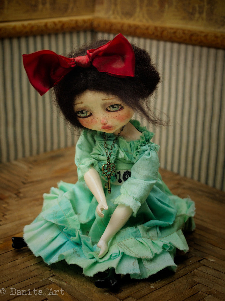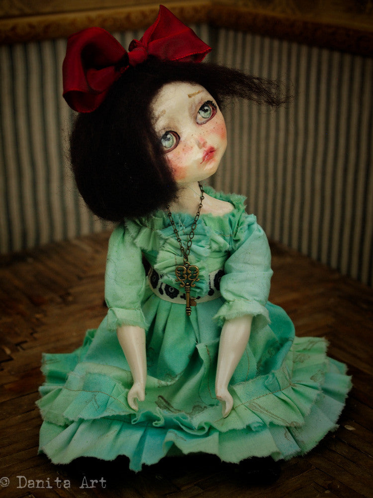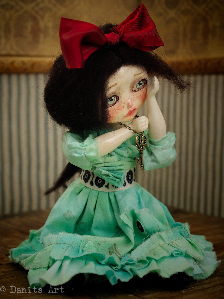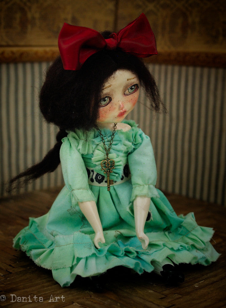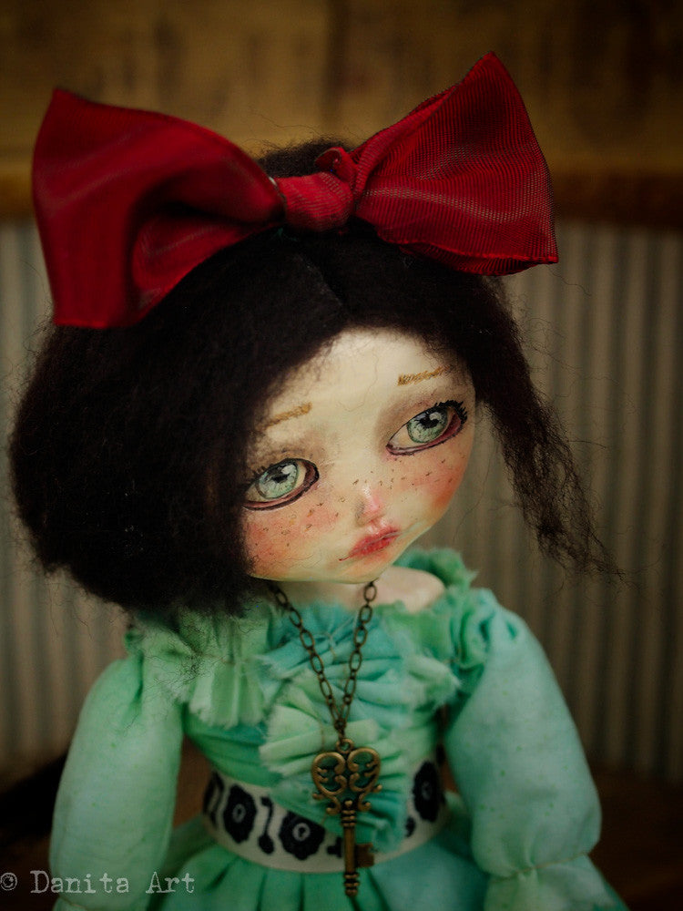 Around her neck is a metallic key in antique brass patina that you can place in her hand. Her hair is made of wool and can be braided or left to your personal styling, she has a red bow topping her head too.