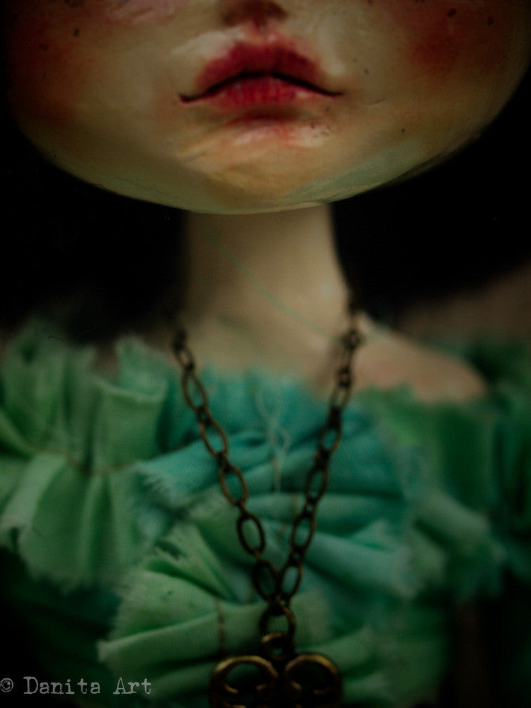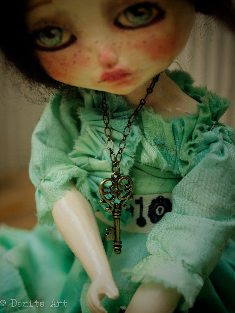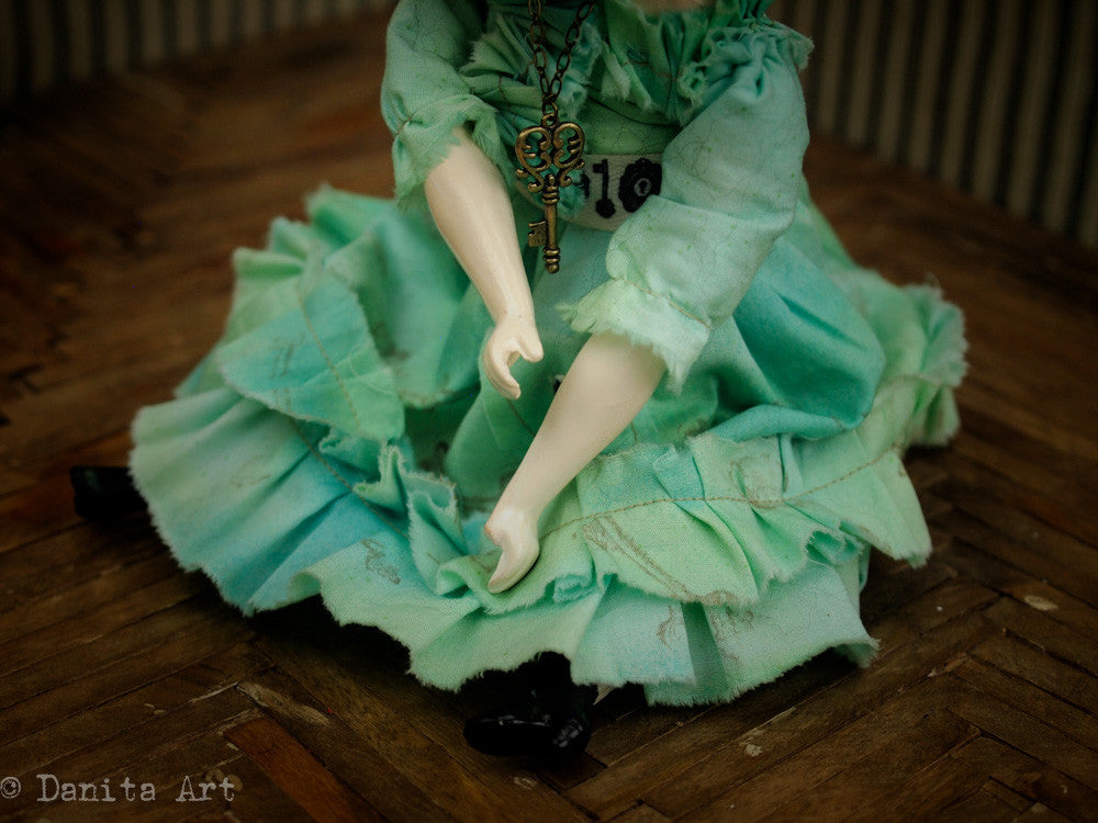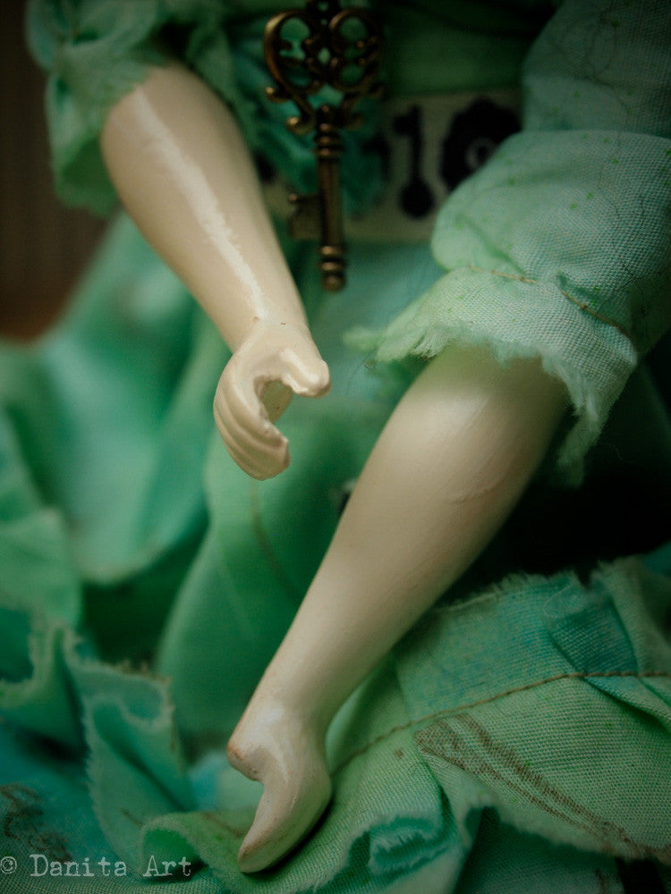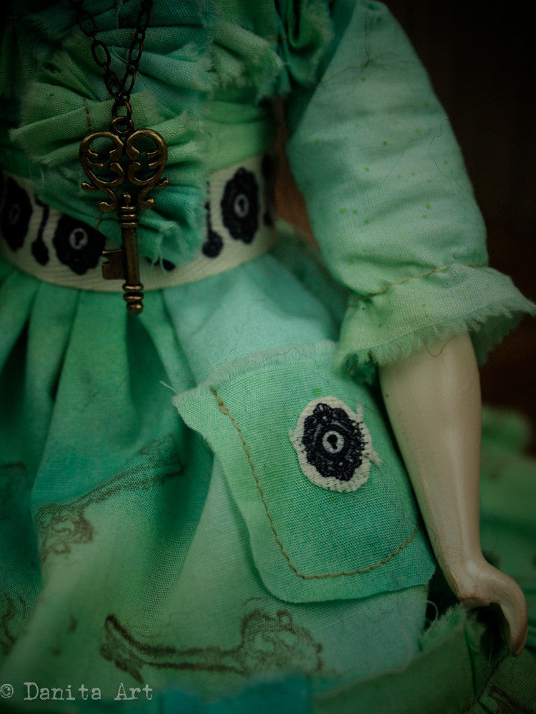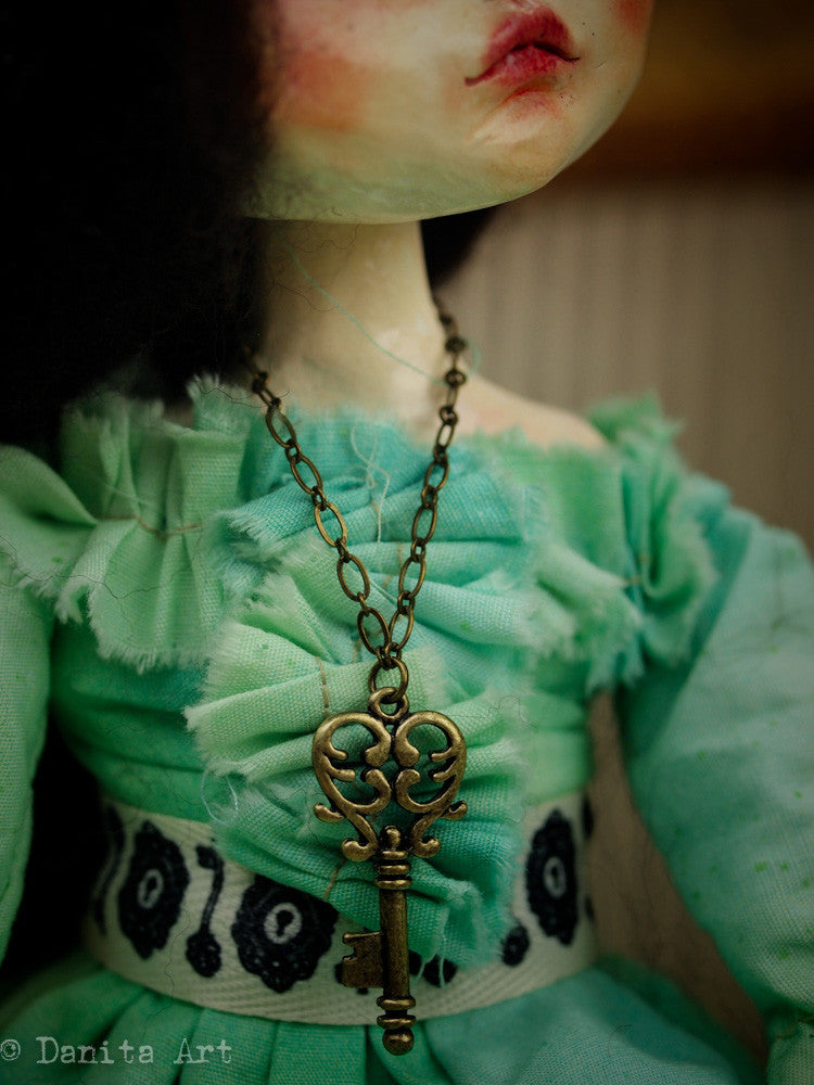 She measures approximately 11 inches tall (27 cm) and her body is made of hand sewn muslin, with hand cast arms and legs, one of them is a little broken, just like her heart. Her hand made clothes are beautiful green fabric, with keys and locks stamped with ink in her dress. Her belt also has a keyhole pattern, as well as the pocket in her dress.
