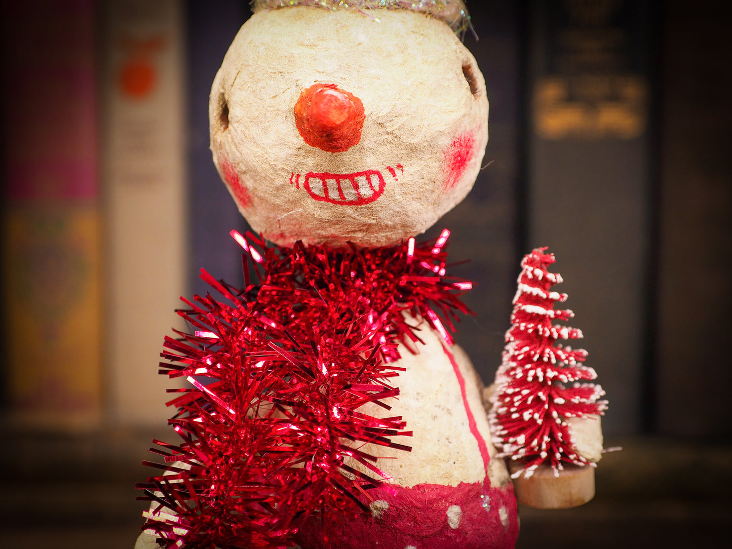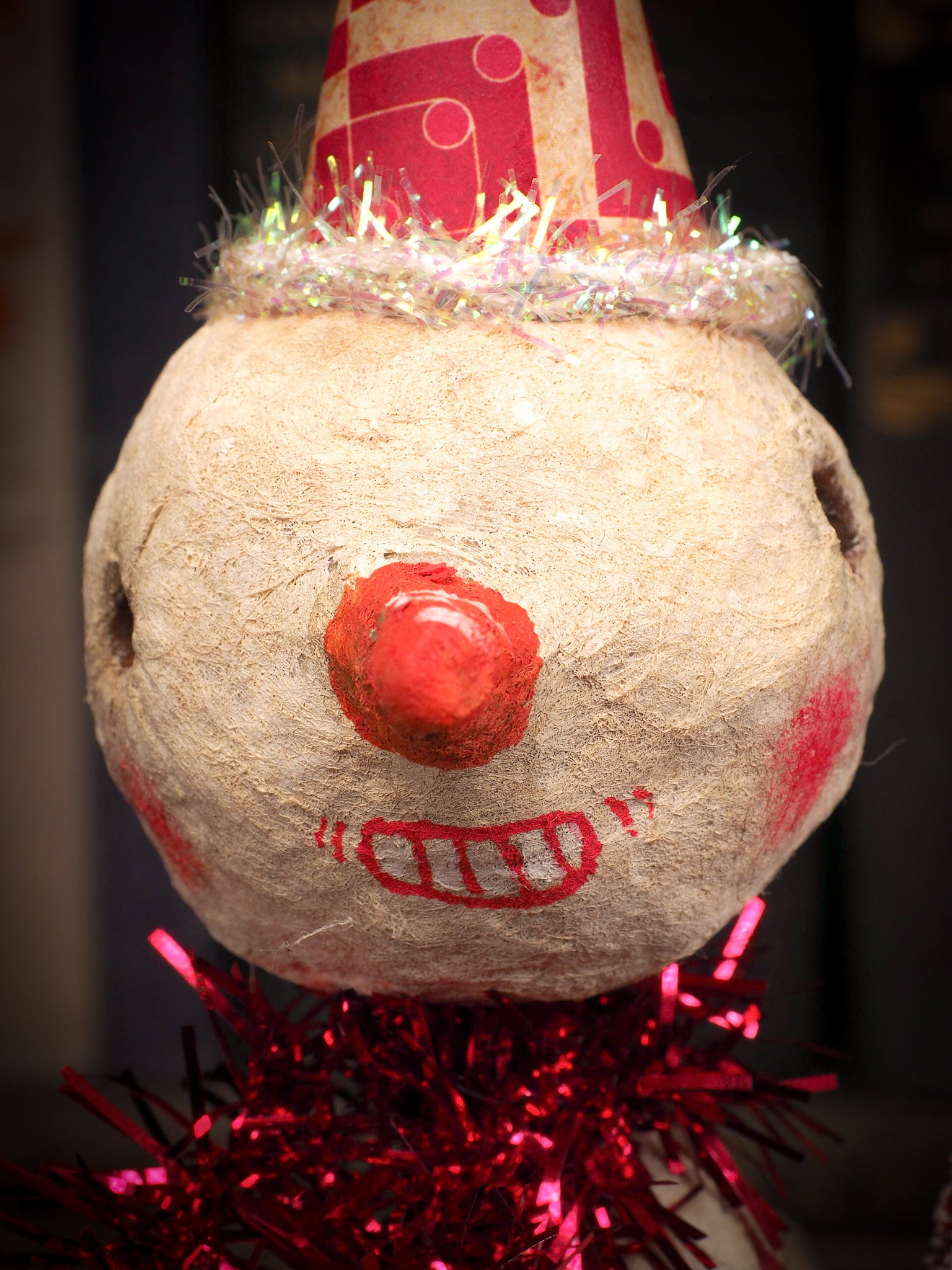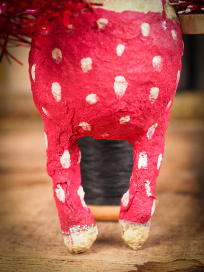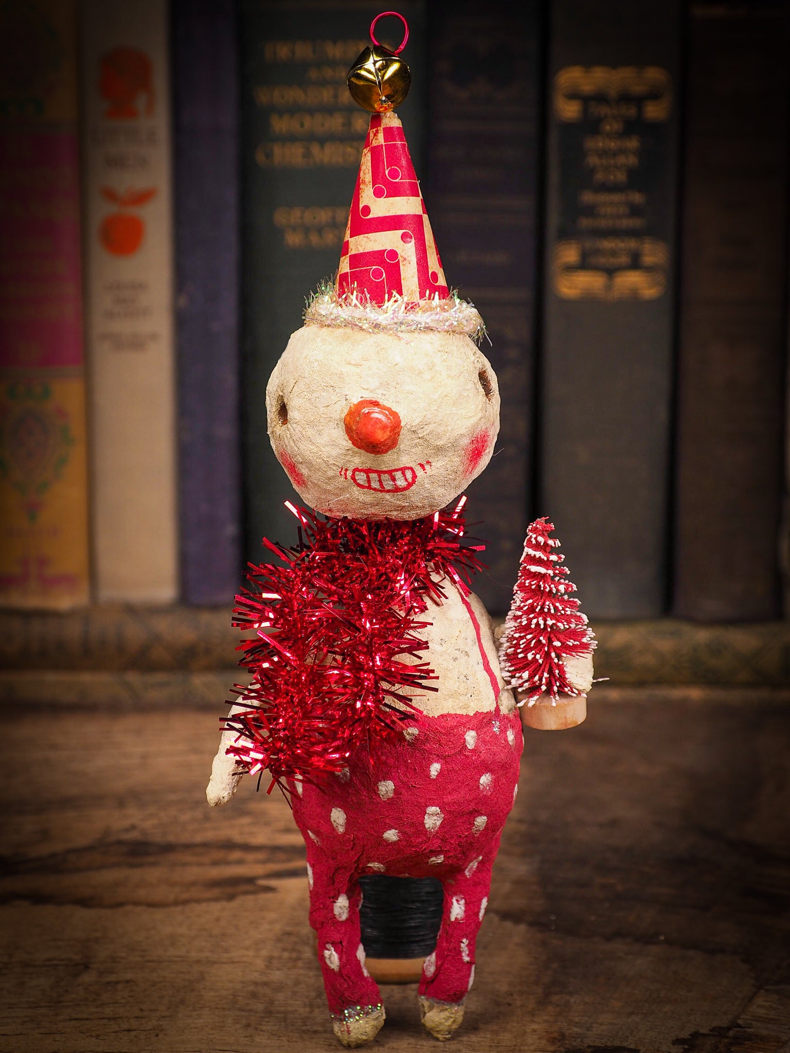 Hand painted by the artist, this holiday figurine is sporting a beautiful hand made paper hat with tinsel and vintage style garlands and a tiny Christmas tree to keep the festive spirit going!