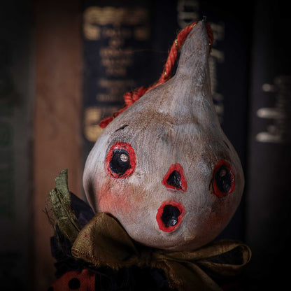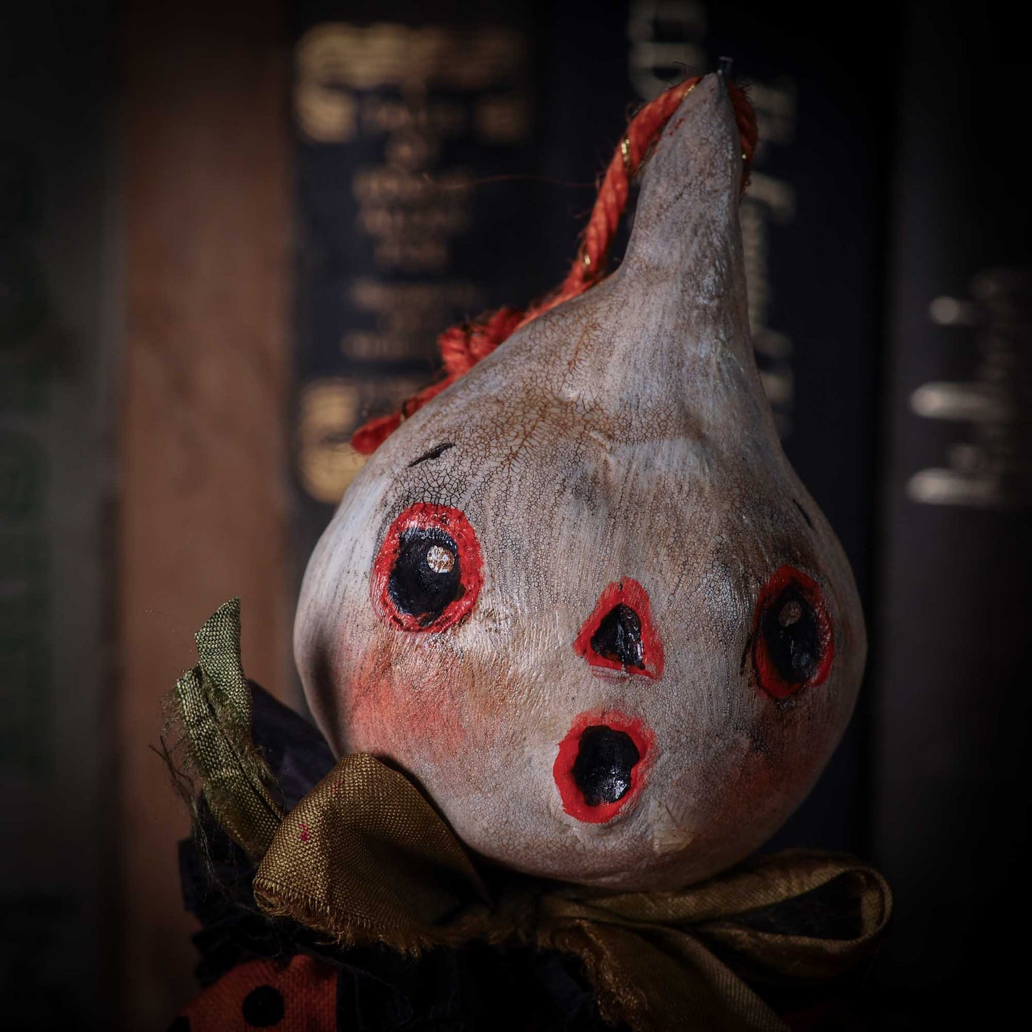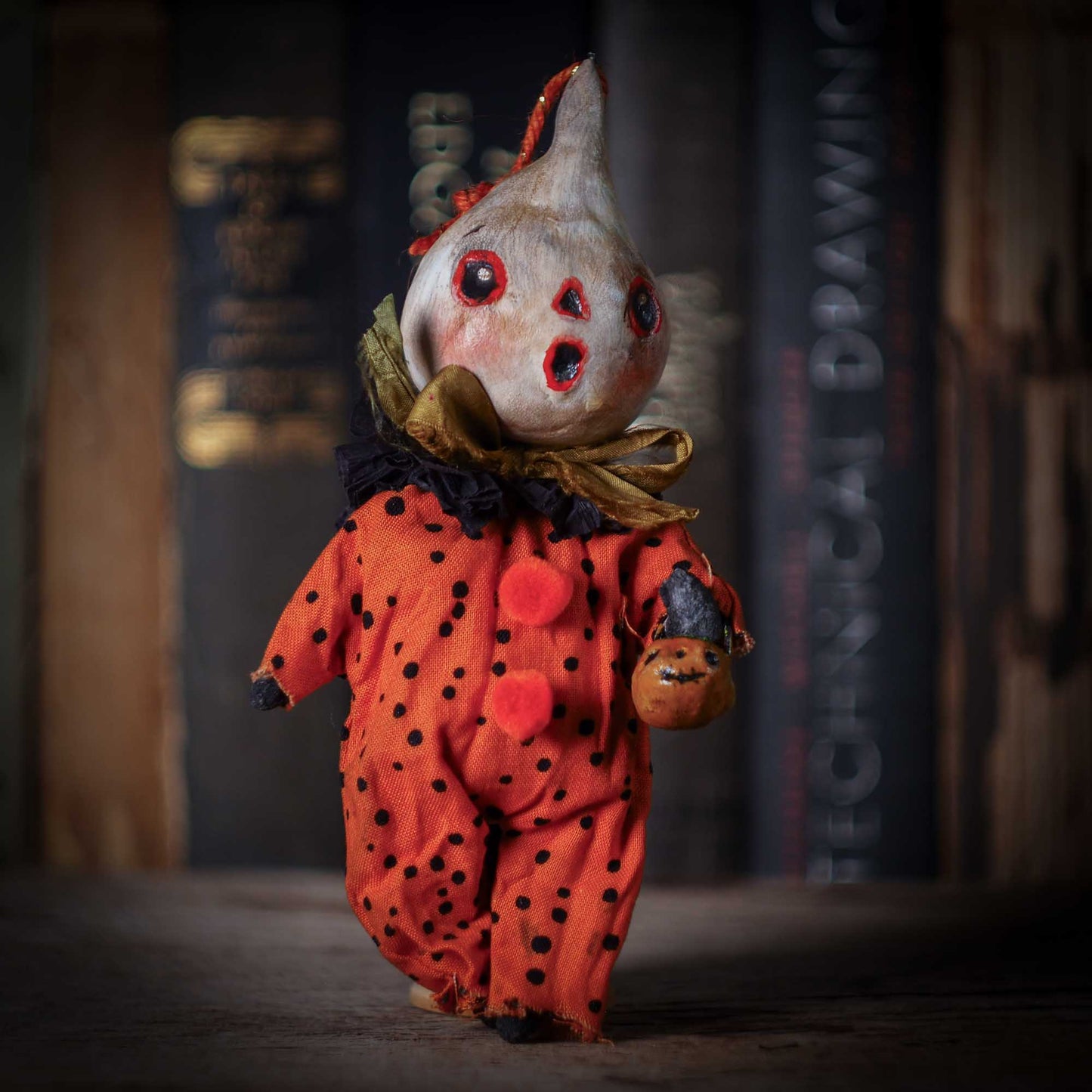 This handmade creepy cute Halloween original art doll was made by Idania Salcido, the artist behind Danita Art, using paper clay and fabrics, sculpting a whimsical face with the famous Danita lively eyes, painted with a spark of life on them.
