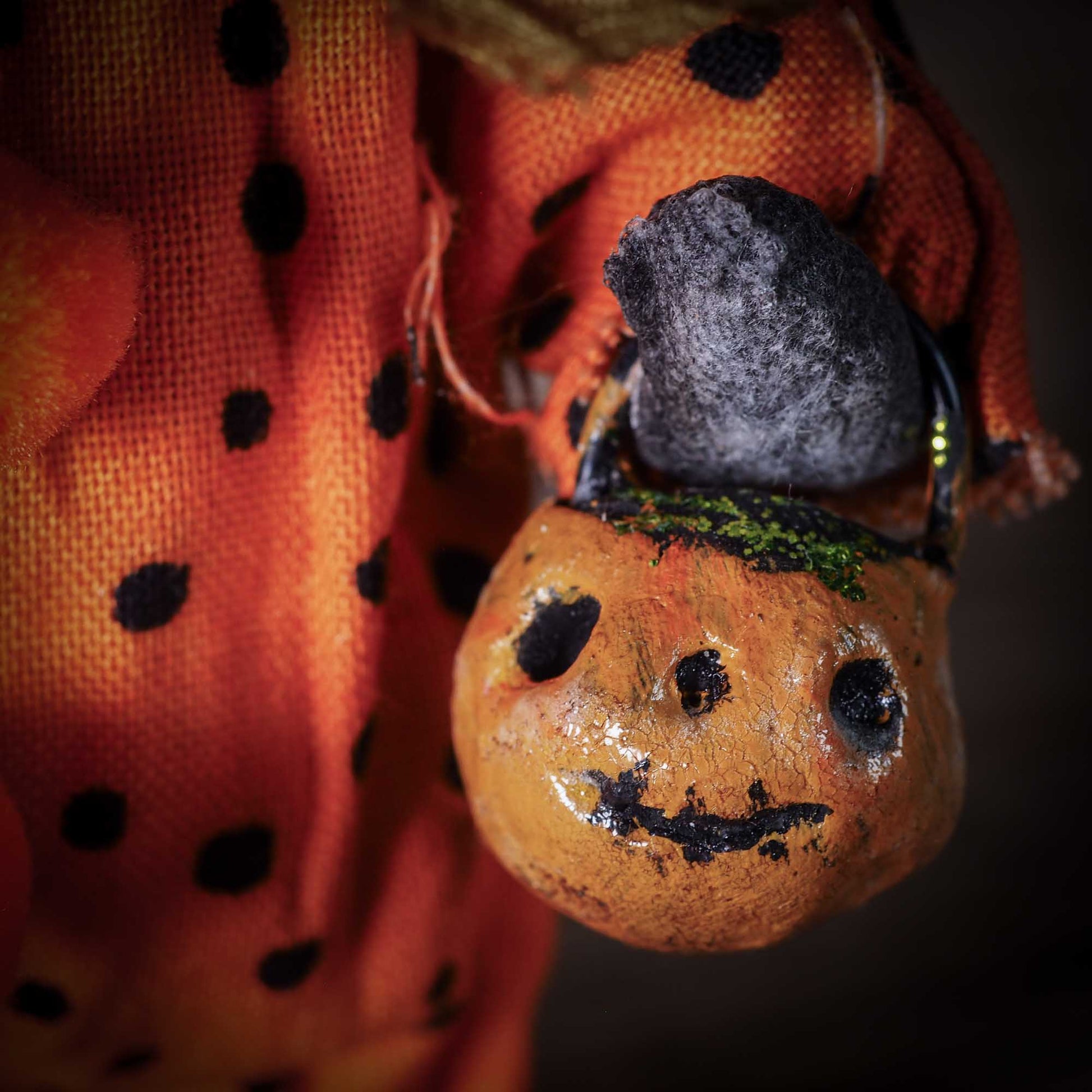 The Halloween art doll has a jack-o-lantern on its hand and it can be displayed sitting on a shelf, or hanging as an ornament from your Halloween or Christmas tree.
