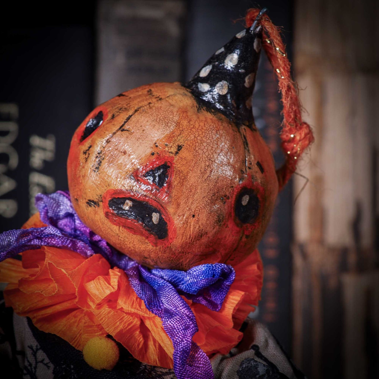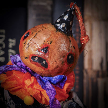 The Halloween art doll has a jack-o-lantern on its hand and it can be displayed sitting on a shelf, or hanging as an ornament from your Halloween or Christmas tree.
