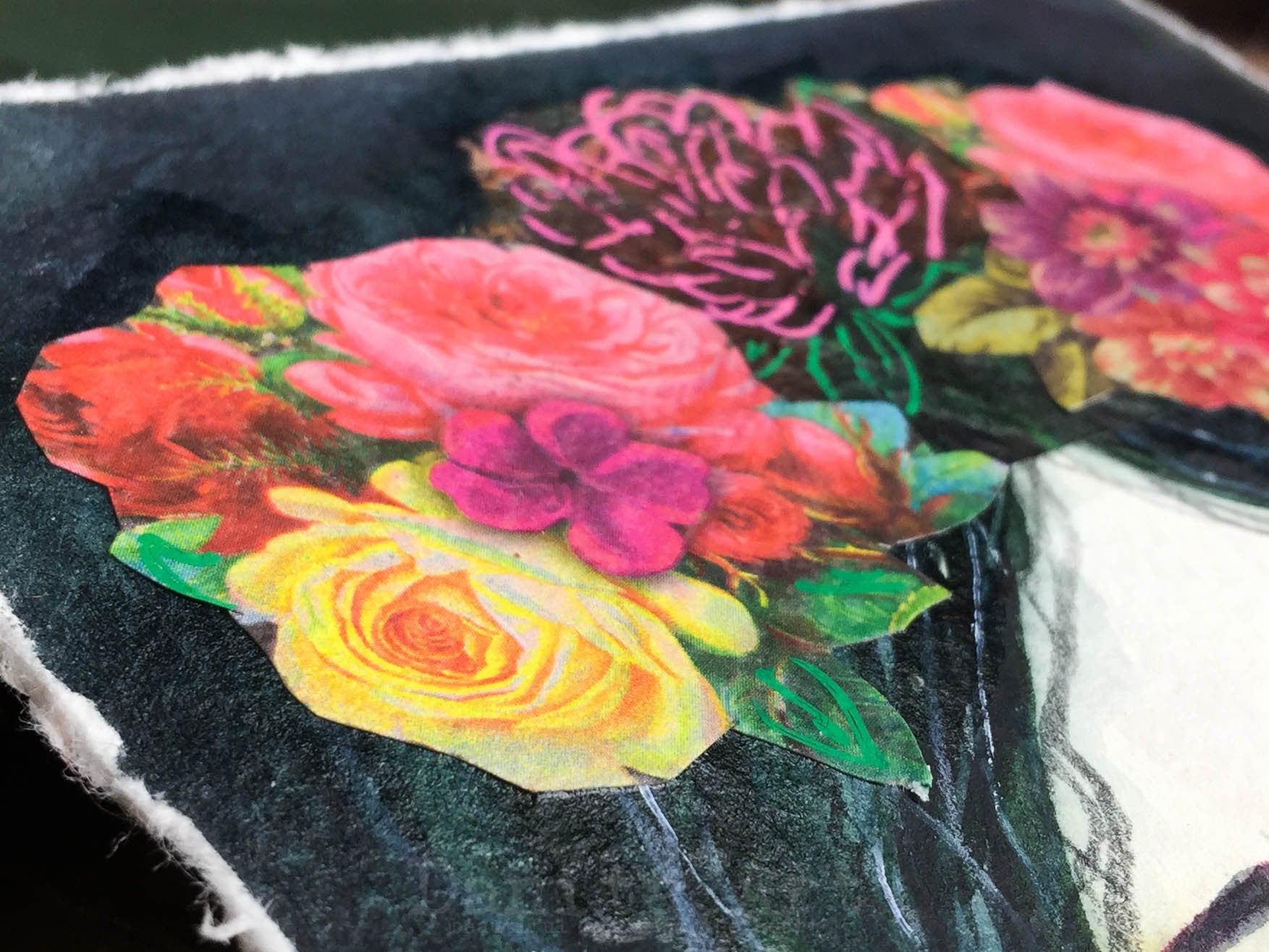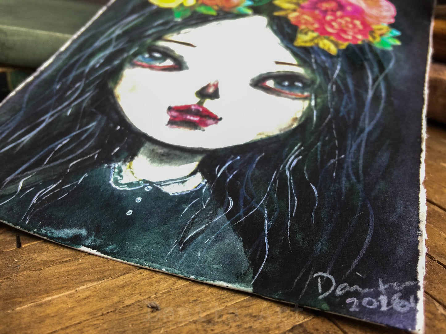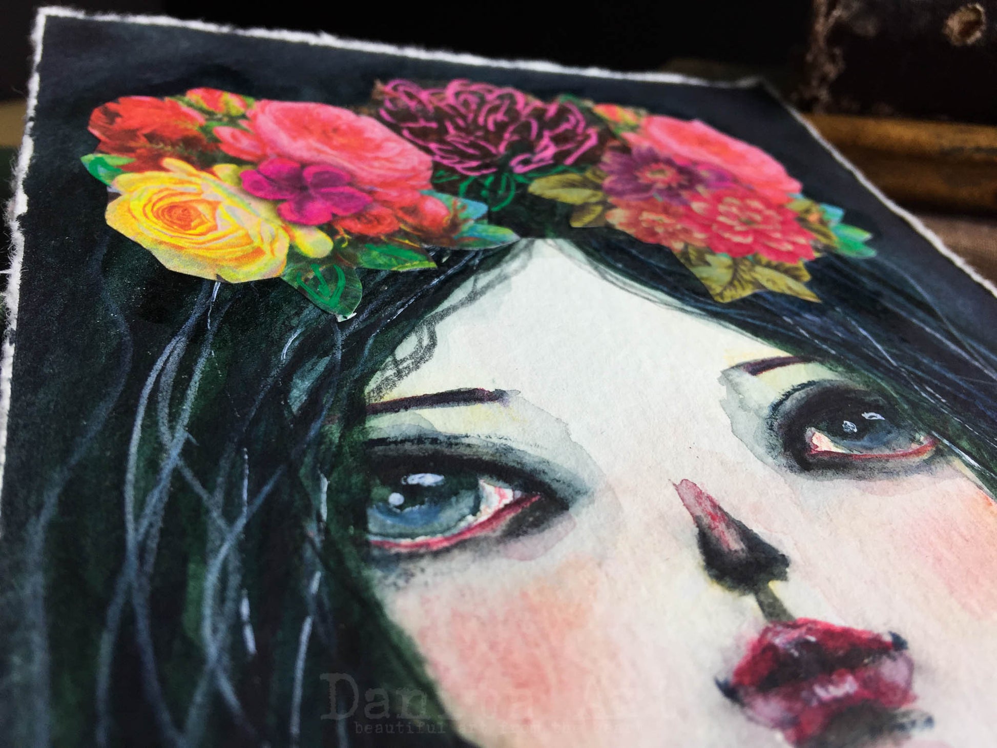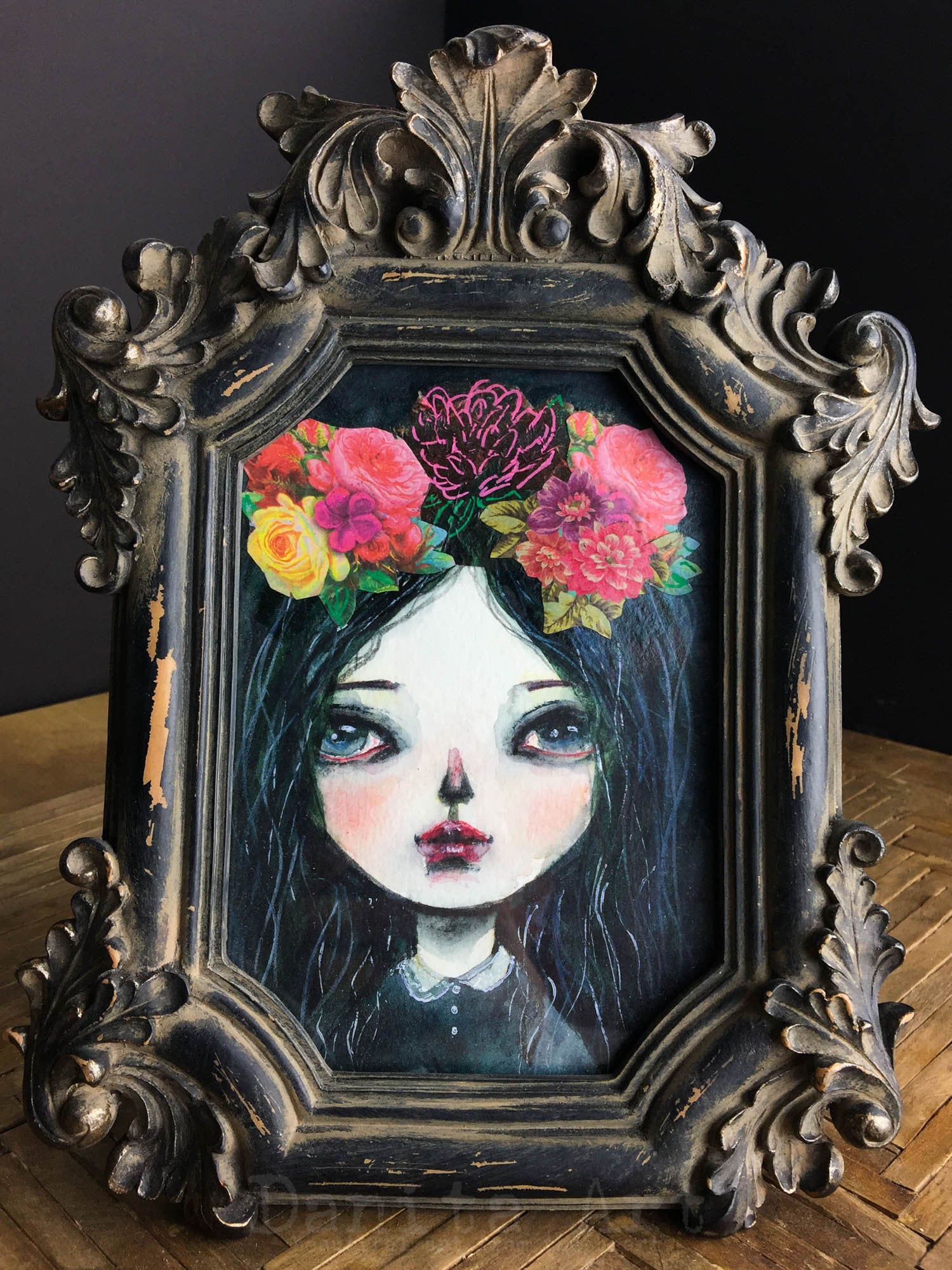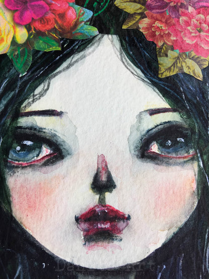 This beautiful painting by me, Danita Art is a 5" x 7" mixed media collage on paper. It's created using watercolors, acrylics, gouache and paper flowers collaged on her hair.