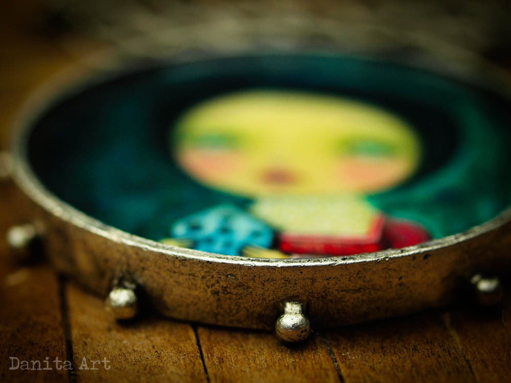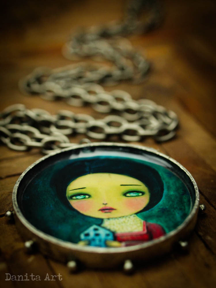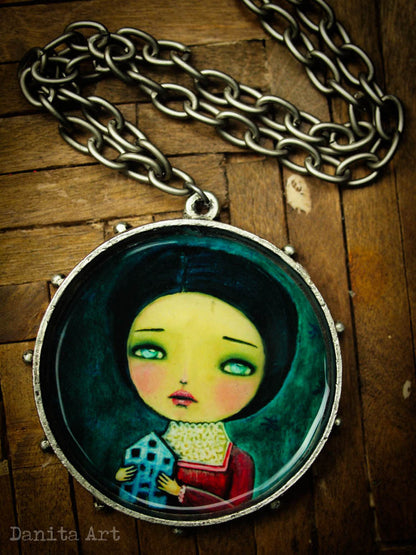 This very special necklace features a detail of one of my original paintings. Round in shape and in an oxidized silver color, it measures about 2 inches in diameter and hangs from a chain.