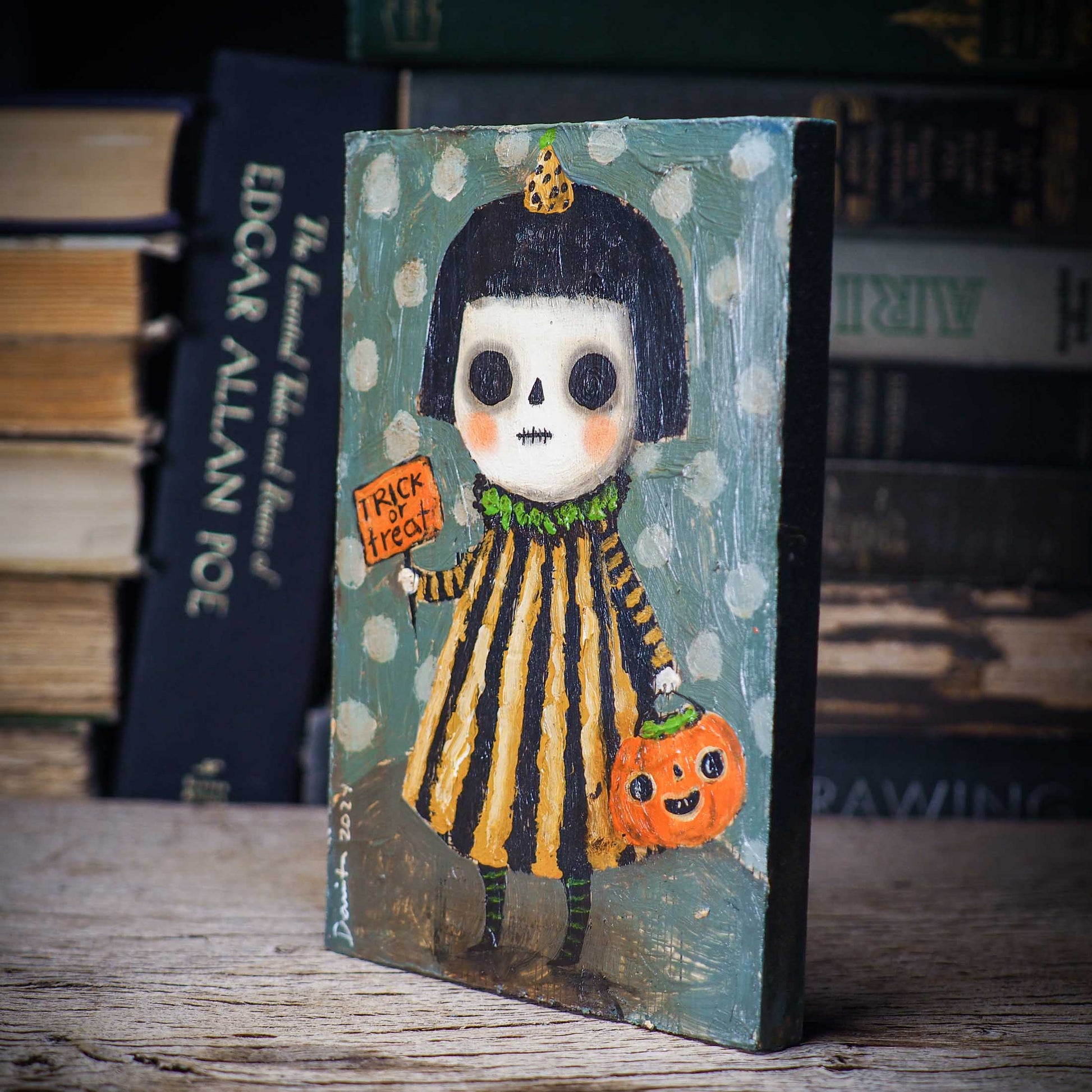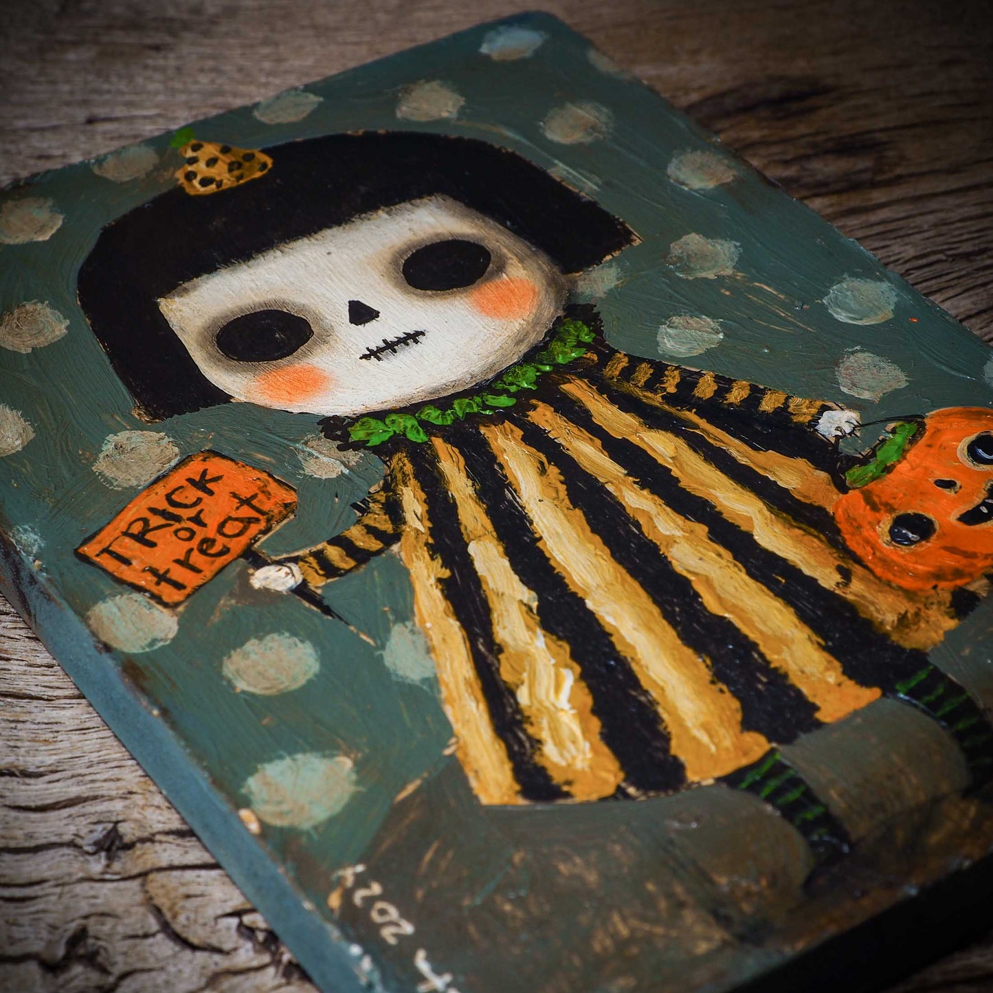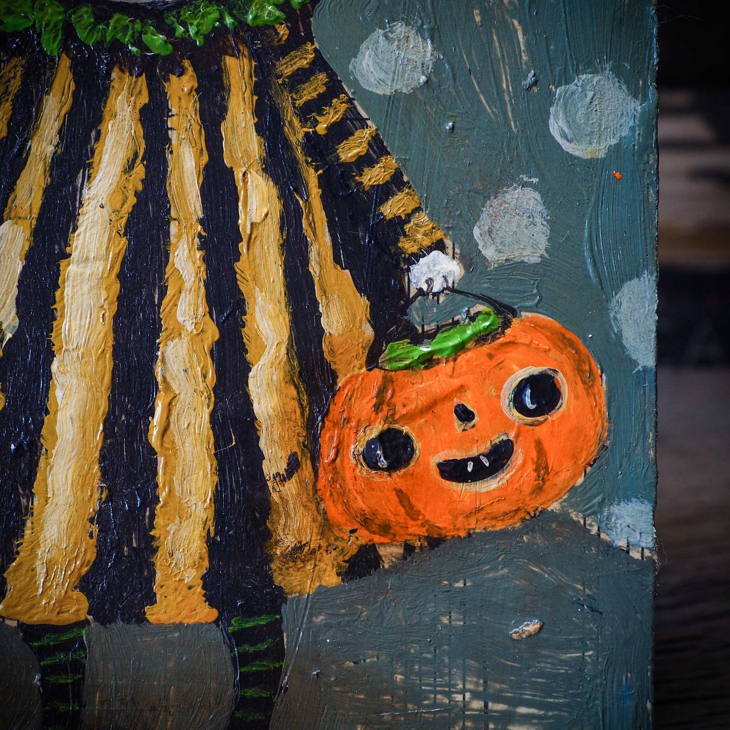 Halloween is coming, and my inspiration has just started! And for my first collection, I create a series of outsider folk art paintings with bright colors and rough textures over a wood block.