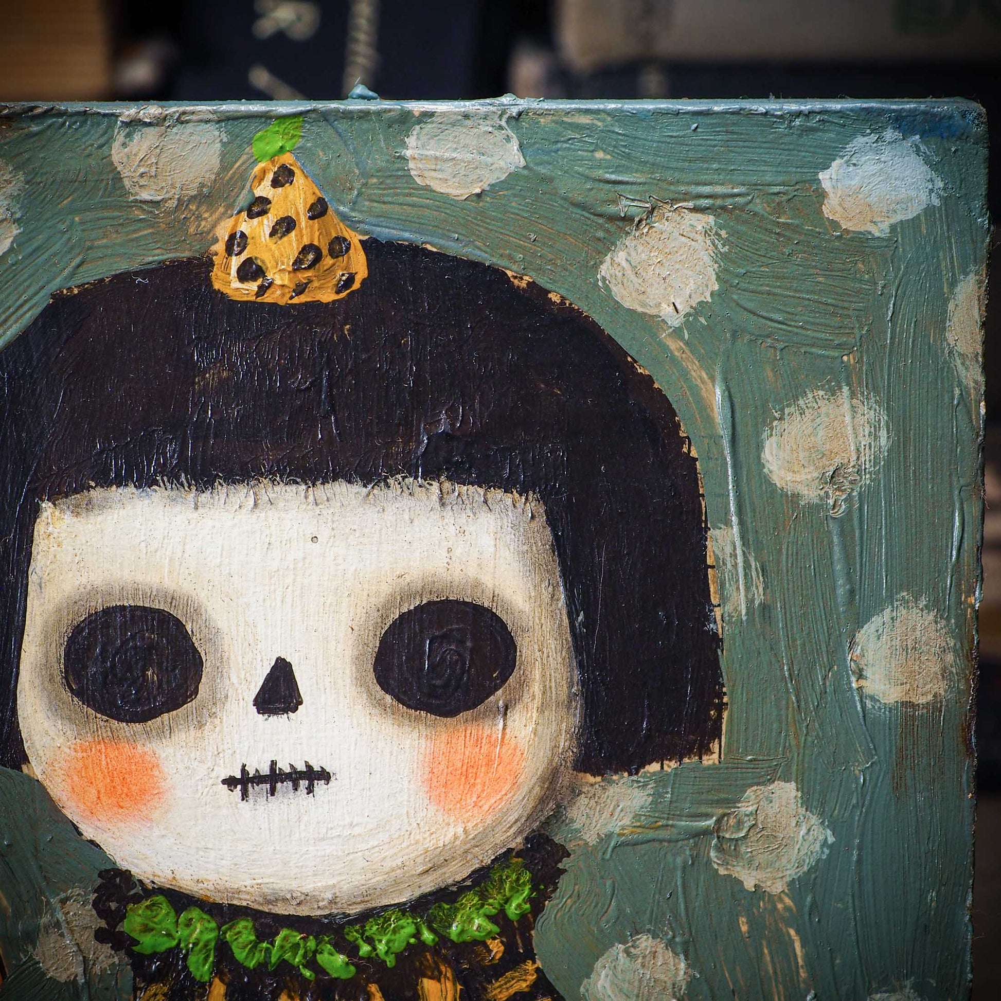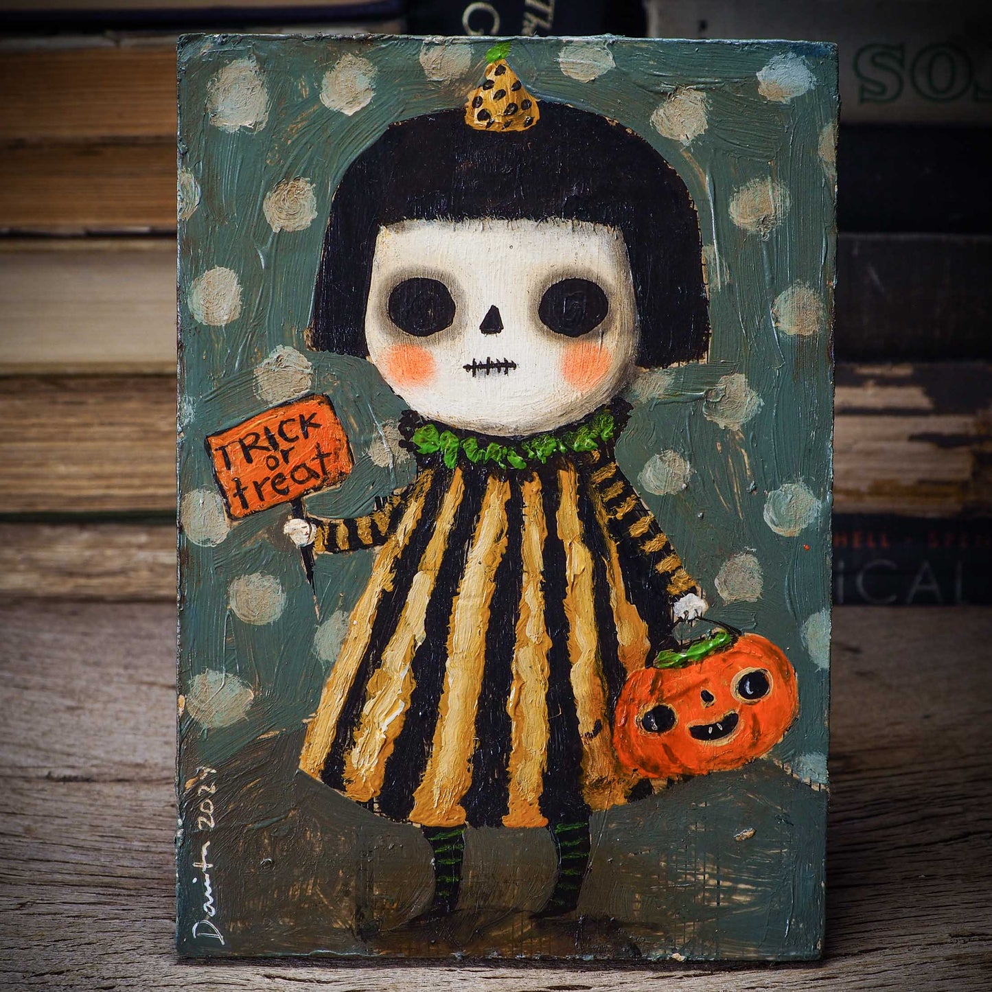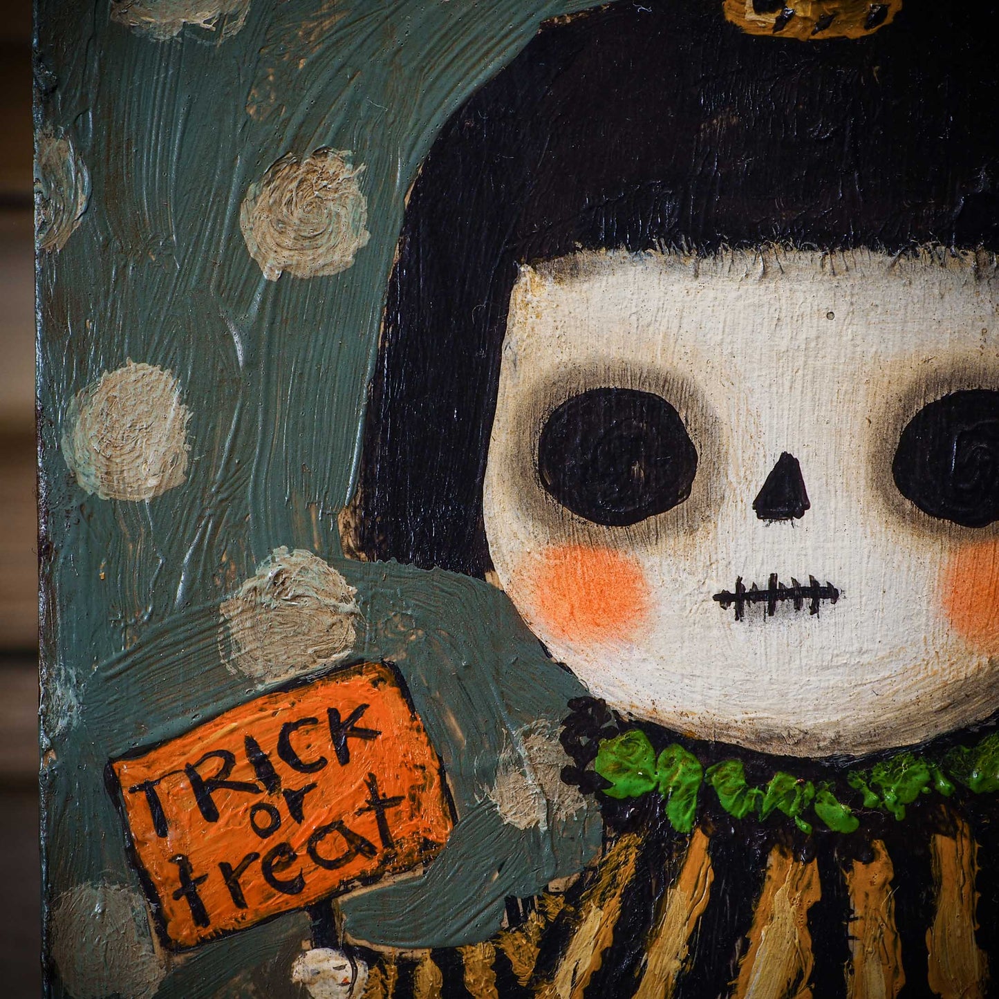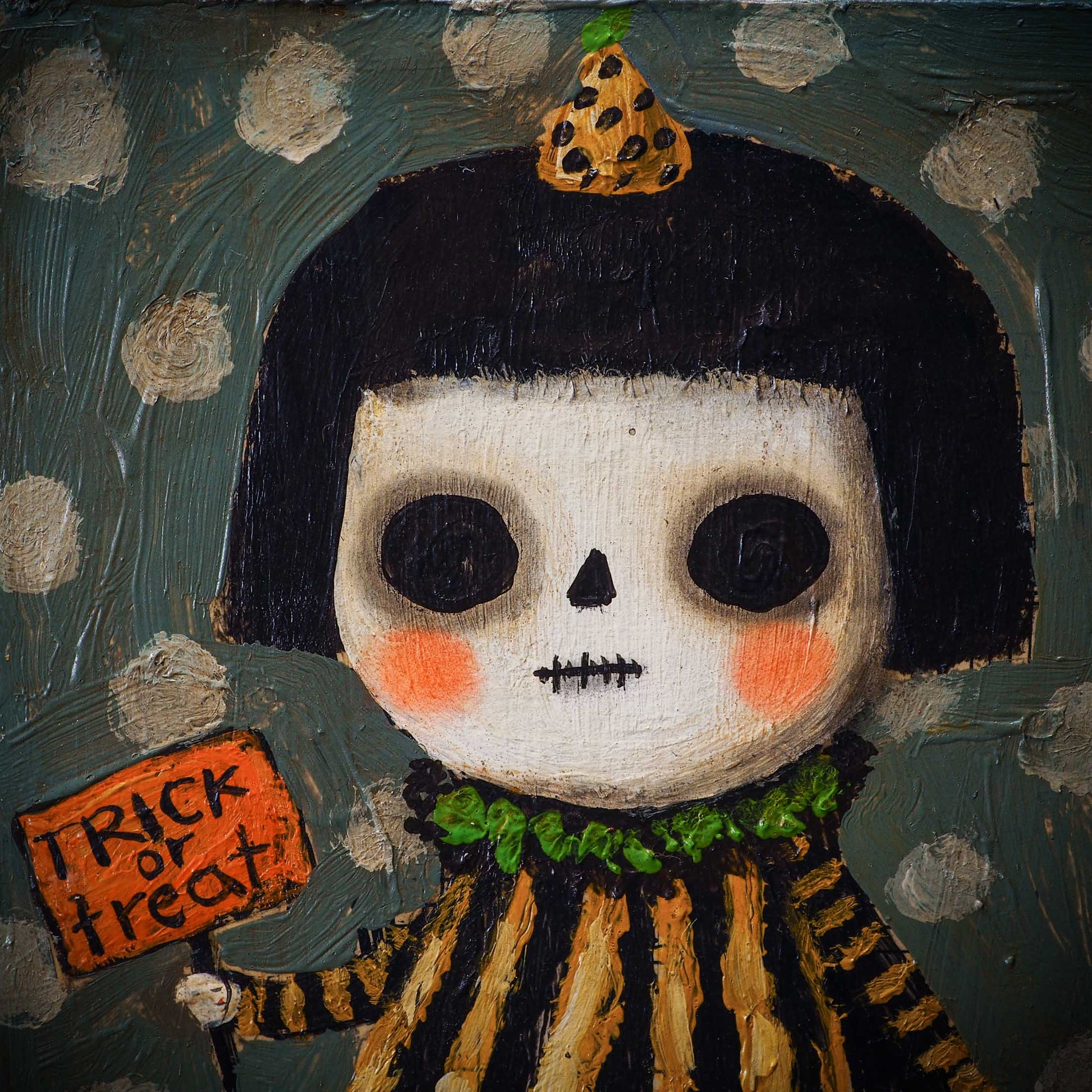 Halloween is coming, and my inspiration has just started! And for my first collection, I create a series of outsider folk art paintings with bright colors and rough textures over a wood block.