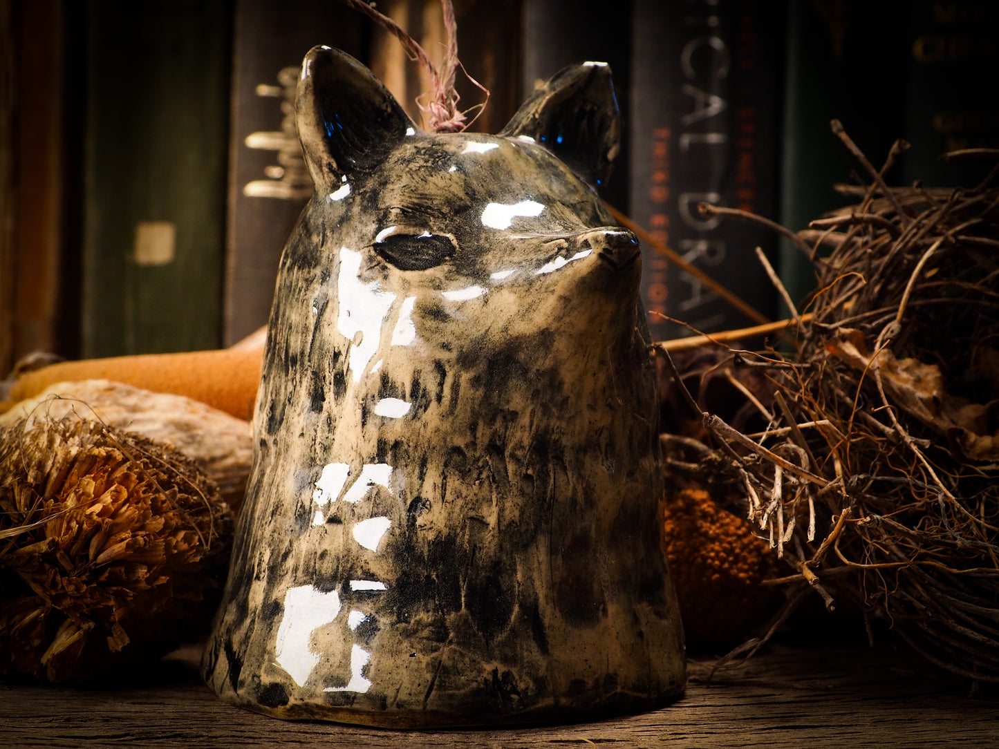 I am delighted with the results of my experiments. Using high fire ceramic clay, I hand sculpted wolf and bunny rabbit heads and then added a wooden ball to make it ring. They are glazed in beautiful earth tones and will stand weather and wind when you hang them from your favorite garden spot to enjoy their soothing musical sounds for years to come, all made with lots of love from me, Danita Art, to you.