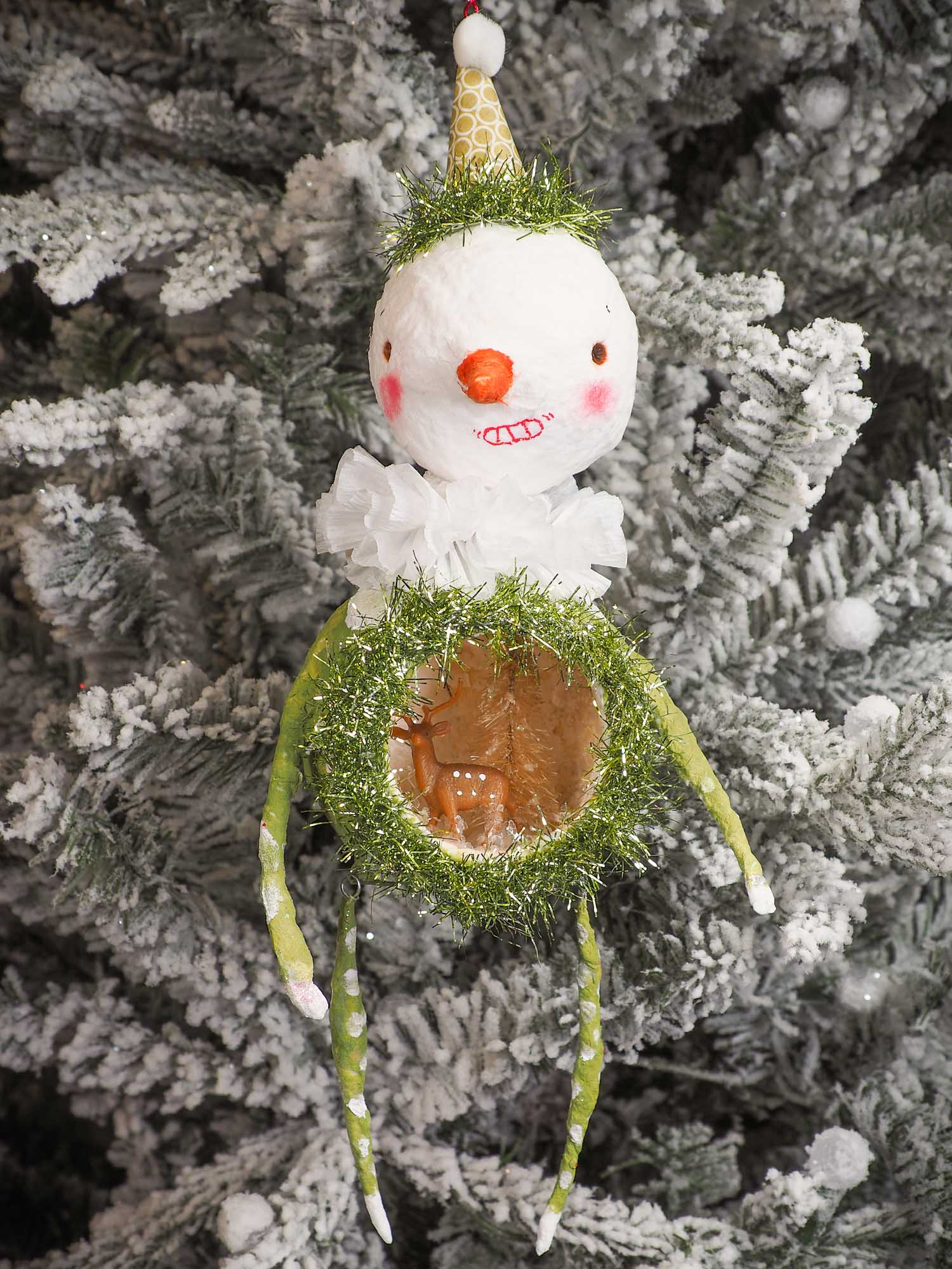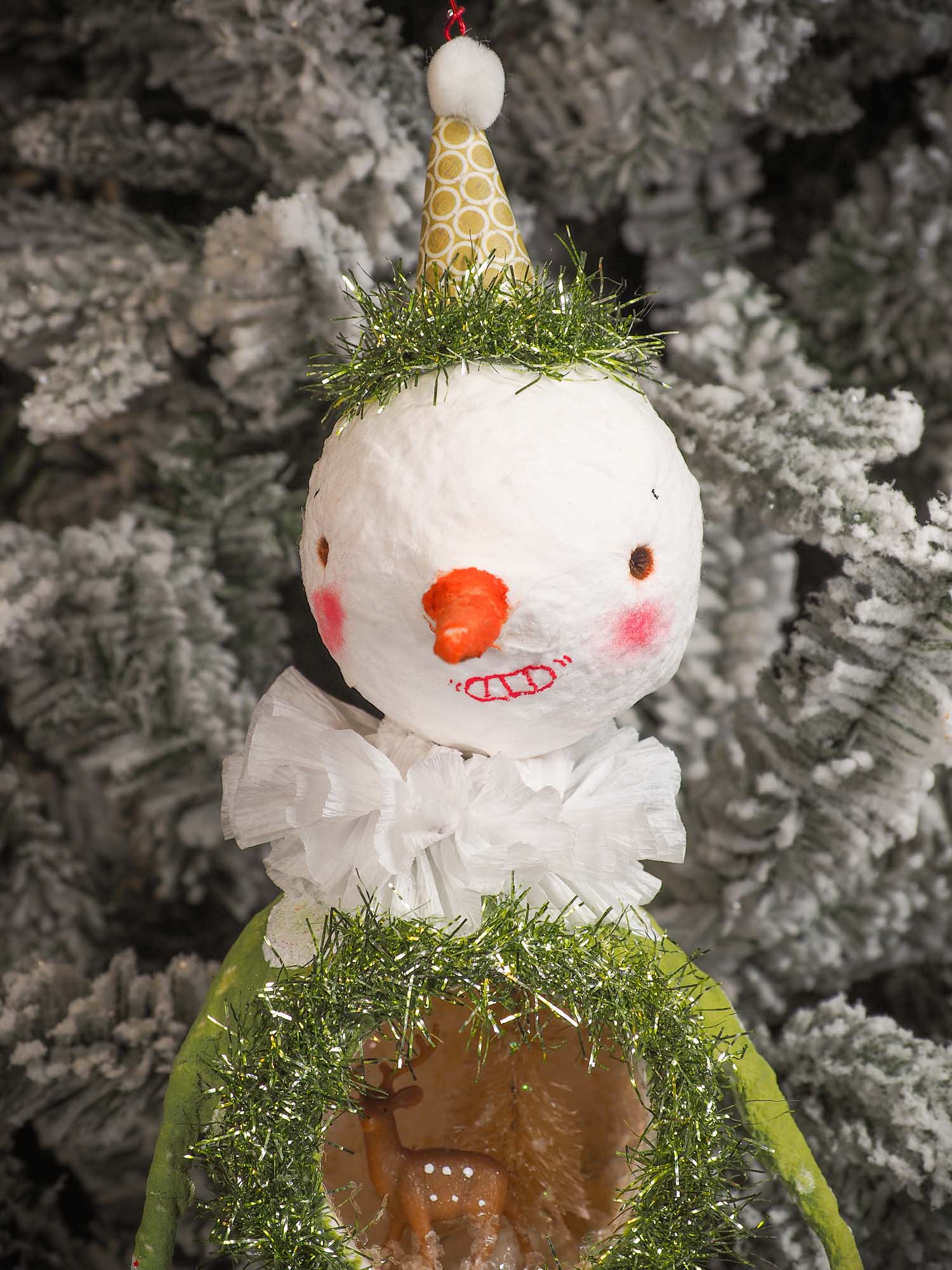 Adorable handmade spun cotton Art Doll Christmas tree ornament by Idania Salcido, the artist by Danita Art. Hand painted by the artist holiday figurine with paper hat with tinsel and vintage style garlands and a tiny Christmas tree. Hang this handmade ornament from your Christmas tree or use as Holiday decoration.