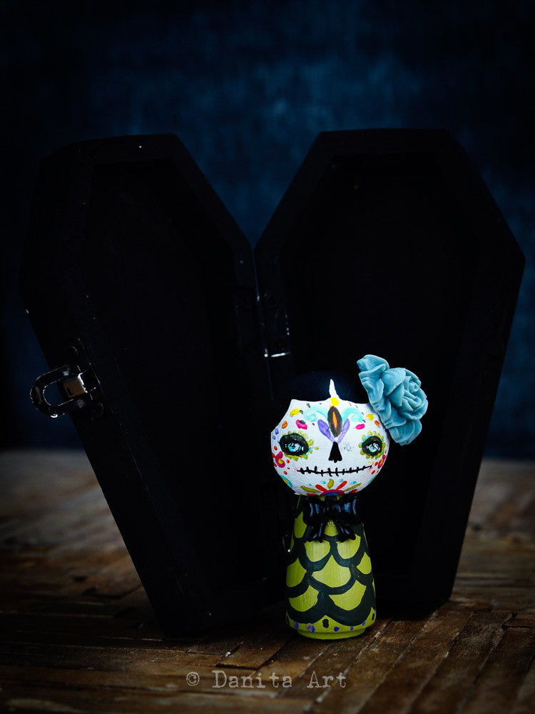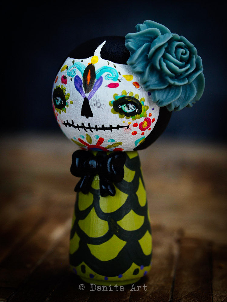 These little Kokeshi sugar skull dolls are celebrating Dia de Muertos, a beautiful Mexican tradition where we honor our ancestors with a colorful fiesta full of food and drinks.
