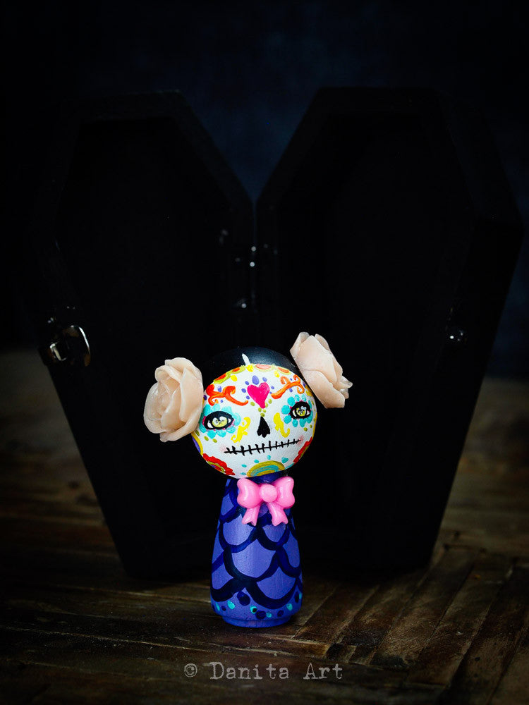 These little Kokeshi sugar skull dolls are celebrating Dia de Muertos, a beautiful Mexican tradition where we honor our ancestors with a colorful fiesta full of food and drinks.