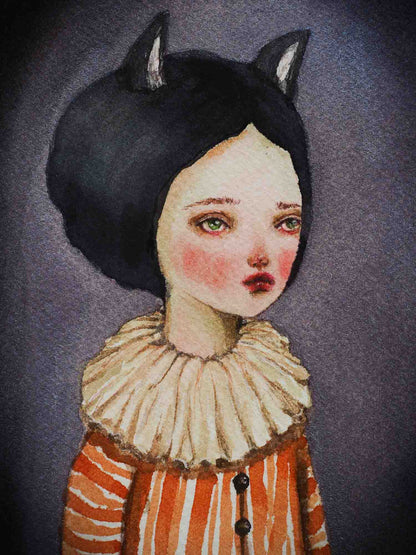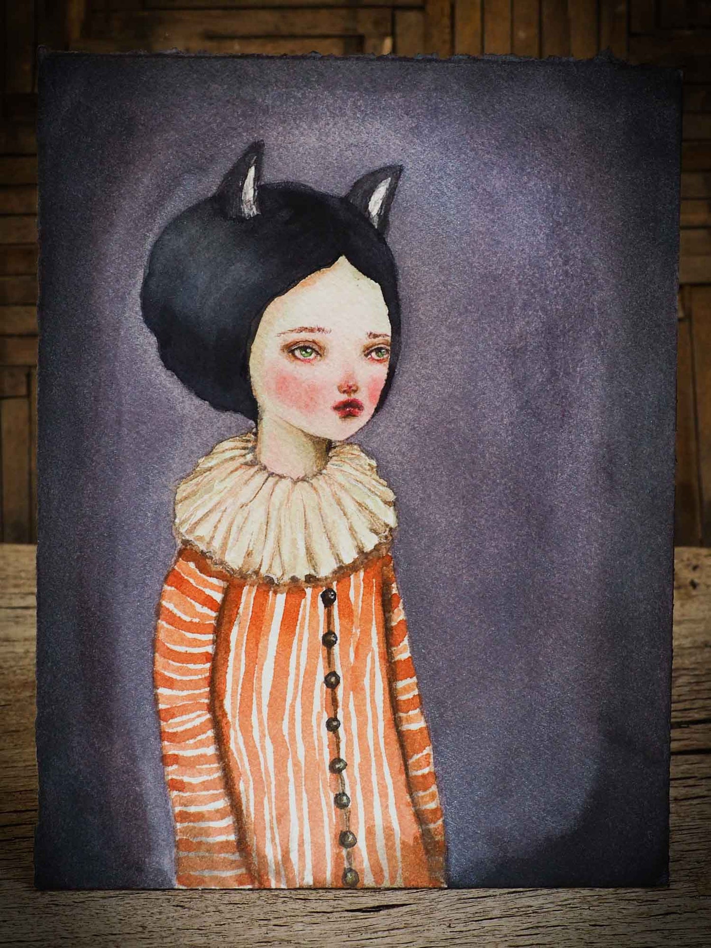 I love her ruffled neck, her orange striped clothes and her pointy fuzzy ears. Watercolor is the perfect medium to achieve texture and you can see how her ears are all fluffy and touchable, if she would just let you do it!
