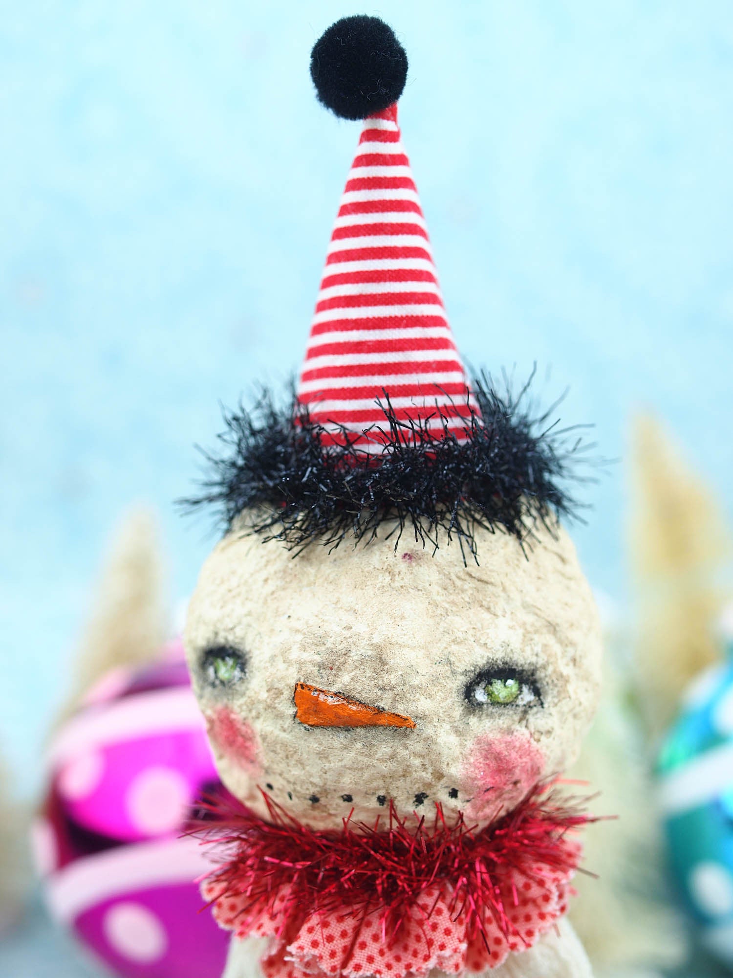 These adorable mixed media snowman doll was created by me, Danita. I up-cycled a plastic doll I found on the thrift store and made a new head for it with paper clay.