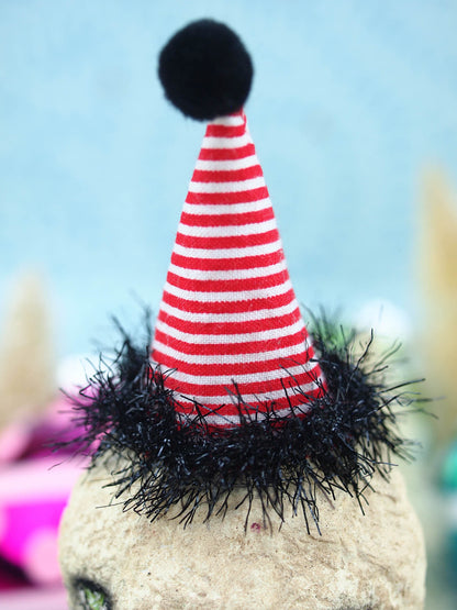 Then I took scrap pieces of fabric from my larger doll doll projects and made a jumpsuit for each. Then I took some fabric and paper and made their hats, accented with vintage style tinsel and a matching pompon on top.