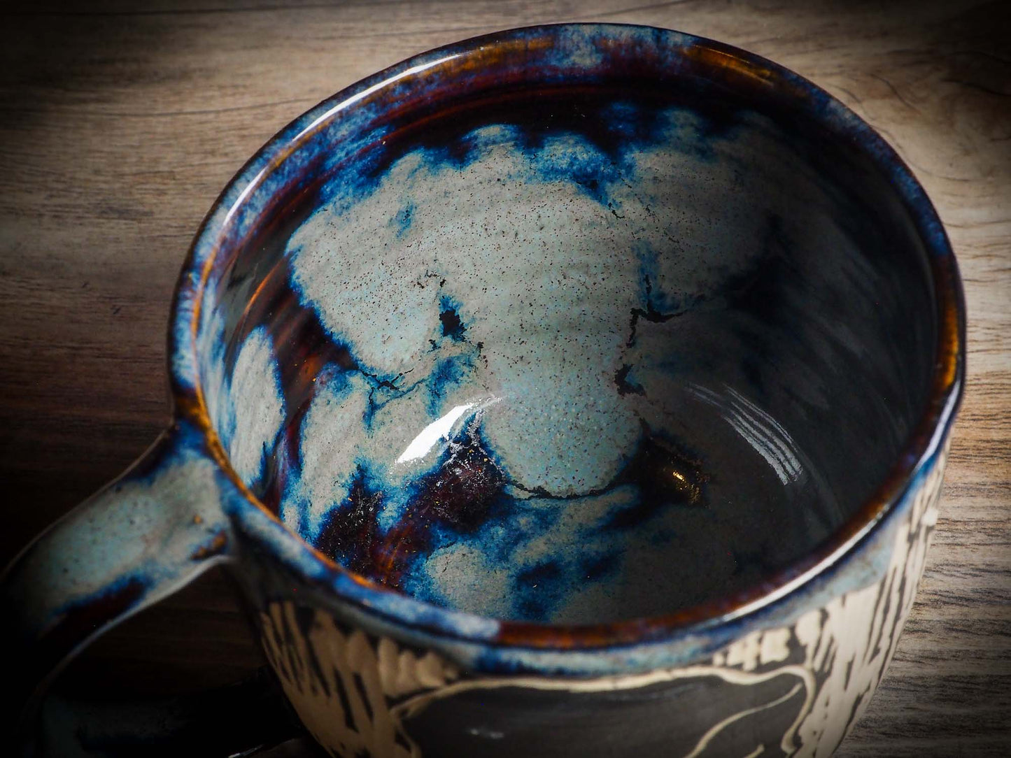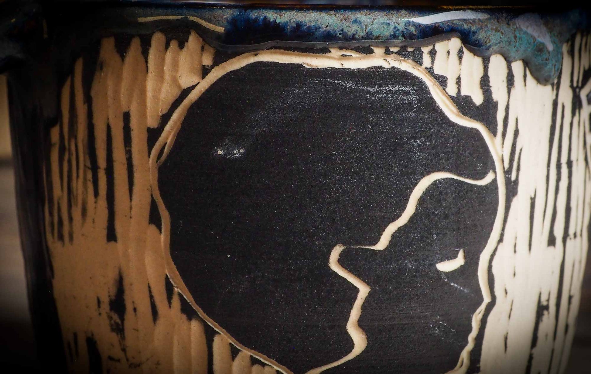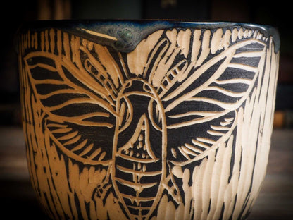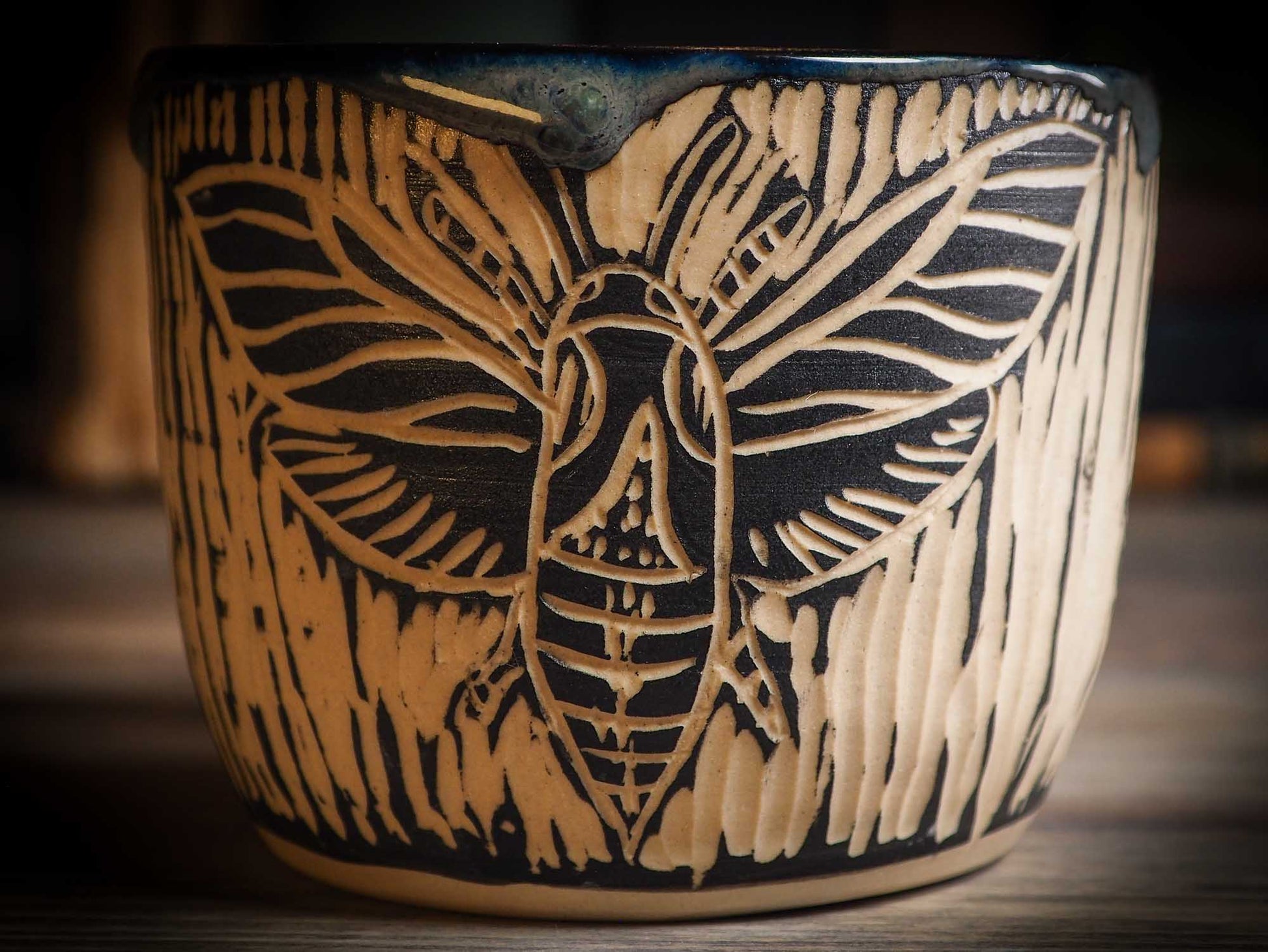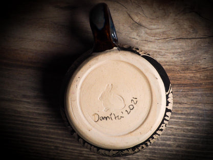 It measures 3 1/2 x 2 1/2 x 2 1/2 Inches, made with wheel thrown clay, hand carved and glazed by me with a dark, gooey glaze on the outside as well as the inside. The carved figures give it a nice, folk art primitive feel to it.
