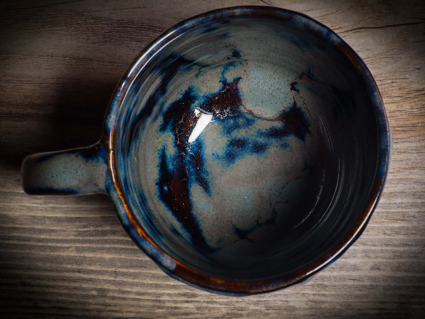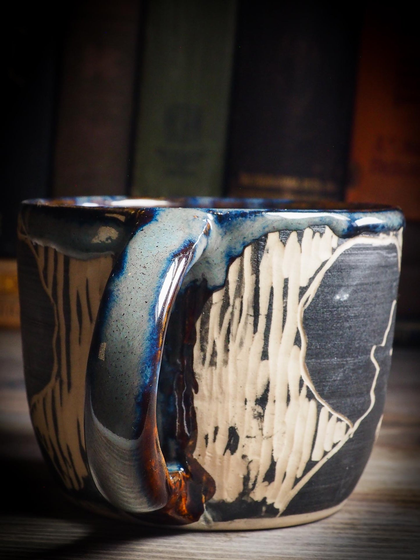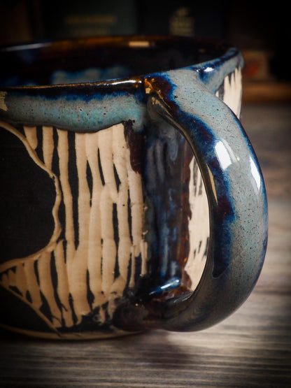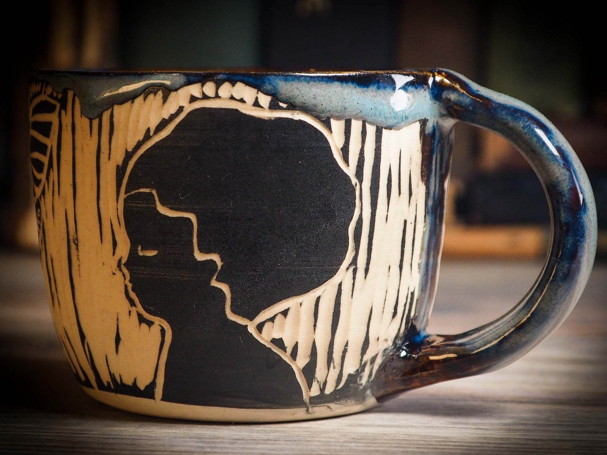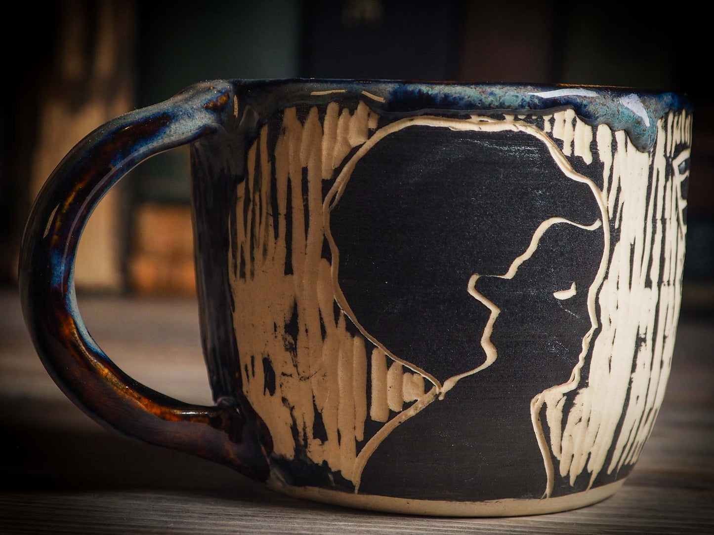 It measures 3 1/2 x 2 1/2 x 2 1/2 Inches, made with wheel thrown clay, hand carved and glazed by me with a dark, gooey glaze on the outside as well as the inside. The carved figures give it a nice, folk art primitive feel to it.
