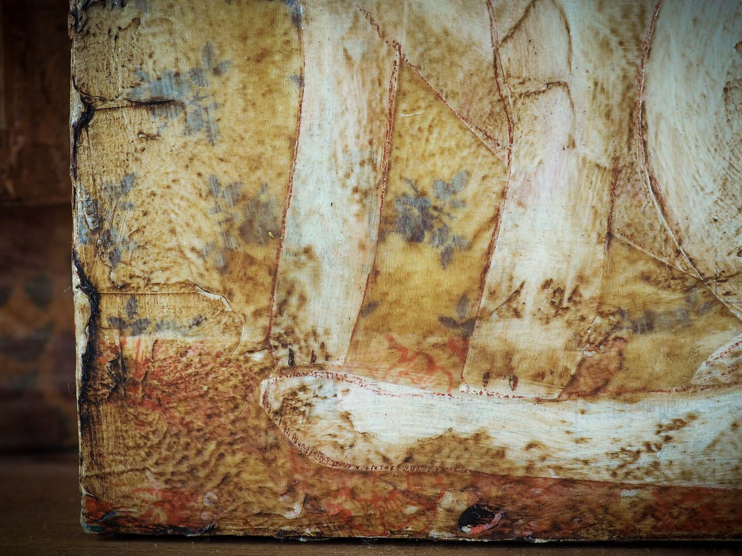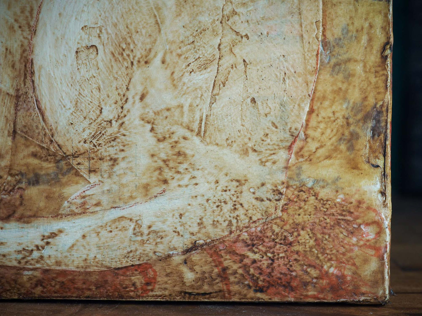 Created using paper collage techniques, combined with an alchemy of materials like acrylics, pastels, oil paint and many other materials over a wood panel in gallery style, with sides decorated with collage paper. Ready to hang on your favorite wall!