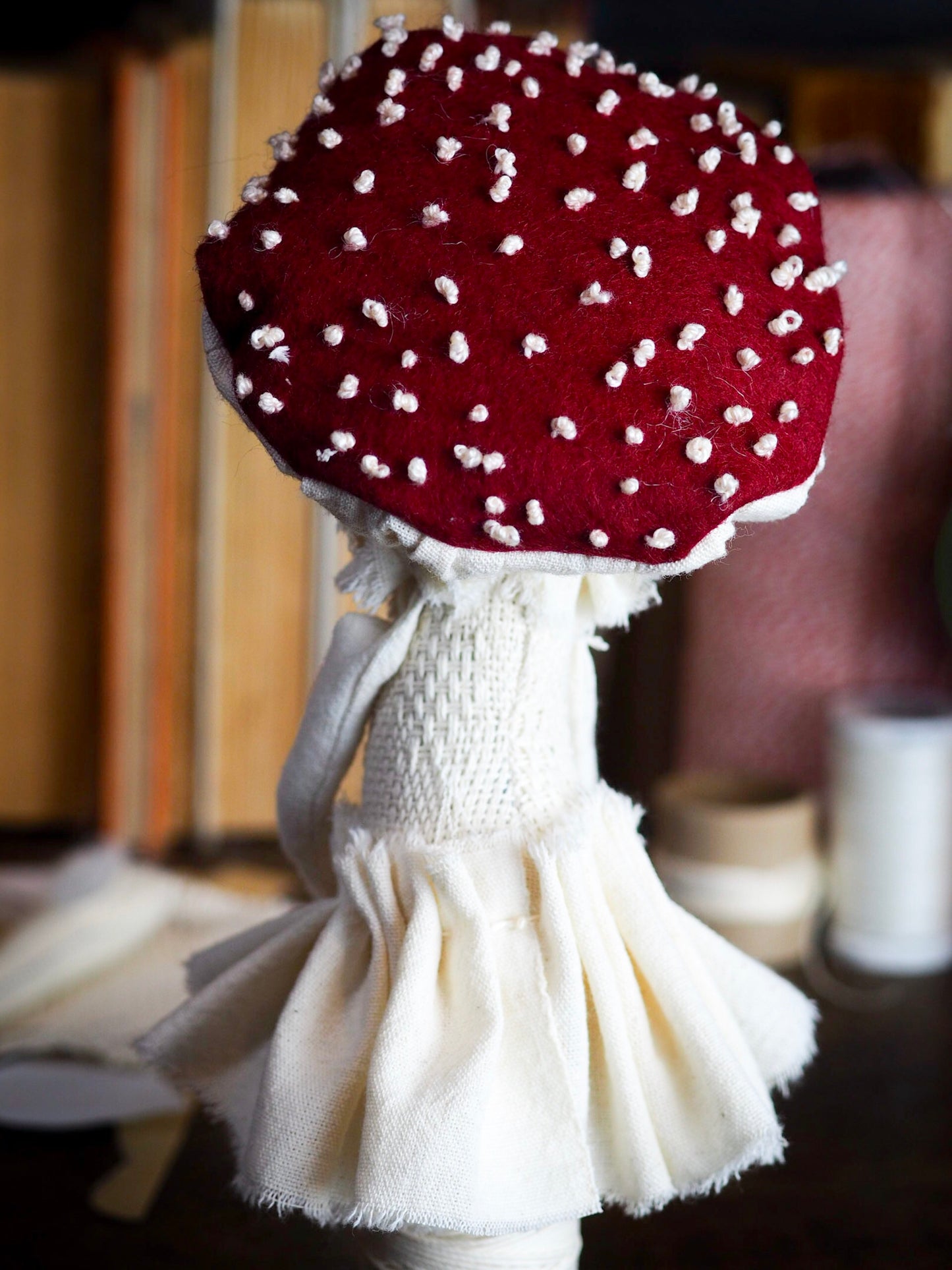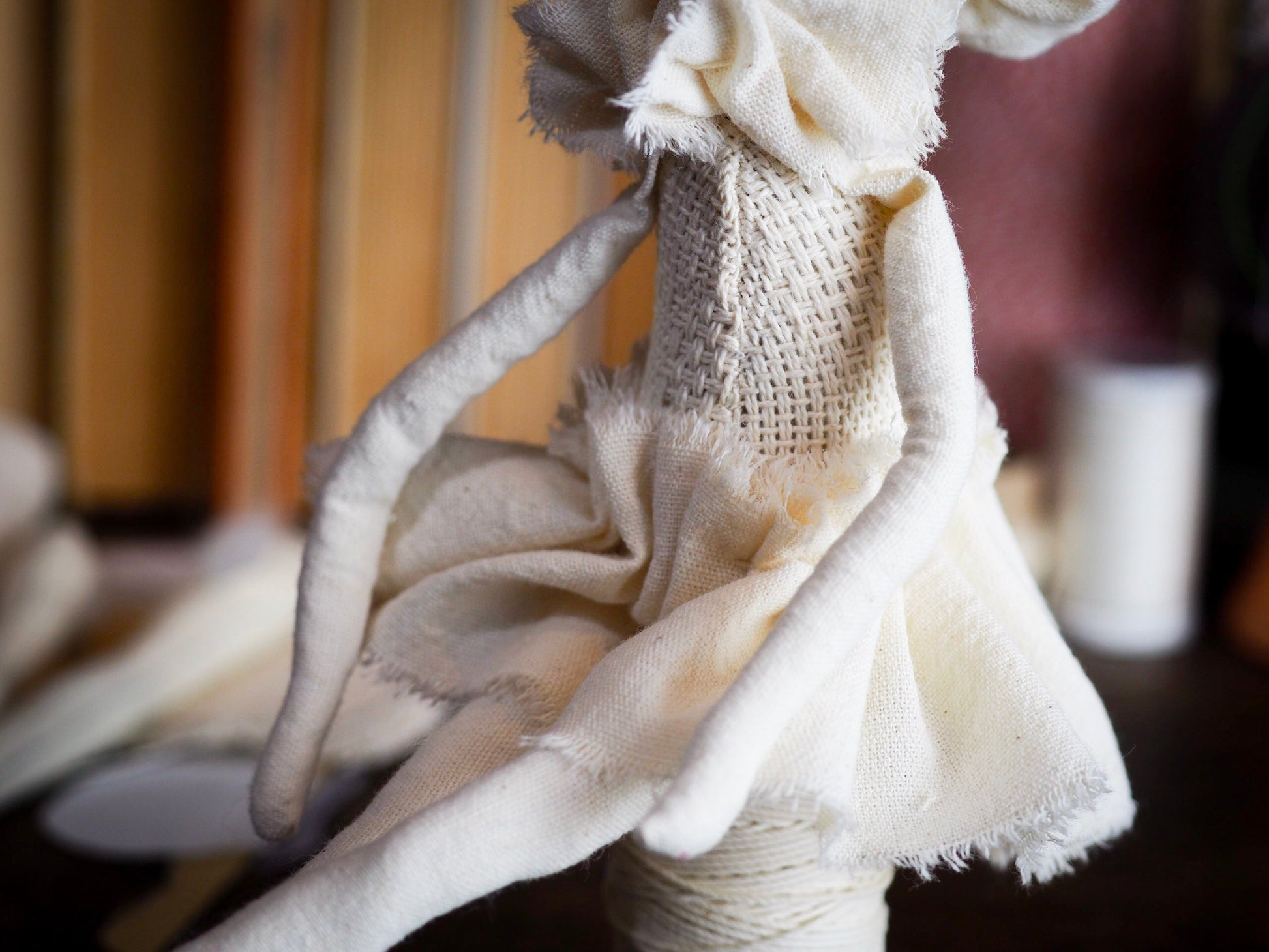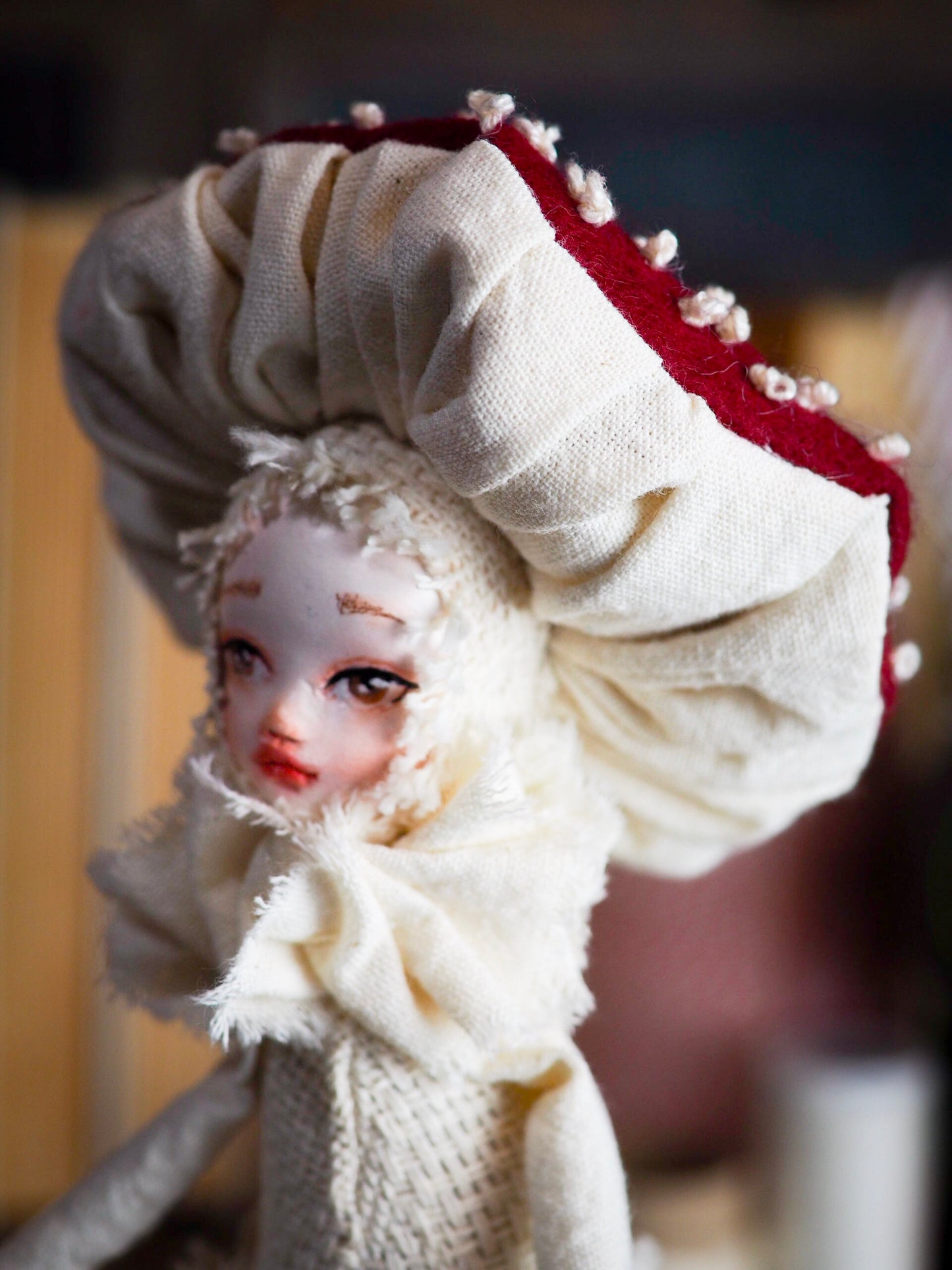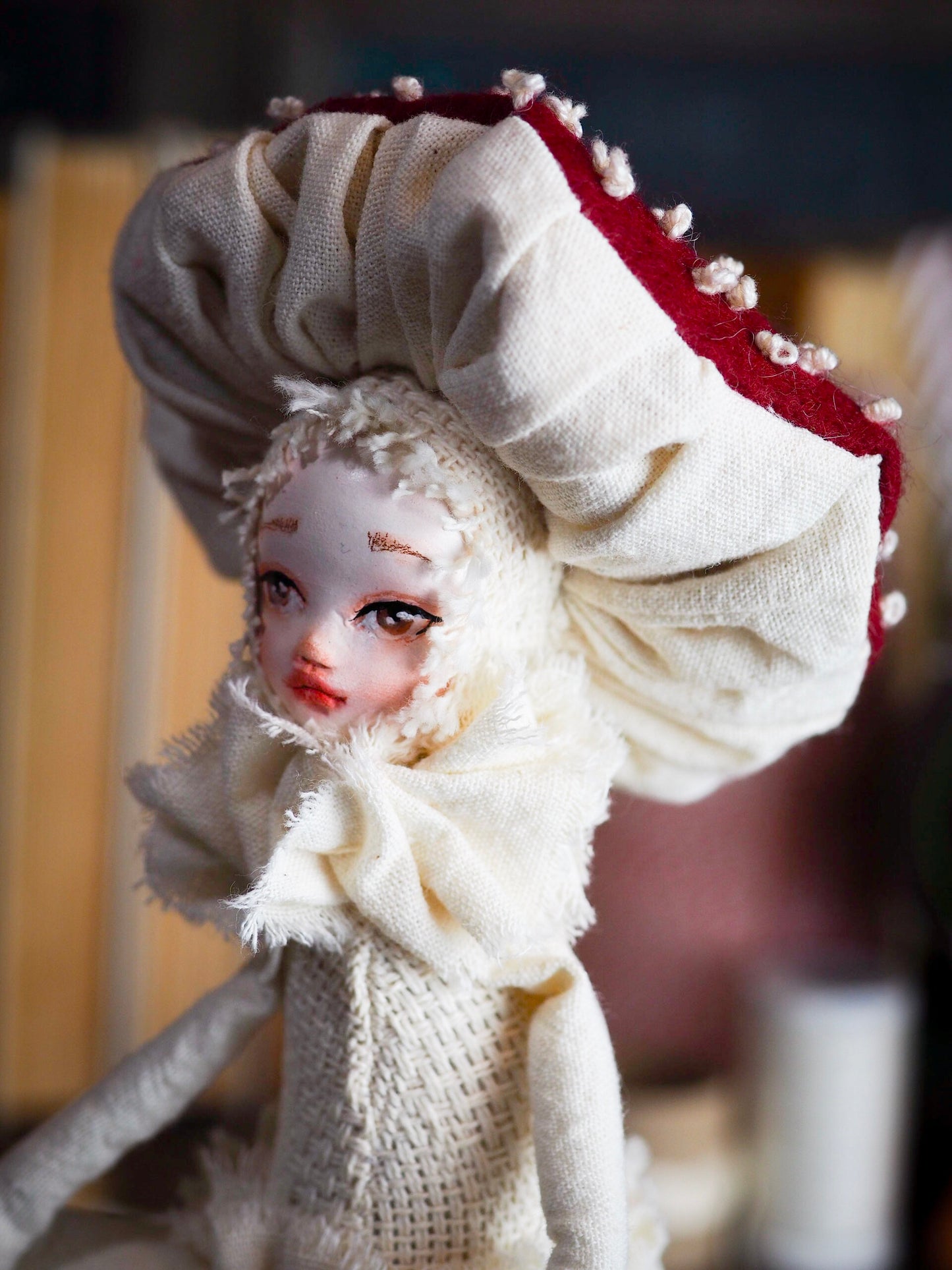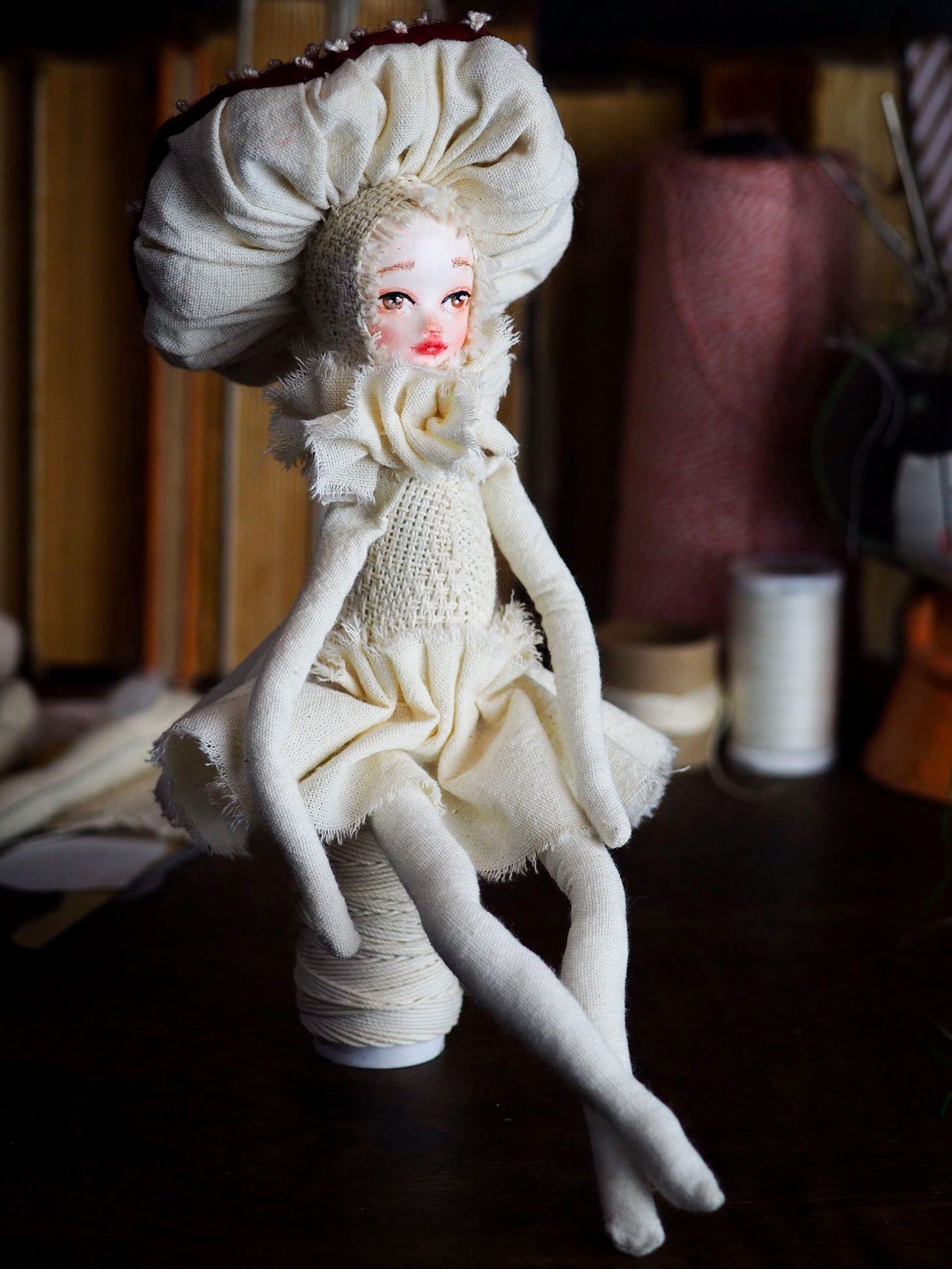 Their bodies are filled and shaped by hand, then sewn into a body that holds a beautiful air dry clay face, painted with my melancholic and mysterious eyes that you know so well, with a unique personality that makes each of them a unique piece of soft, huggable art.