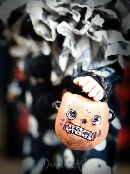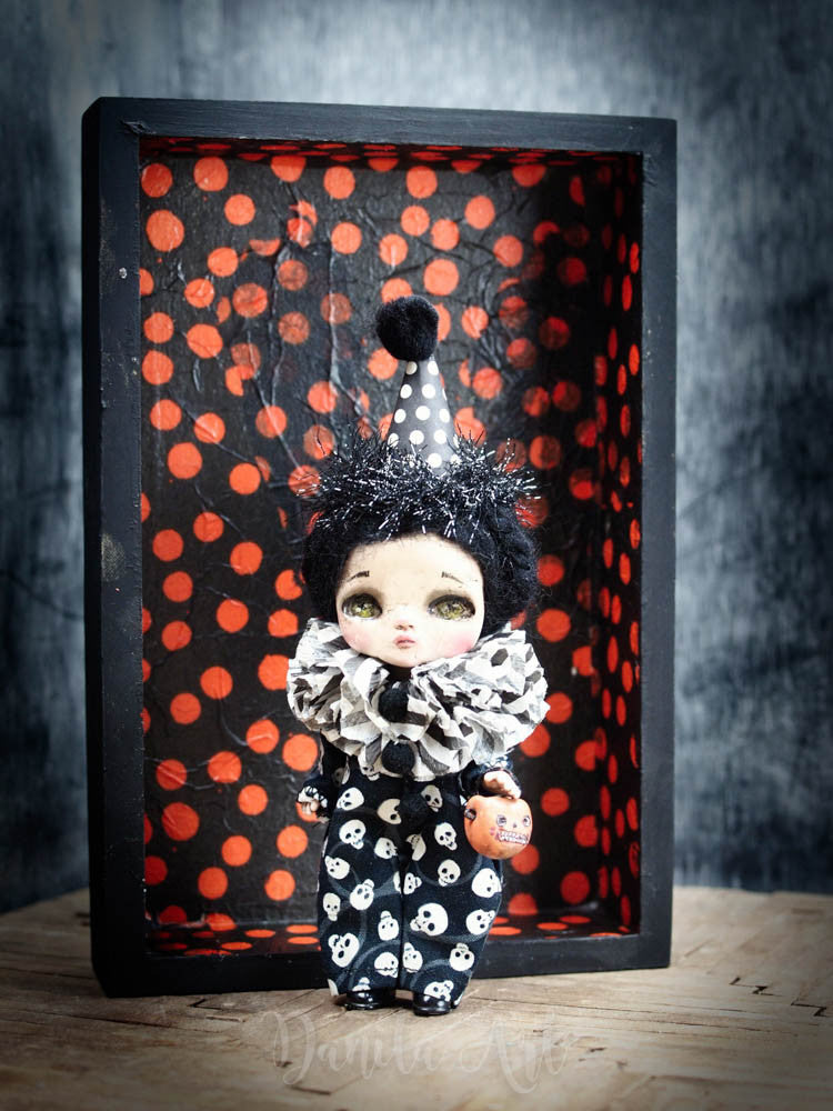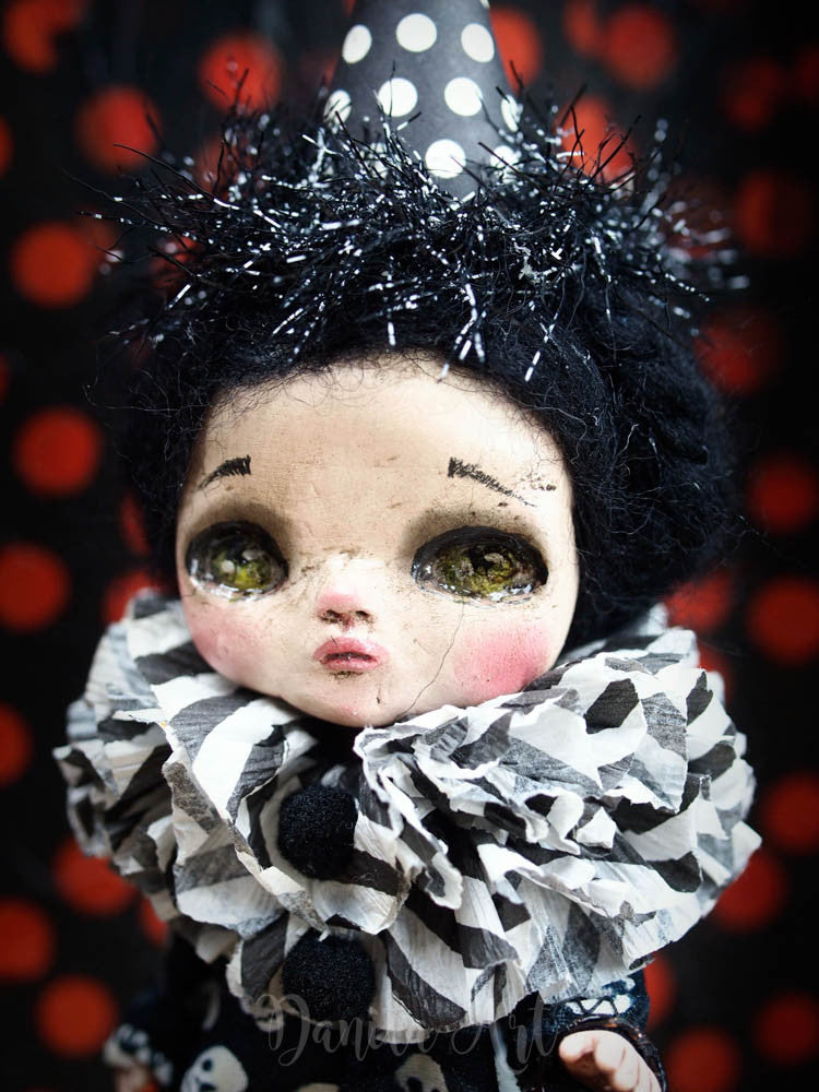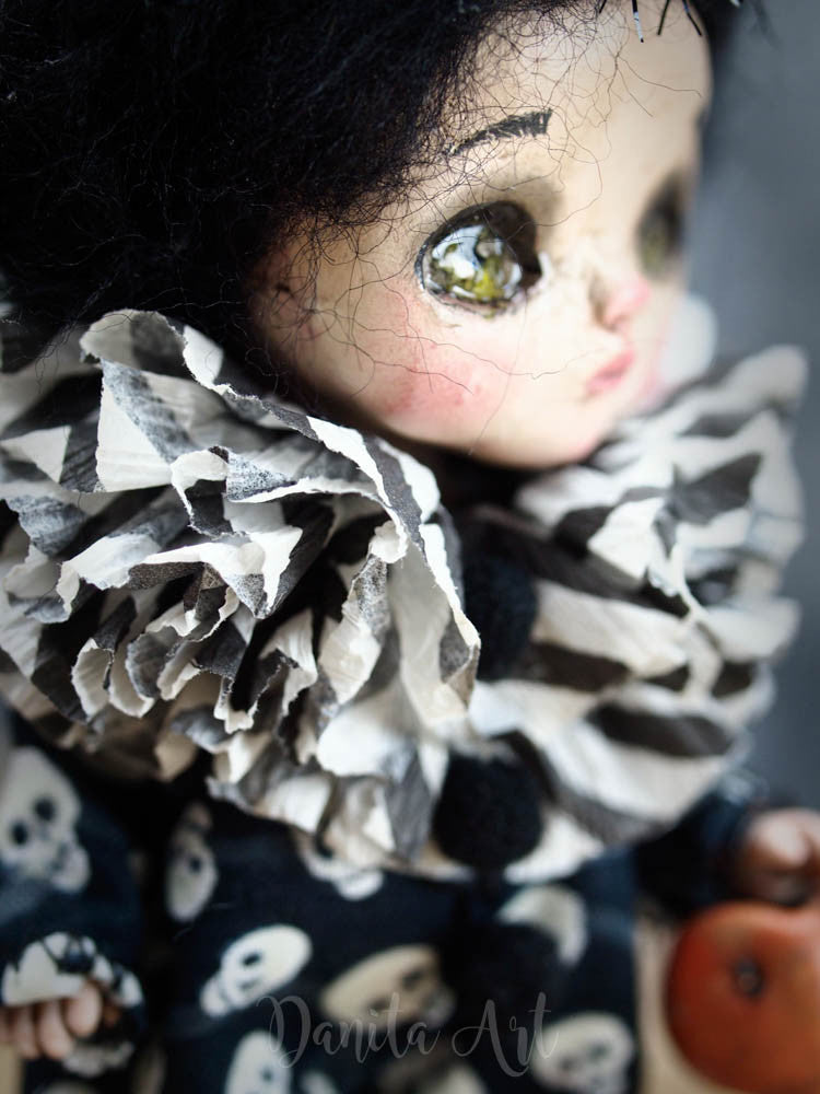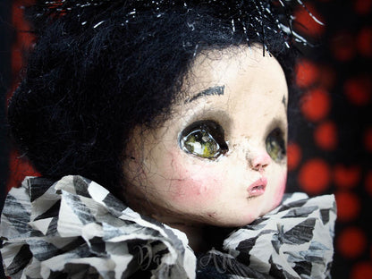 Danielle is a little witch girl with a paper clay sculpted head and a beautiful handmade, glow in the dark gown.