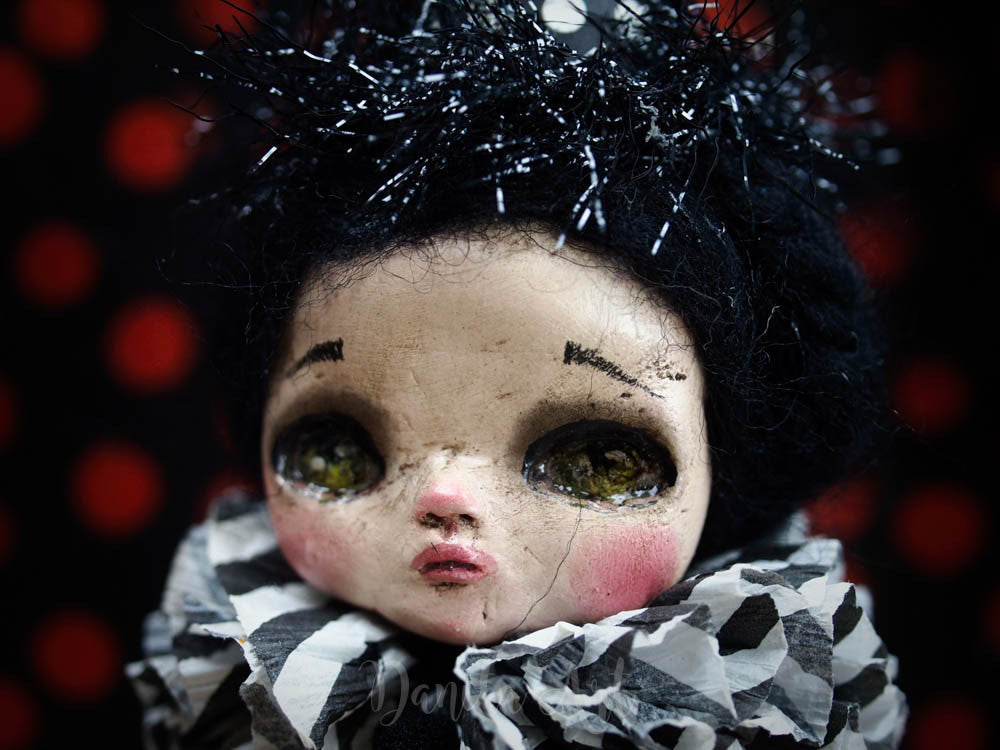 Her head is hand sculpted from a chink of paper clay by me, Danita Art. She has the most expressive and beautiful green eyes, they have a very special light to them that makes them look alive.