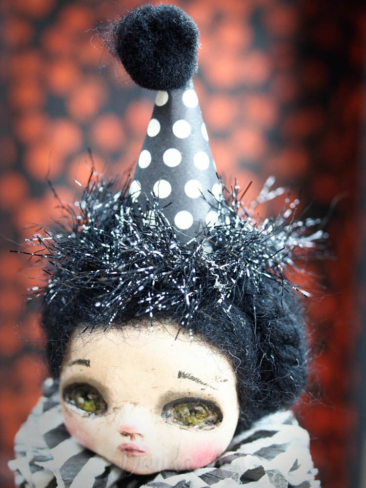 Her neck is adorned with black and white crepe paper ruffles, and her polka dot hat has a big fluffy pompom on top.