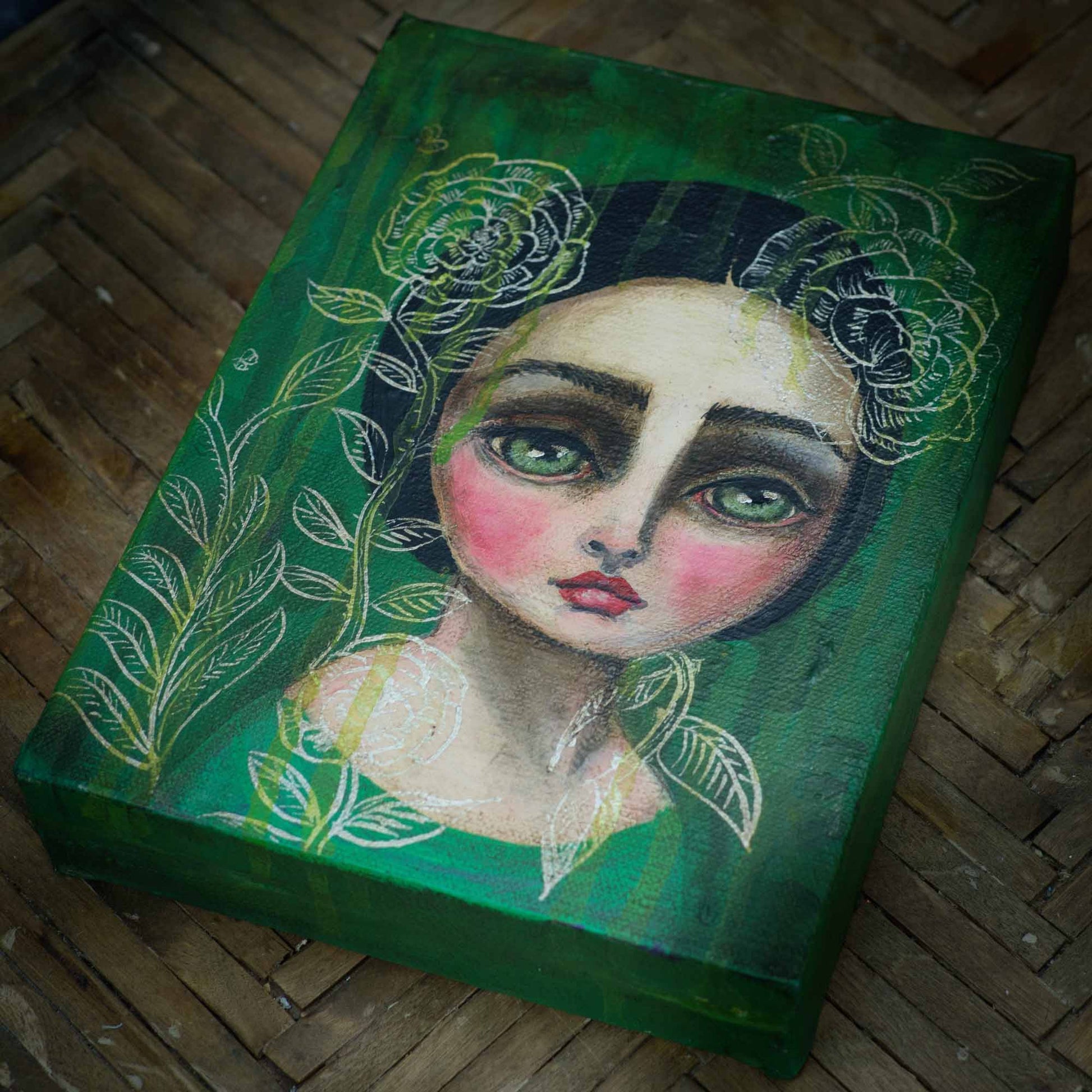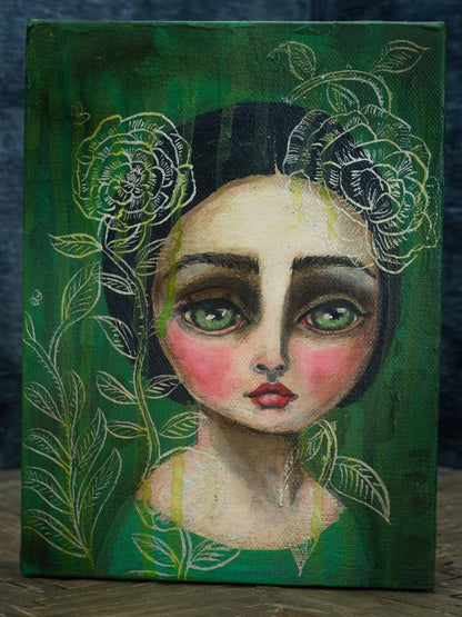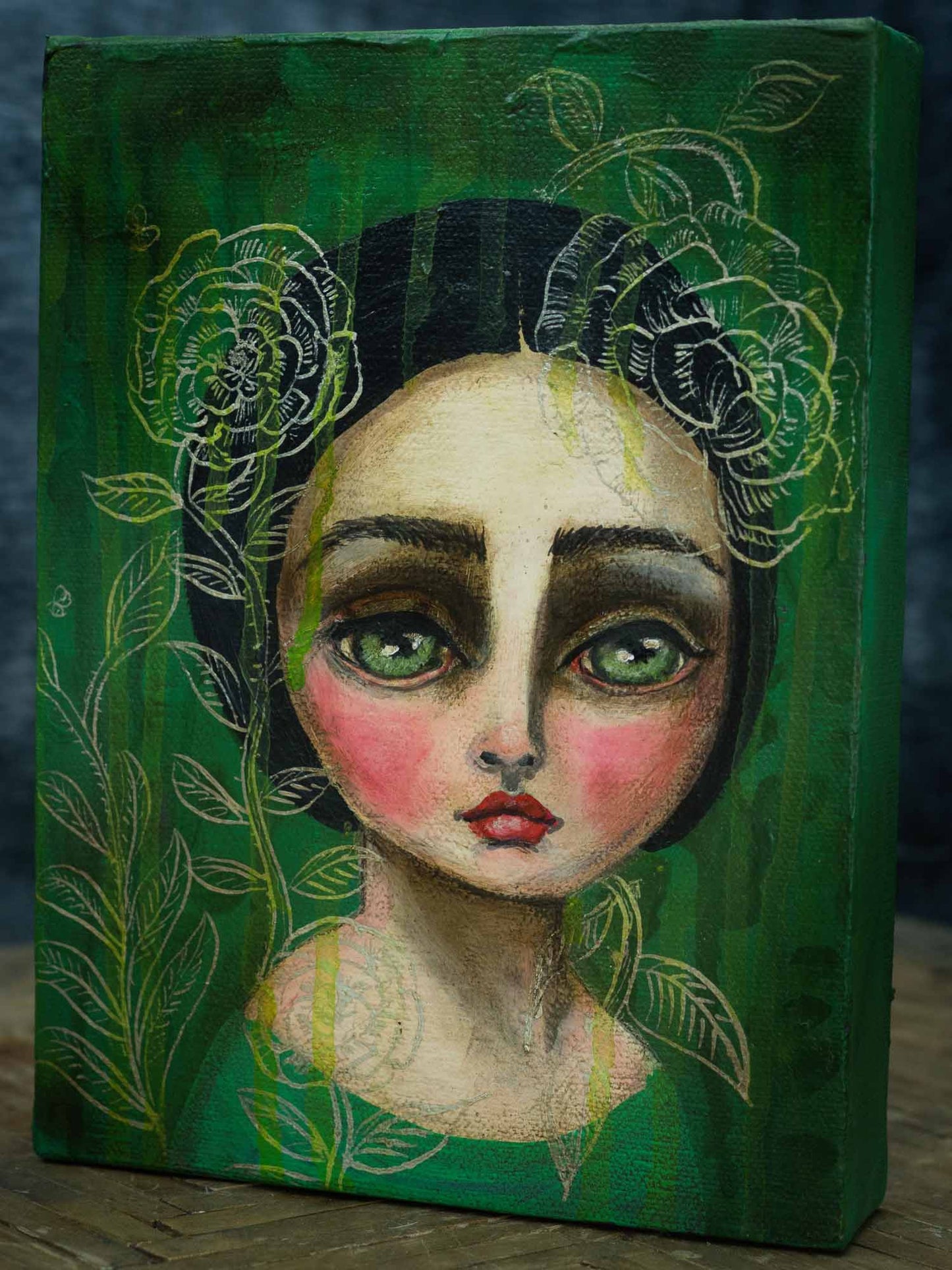 This portrait painting on canvas was created by me, Danita. Inspired by the organic forms of flowers and the beautiful green of foliage, I created a whimsical, yet surreal portrait of a girl with huge green eyes.