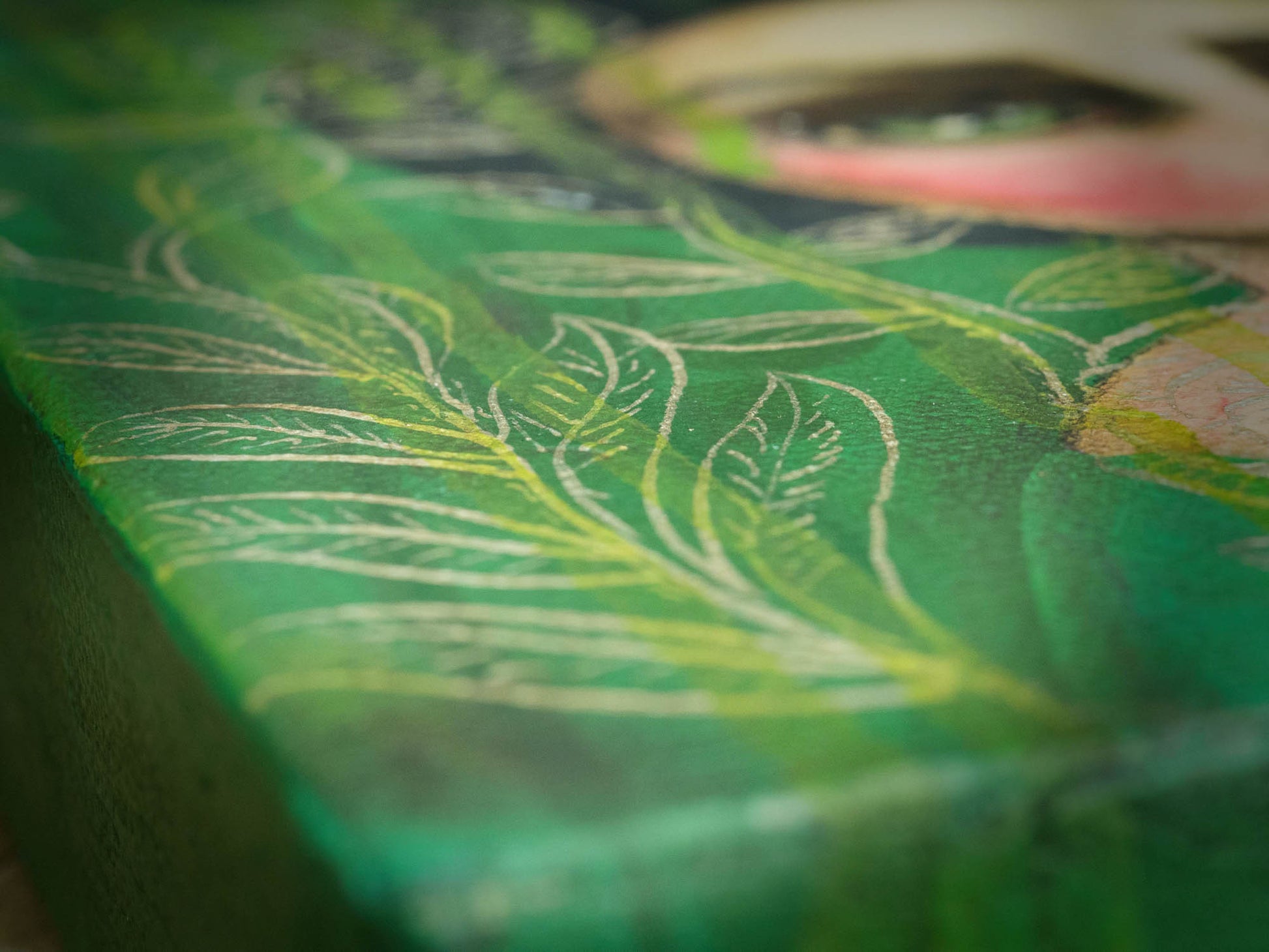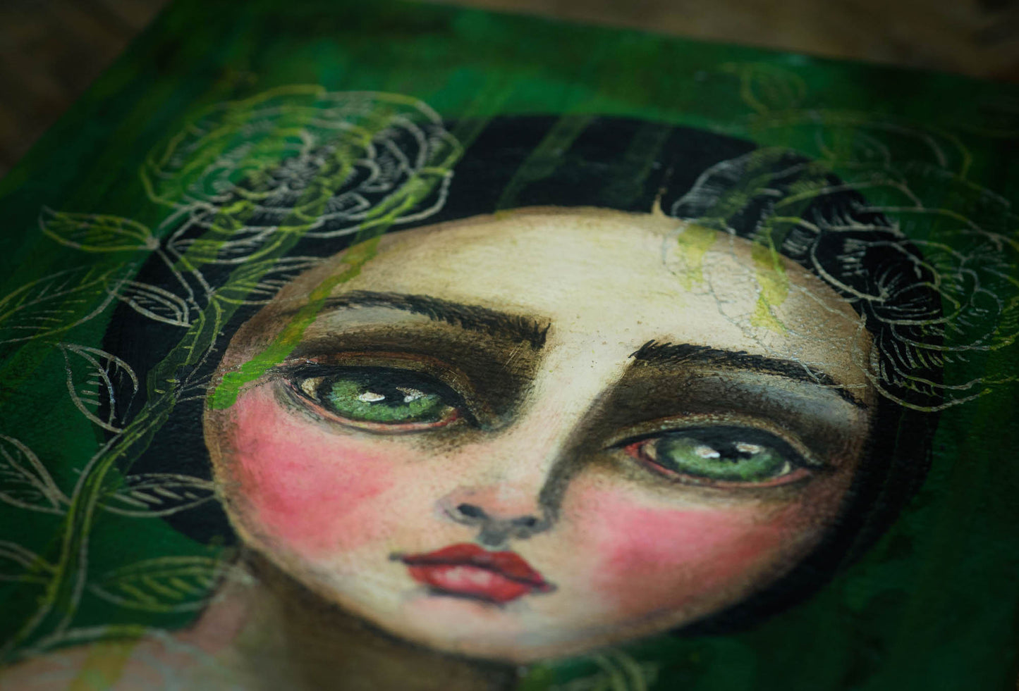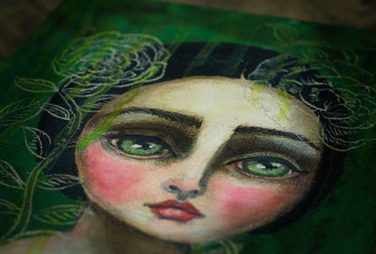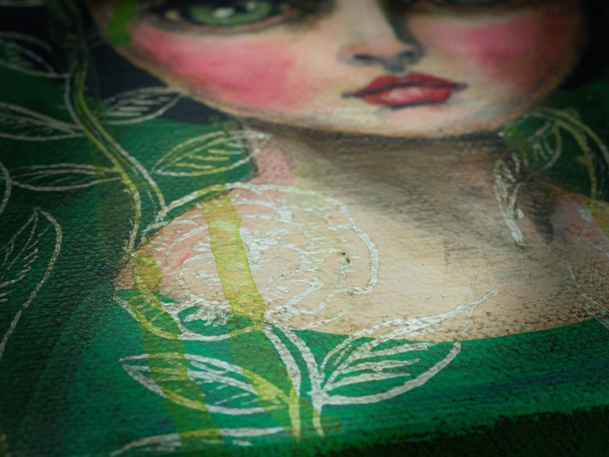 This portrait painting on canvas was created by me, Danita. Inspired by the organic forms of flowers and the beautiful green of foliage, I created a whimsical, yet surreal portrait of a girl with huge green eyes.