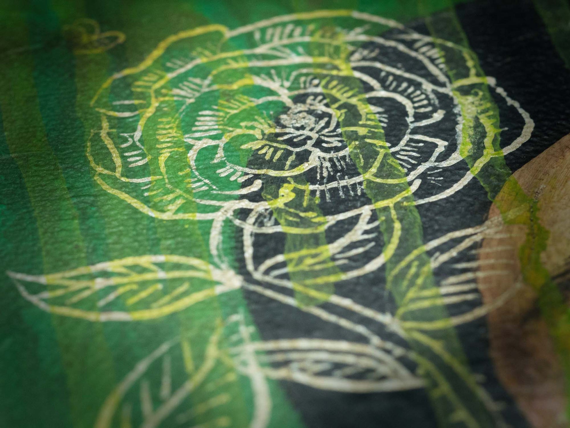 Peonies are Danita's favorite roses, and she decided to paint a girl with big, green eyes, and in the background in subtle tones, her favorite flowers.