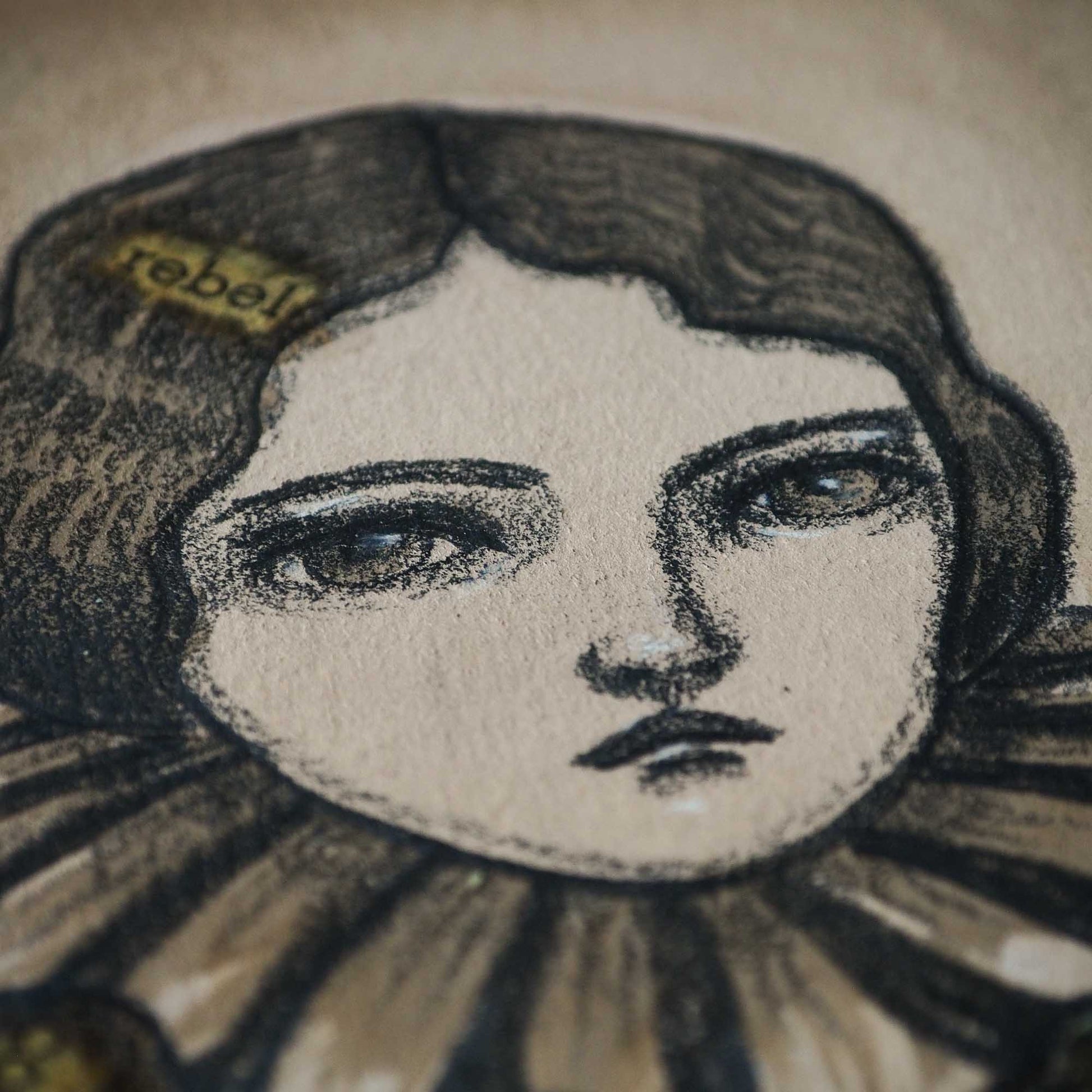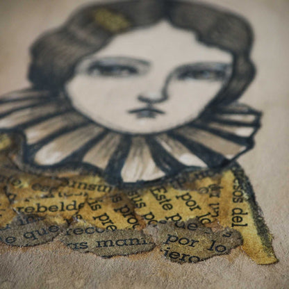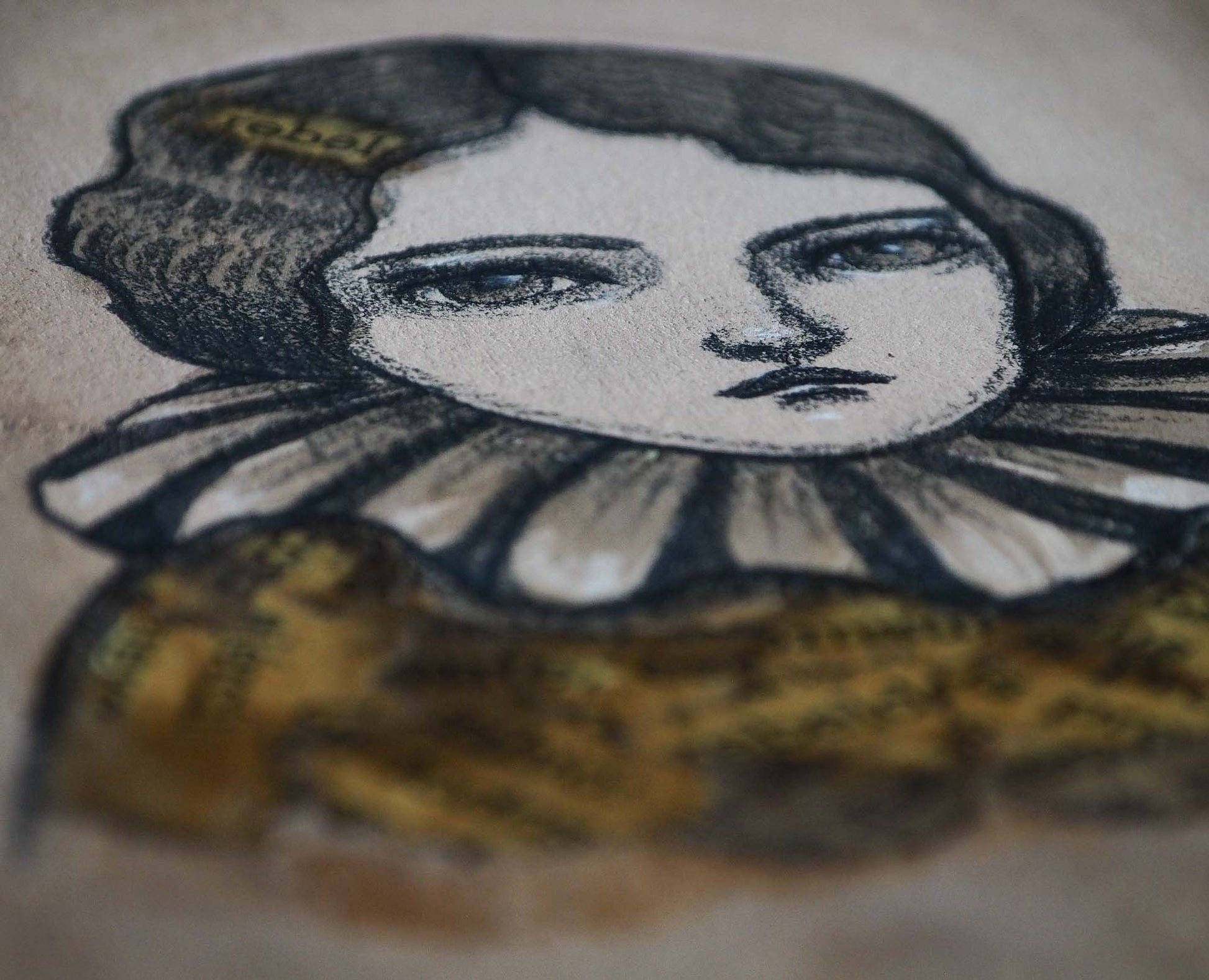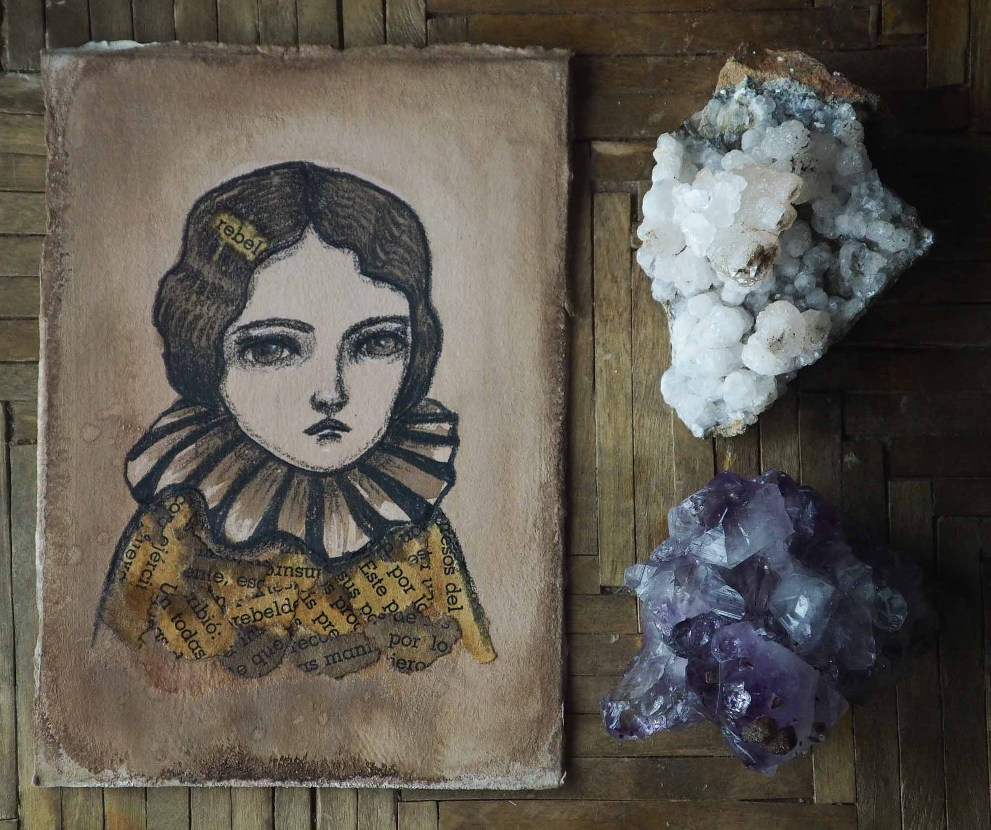 Experimenting is part of being a rebel, and this is how this mixed media drawing came to be. This girl is kind of a self portrait. My spirit is there. In her paper collage dress, made with pieces from a Mexican book from the 1930's. I am there in the dark pencil lines. In the watercolor background. Subtly, but I am there.
