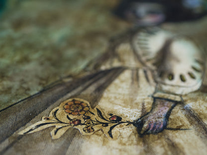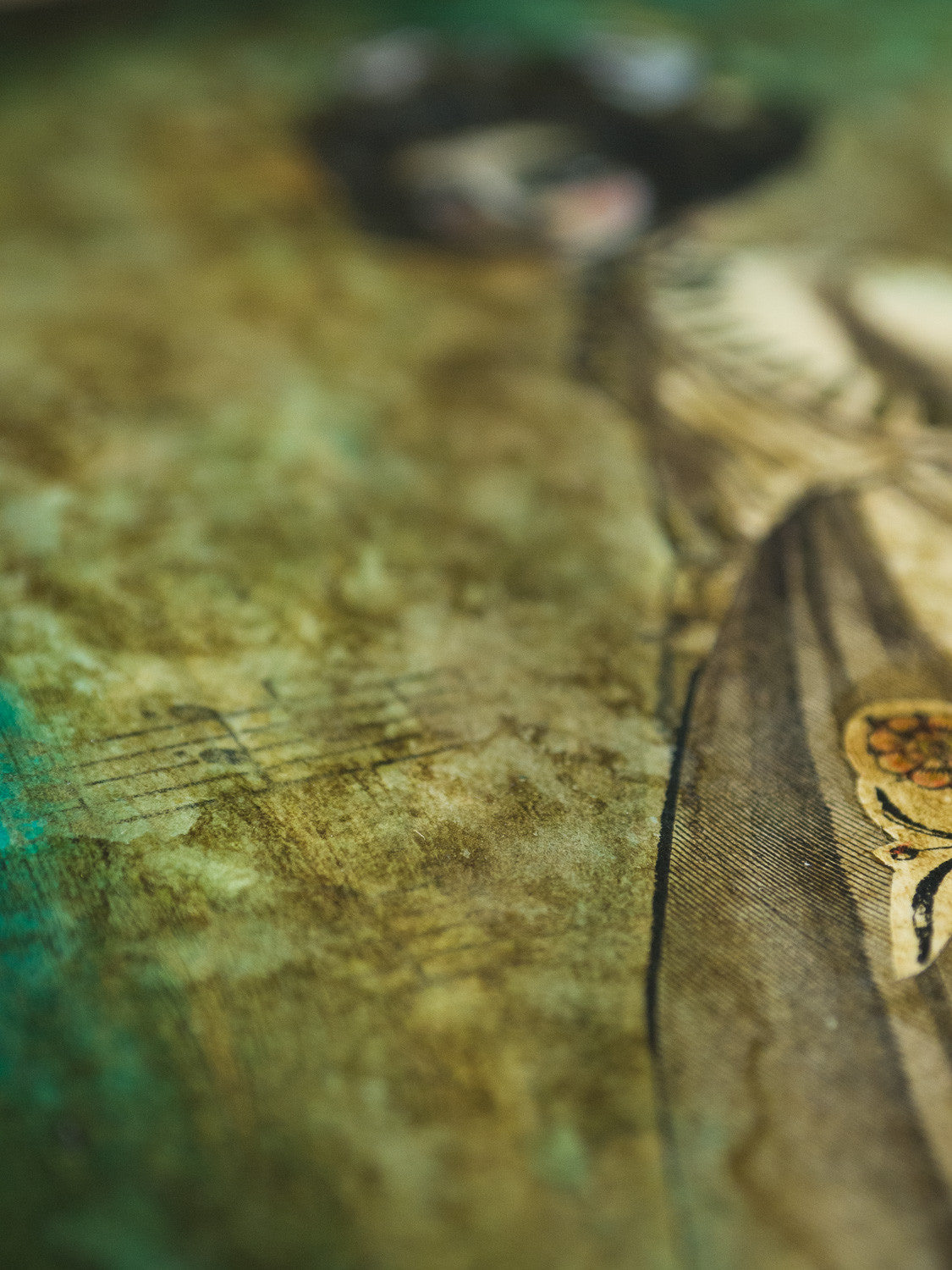 The Empress head is a drawing by me, as everything else around her. Using watercolors, inks, acrylics and pages from old books, I created a beautiful image. The Empress is royal, and the music of her theme is behind her. Vintage musical sheets were used as background.