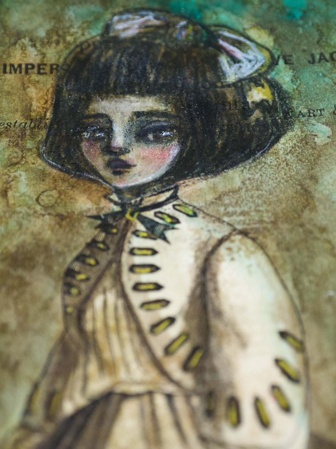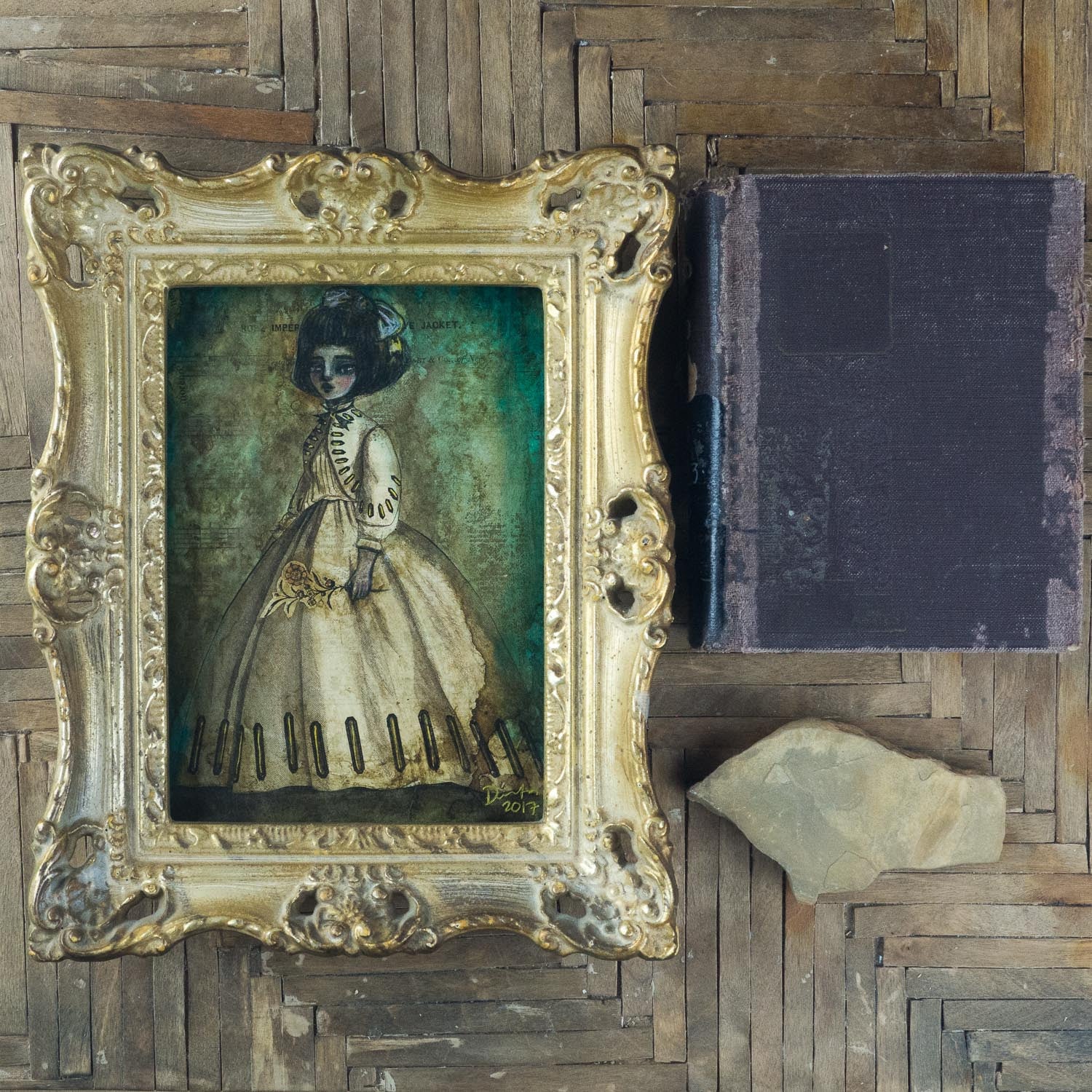I found a beautiful dress illustration on a very old book. I was definitively a beauty. I wanted it to be the base for a new painting. So I went ahead and collaged the illustration on one of my papers and started to work.