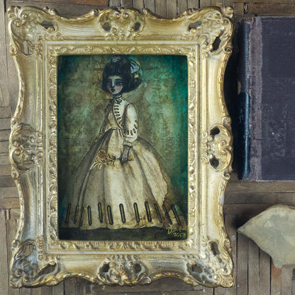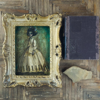 The painting measures 6 x 8 Inches, and arrives UNFRAMED. If you are interested in the frame I used for the photos, let me know! I'll be happy to sell it to you!