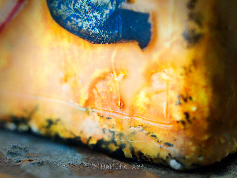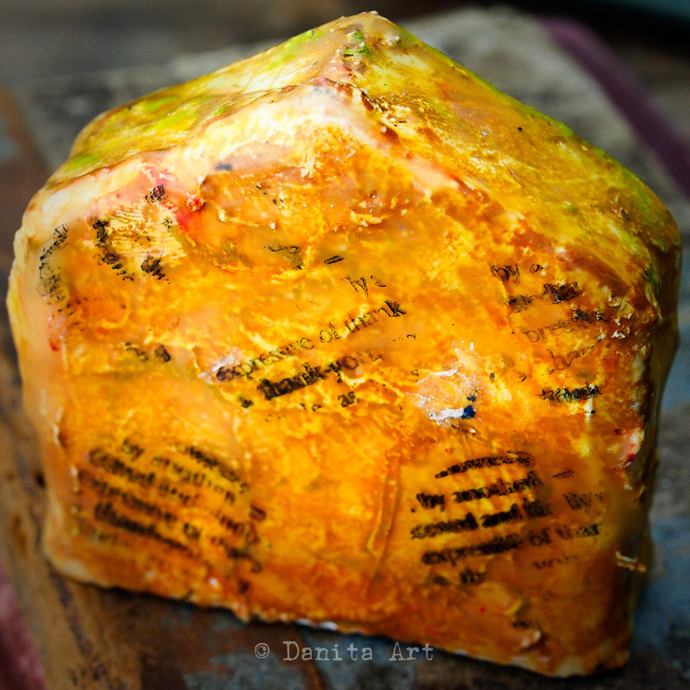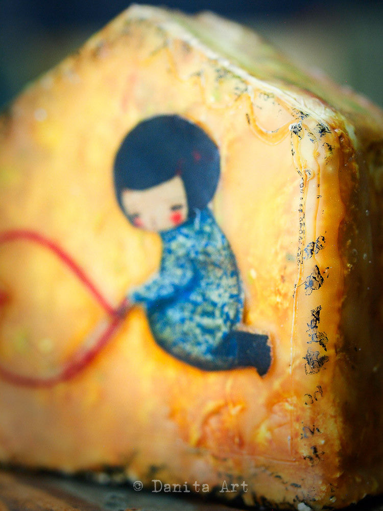 They feature a print of one of my favorite paintings, then I painted an abstract background with bright colors, and to finish everything I dipped them in beeswax and carved some drawings in them.