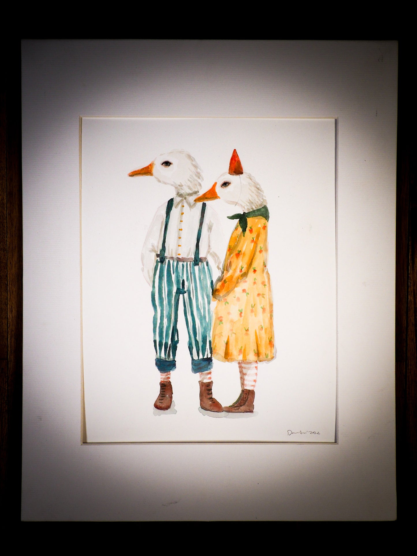 This is a beautiful watercolor painting with two human like ducks, wearing clothes and shoes, ready to take a stroll, hand by hand like two love doves.